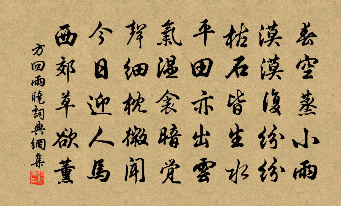 詩詞名句歷史字典書法欣賞書法字典國語詞典說文解字康熙字典古漢語字典標 題 作 者 詩 句 雨曉作者:方回 朝代:宋代雨曉原文春空蒸小雨,漠漠復紛紛。枯石皆生水,平田亦出雲。氣溫衾暗覺,聲細枕微聞。今日迎人馬,西郊草欲薰。詩詞問答問:雨曉的作者是誰?答:方回問:雨曉寫於哪個朝代?答:宋代方回雨曉書法欣賞雨曉書法作品詩詞推薦柳梢青(趙端禮生日)李彌遜〔宋代〕壽煙籠席。採蓮新按,舞腰無力。占盡風光,人間天上,今夕何夕。藍袍換了萊衣,慶歲歲、君恩屢錫。連夜歡聲和蒲大受王園泛舟用文老韻郭印〔宋代〕平生喜閒曠,夢想只山林。曲江理煙艇,魚鳥皆知音。晴天亂鳧鶩,相呼時一沉。油然淵中鱗,潛伏恐不深。玉漏遲 七夕行台諸公見餞 讀畫齋叢書本滕賓〔元代〕問誰爭乞巧。誰知巧處成煩惱。天上佳期,底事別多歡少。雨夢雲情半餉,又早被西風吹曉。愁未了。星橋隔斷,依韻和蒲誠之春日即事文同〔宋代〕輕煙漠漠雨斜斜,無事常教放兩衙。問客江邊求好古,倩人山里覓奇花。新蔬宛宛生晴圃,淺溜涓涓出暖沙。入夏春宴河亭劉兼〔唐代〕柳擺輕絲拂嫩黃,檻前流水滿池塘。一筵金翠臨芳岸,四面煙花出粉牆。舞袖逐風翻繡浪,歌塵隨燕下雕梁。蠻箋宜晚小酌二首陳著〔宋代〕濁酒三杯三代醇,中閒滋味是人倫。世人毫末成胡越,要看家風我姓陳。問鶴張鎡〔宋代〕鶴也來多日,今朝認筍輿。繖斜聊引避,路轉亦前驅。俗遠眼寧白,年初頂漸朱。古囊能背否,勝用小奚奴。送許拾遺還京劉長卿〔唐代〕萬里辭三殿,金陵到舊居。文星出西掖,卿月在南徐。故里驚朝服,高堂捧詔書。暫容乘駟馬,誰許戀鱸魚。常山道中陳文蔚〔宋代〕路勢弓腰轉,湖光鑒面開。稻田春事給,村碓晚舂催。問宿尚十里,與誰同一杯。自憐今日首,頻作望鄉回。送徐照還舊山徐璣〔宋代〕役役勞形器,乾坤一轉蓬。暗因凡慮汩,明為此心空。小舍依沙渚,扁舟擊荻業。且能漁釣樂,亦似古人風。望江南張繼先〔宋代〕西源好,冬日雪中松。攜手石壇承愛景,靜觀天地入清宮。恰似大茅峰。襟袂冷,琴里意濃濃。吹月洞簫含碧玉,湖州歌九十八首 其四十一汪元量〔宋代〕可憐河畔草青青,錦纜牽江且緩行。愛此淮南山水好,問天乞得片時晴。送薛水部十丈通判并州司馬光〔宋代〕十萬貔貅士,旌旗晉水陽。元戎倚耆碩,別乘選才良。秀直寒松節,精明利劍芒。知君留滯久,從此欲騰驤。八聲甘州葉夢得〔宋代〕問浮家泛宅,自玄真、去後有誰來。漫煙波千頃,雲峰倒影,空翠成堆。可是溪山無主,佳處卻徘徊。暮雨卷晴野宮人冢杜牧〔唐代〕儘是離宮院中女,苑牆城外冢累累。少年入內教歌舞,不識君王到老時。贈雷僧晁說之〔宋代〕東奔西走肯徘徊,言語相殘聽鼻雷。未料此生終作底,可知不為學詩來。偈頌一百六十首釋宗杲〔宋代〕徑山無寸土莊田,今夏隨宜結眾緣。慵論道,嫩談禪,拄杖桃來個個圓。不用息心除妄想。大家吃飯了瞳眠。奉和聖制幸韋嗣立山莊劉憲〔唐代〕非吏非隱晉尚書,一丘一壑降乘輿。天藻緣情兩曜合,山卮獻壽萬年餘。浣溪沙張曙〔唐代〕枕障熏爐隔繡帷,二年終日苦相思,杏花明月始應知。天上人間何處去,舊歡新夢覺來時,黃昏微雨畫簾垂。玉堂早起樓鑰〔宋代〕早起多奔走,旬休亦往還。偶因二士試,始得一朝閒。靈鵲花枝上,金魚荇蔕間。素餐終有媿,只憶舊家山。名句推薦若問相思甚了期,除非相見時。晏幾道《長相思·長相思》 參軍春思亂如雲,白髮題詩愁送春歐陽修《春日西湖寄謝法曹歌》 蒼旻霽涼雨,石路無飛塵。岑參《暮秋山行》 風也蕭蕭,雨也蕭蕭,瘦盡燈花又一宵。納蘭性德《採桑子·誰翻樂府淒涼曲》 離愁不管人飄泊。年年孤負黃花約。黃機《憶秦娥·秋蕭索》 臣強則死,念妄則亡。來俊臣《羅織經·事上卷第二》 昔嘆當年無李牧,今知江左有夷吾陳亮《送文子轉漕江東二首》 欲潔何曾潔,雲空未必空。可憐金玉質,終陷淖泥中。曹雪芹《紅樓夢·第五回》 秋風起兮白雲飛,草木黃落兮雁南歸。劉徹《秋風辭》 燕子飛時,綠水人家繞。枝上柳綿吹又少。蘇軾《蝶戀花·春景》