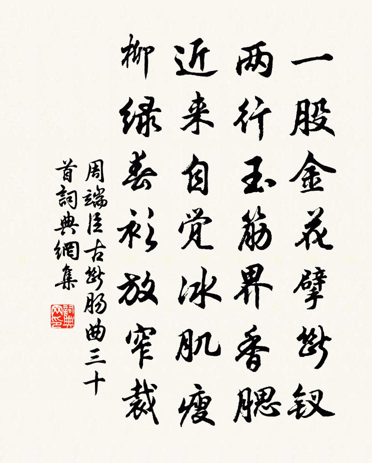 詩詞名句歷史字典書法欣賞書法字典國語詞典說文解字康熙字典古漢語字典標 題 作 者 詩 句 古斷腸曲三十首作者:周端臣 朝代:宋代古斷腸曲三十首原文一股金花擘斷釵,兩行玉筋界香腮。近來自覺冰肌瘦,柳綠春衫放窄裁。詩詞問答問:古斷腸曲三十首的作者是誰?答:周端臣問:古斷腸曲三十首寫於哪個朝代?答:宋代周端臣古斷腸曲三十首書法欣賞古斷腸曲三十首書法作品詩詞推薦送邵州林使君朱慶餘〔唐代〕軒車此去也逢時,地近湘南頗入詩。一月計程那是遠,中年出守未為遲。水邊花氣熏章服,嶺上嵐光照畫旗。想得題括蒼馮公嶺二首曹豳〔宋代〕平蕪千里綠迢迢,水宿山行好耐勞。最是愁人最奇崛,馮公之巘浙江潮。用佚老園叟韻簡直孺並寄園叟方岳〔宋代〕趙君規模要名世,徐君人物南州稚。欲攜老硯共硯冰,梅花不許山礬弟。今年識徐如識春,未識佚老園中人。似聞次韻虞永康廬居生芝魏了翁〔宋代〕河南富貴花,人與譜姓氏。惟茲三秀者,不譜亦名世。肖形草木均,出處哲人似。無然而致之,朝菌何異此。廣陵用山谷新詩徒拜嘉之句為韻賦五篇報尹直卿曾豐〔宋代〕吾土歐陽公,一代不數人。文星蜚上天,山川效其珍。劉郭相望同,才藻豈不新。所恨狃時態,未躡公後塵。題傅侍郎寒碧十五韻觀魚陳宓〔宋代〕燕忙將水撇,魚樂欲空跳。此意誰能會,光陰靜里消。憶江南許棠〔唐代〕南楚西秦遠,名遲別歲深。欲歸難遂去,閒憶自成吟。雷電閒傾雨,猿猱斗墮林。眠雲機尚在,未忍負初心。踏莎行 別道友游白鹿觀王哲〔元代〕要吹燈,中有作。離暫別休疑卻。游白鹿觀頭看,前便是成行腳。要歸來,霄為約。絲不斷真嬉謔。誠語朴決重歡京城雜詠歐陽系〔元代〕奉詔修書白玉堂,朝朝騎馬傍宮牆。閘河東畔垂楊柳,時有鶯聲似故鄉。頌古二十七首釋雲賁〔宋代〕黃鶴樓前題一篇,無限措大失平仄。長沙一隻眼長長,今古何曾有蹤跡。有感陳普〔宋代〕益州桑柘雨,莘野稻梁秋。功業髯秋兔,行藏汗萬牛。剛叔以雅言題拙稿輒依韻和酬強至〔宋代〕每恨塵勞荒舊學,更慚篆刻得初名。聖賢閫奧期深入,風雅源流庶一清。短技示人方蓄縮,雄篇鏖我太崢嶸。君詩書事十首劉克莊〔宋代〕幼作淳熙版籍民,老逢景定改元新。殘年且盡杯中物,他日誰澆柏下人。長鑱谷中忙斸雪,小車花外遍尋春。吾評和關子東筇杖王之望〔宋代〕老境生涯正倚君,周旋夷險共悲欣。最憐磊磊多高節,未肯斑斑出異文。漢閣燈來徒照夜,葛陂龍去謾拿雲。願為彭城雜詠薩都剌〔元代〕雪白楊花撲馬頭,行人春盡過徐州。夜深一片城頭月,曾照張家燕子樓。和士特栽果十首棖劉子翬〔宋代〕棖橘甘酸各效能,南苞錫貢不同升。果中亦抱遺才嘆,有客攀條氣拂膺。韓木陳知柔〔宋代〕層江波靜鱷如掃,一畝寒陰禽自呼。莫把甘棠比韓木,令人灑涕共長吁。讀楊蟠章安集歐陽修〔宋代〕蘇梅久作黃泉客,我亦今為白髮翁。臥讀楊蟠一千首,乞渠秋月與春風。謝素師惠二石馮時行〔宋代〕素師為我良古僻,野性乖疏無與適。呼門投我清淨友,翻是巴江兩好石。一石形作巢蓮龜,近人團圓生素跡。皎如觀獵騎(一作公子行)司空曙〔唐代〕纏臂繡綸巾,貂裘窄稱身。射禽風助箭,走馬雪翻塵。金埒爭開道,香車為駐輪。翩翩不知處,傳是霍家親。名句推薦掩淚空相向,風塵何處期盧綸《李端公/送李端》 玉階空佇立,宿鳥歸飛急。李白《菩薩蠻·平林漠漠煙如織》 天涯倦客,山中歸路,望斷故園心眼。蘇軾《永遇樂·彭城夜宿燕子樓》 清明又近也,卻天涯為客。曹組《憶少年·年時酒伴》 關山別盪子,風月守空閨。薛道衡《昔昔鹽》 奔車之上無仲尼,覆舟之下無伯夷。韓非及後人《韓非子·安危》 筆落驚風雨,詩成泣鬼神杜甫《寄李十二白二十韻》 琴里知聞唯淥水,茶中故舊是蒙山。白居易《琴茶》 一聲梧葉一聲秋,一點芭蕉一點愁,三更歸夢三更後。徐再思《水仙子·夜雨》 念故人,千里至此共明月。寇準《踏莎行·寒草煙光闊》