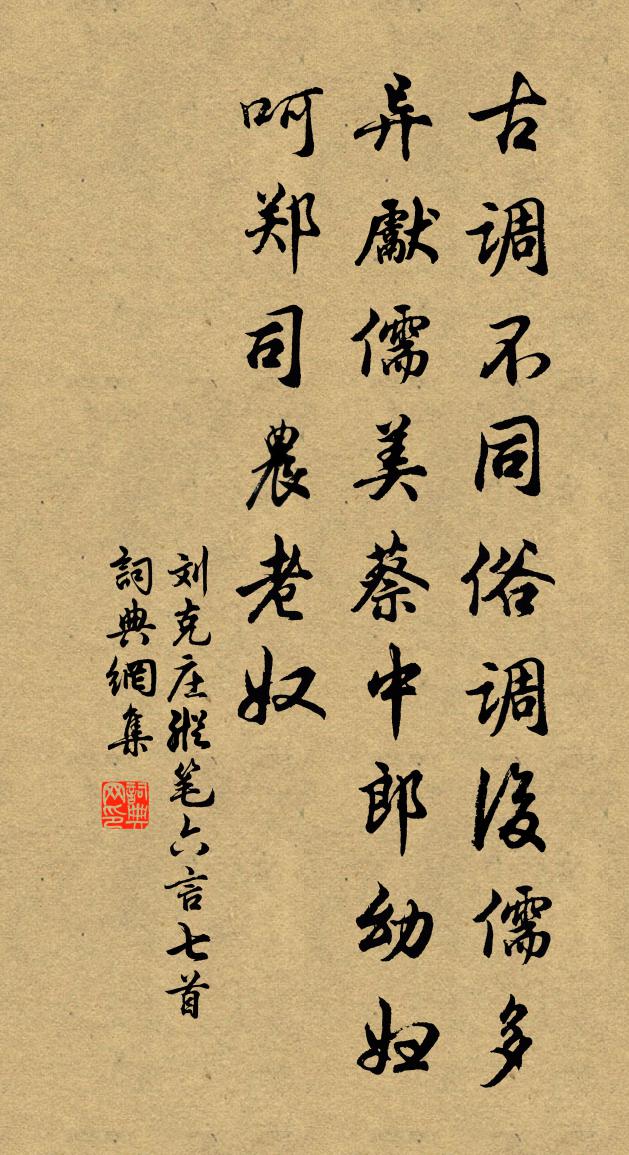 詩詞名句歷史字典書法欣賞書法字典國語詞典說文解字康熙字典古漢語字典標 題 作 者 詩 句 縱筆六言七首作者:劉克莊 朝代:宋代縱筆六言七首原文古調不同俗調,後儒多異先儒。美蔡中郎幼婦,呵鄭司農老奴。詩詞問答問:縱筆六言七首的作者是誰?答:劉克莊問:縱筆六言七首寫於哪個朝代?答:宋代問:劉克莊的名句有哪些?答:劉克莊名句大全劉克莊縱筆六言七首書法欣賞縱筆六言七首書法作品詩詞推薦贈顏文昺子明用孫從之韻趙蕃〔宋代〕微風醒蝶夢,驟雨瀉天瓢。剝啄攜詩過,丁寧寄語邀。詞臣上雍橐,勛閥侍中貂。試問龜藏櫝,何如鶴唳宵。和祖無擇九日登袁州宜春台羅誘〔宋代〕九日經年一再來,不妨吏隱遣懷開。時豐訟少欣多暇,秋晚花黃儘任催。幸遇登高賢燕樂,喜容落帽客追陪。預愁宮詞王珪〔唐代〕簾搖翡翠金風晚,瓦濕鴛鴦玉露天。秋殿曉開重九宴,內人爭貼菊花鈿。偈頌七十六首釋師觀〔宋代〕今日十,昨日姨。日來日往,阿誰知有。未了之人聽一言,只這而今誰動口。和梁轉運判官韻袁說友〔宋代〕古括人豪醉墨鮮,一樽寧怯酒如船。新詩磊磊珠璣落,不記梅花在眼前。送公實兄赴省試李若水〔宋代〕吾君邁周王,於今盛文化。學郎紛萬輩,戰藝雙闕下。公乎筆如椽,風雨供飛灑。燕楚何足吞,此行定應霸。三世送范西叔教授西歸張栻〔宋代〕乃祖至和間,忠謀書鼎彝。但知陛下聖,豈知吾言危。元佑愛君語,讀者猶涕洟。典刑今不亡,盛德故在茲。歲晚絕句張翬〔唐代〕茫茫煙水上,日暮陰雲飛。孤坐正愁緒,湖南誰搗衣。昔柳柳州作永州山水諸記泉石之狀如在目前茲張嵲〔宋代〕山磎犖确冒荒筠,石溜涓涓盡日聞。微水寒來渾見底,峽山雪後欲侵雲。深溪春動梅爭發,絕壑林高日易曛。應似大雪中李提舉惠玻璃泉兩榼二首張耒〔宋代〕峰高凍雪埋蒼玉,河靜黃沙咽濁流。嗟我殘年為遠客,煩君雙榼散羇愁。屠蘇御歲將傳盞,彩勝宜春欲插頭。痛飲頌一百則釋重顯〔宋代〕祖域交馳天馬駒,化門舒捲不同途。電光石火存機變,堪笑人來捋虎鬚。惱公李賀〔唐代〕宋玉愁空斷,嬌饒粉自紅。歌聲春草露,門掩杏花叢。注口櫻桃小,添眉桂葉濃。曉奩妝秀靨,夜帳減香筒。鈿鏡減字木蘭花(以下竹齋侑酒辭)沈瀛〔宋代〕竹齋陋止。坐客無氈為客喜。壁不遮風。八達門窗更四通。鄰家覓酒。赤腳扶翁翁老壽。子曰其何。除卻渠儂沒事武夷一曲陳普〔宋代〕虹橋一斷幾午齡,親手文公再造成。何事遊人尚迷路,亂尋無楫渡船撐。陽羅磯孔武仲〔宋代〕石壯山獰不可乾,傾江波浪作驚湍。殘霞一抹吳天晚,正苦扁舟不上灘。大風懷林柏農敖陶孫〔宋代〕江湖易高風,六月寒(外疒內辛)(外疒內辛)。中宵會急雨,涼意到衾枕。顛披蒲葦亂,抑壓烏鳶噤。禾頭欲生親舊問盜作詩四十韻以答之說要備野史之錄五邁〔宋代〕我來自京師,已醜之十月。道之建劍間,行行遇兵卒。問之何為行,對言聲哽咽。初只因臨汀,監商時出沒。縣官偈頌九十三首釋梵琮〔宋代〕根從江西來,還向江西爇一笑掀天只自知,天上拈來成漏泄。九日與數客登善福院之絕頂晚飲茗飲閣予以病朱槔〔宋代〕風日迫佳節,一川秋意昏。臨高分石磴,卻立數煙村。楚制隨雲物,蠻花照酒痕。龍山嗟未久,藍水想空存。鴻雁南園試小樂白居易〔唐代〕小園斑駁花初發,新樂錚摐教欲成。紅萼紫房皆手植,蒼頭碧玉盡家生。高調管色吹銀字,慢拽歌詞唱渭城。不飲名句推薦海闊山遙,未知何處是瀟湘柳永《玉蝴蝶·望處雨收雲斷》 鼙鼓動時雷隱隱,獸頭凌處雪微微。盧肇《競渡詩 / 及第後江寧觀競渡寄袁州剌史成應元》 況屈指中秋,十分好月,不照人圓。辛棄疾《木蘭花慢·滁州送范倅》 倍道而妄行,則天不能使之吉。荀子《荀子·天論》 爭奈醒來,愁恨又依然朱淑真《江城子·賞春》 敗垣芳草,空廊落葉,深砌蒼苔。徐再思《人月圓·甘露懷古》 露葉翻風驚鵲墜。暗落青林紅子。陳師道《清平樂·秋光燭地》 窮巷多怪,曲學多辯。愚者之笑,智者哀焉;狂夫之樂,賢者喪焉。商鞅《商君書·更法》 塞馬一聲嘶,殘星拂大旗。納蘭性德《菩薩蠻·朔風吹散三更雪》 河海不擇細流,故能就其深;李斯《諫逐客書》