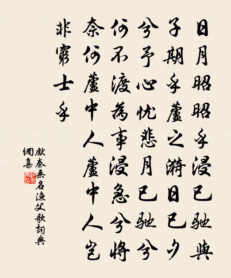 詩詞名句歷史字典書法欣賞書法字典國語詞典說文解字康熙字典古漢語字典標 題 作 者 詩 句 漁父歌作者:先秦無名 朝代:先秦漁父歌原文日月昭昭乎浸已馳。與子期乎蘆之漪。日已夕兮予心憂悲。月已馳兮何不渡為。事浸急兮將奈何。蘆中人。蘆中人。豈非窮士乎。詩詞問答問:漁父歌的作者是誰?答:先秦無名問:漁父歌寫於哪個朝代?答:先秦問:漁父歌是什麼體裁?答:樂府先秦無名漁父歌書法欣賞漁父歌書法作品詩詞推薦句馮去辯〔宋代〕饢事十年當結局,襟期千古舉同牢。江行寫望賀鑄〔宋代〕斜照侵疏箔,微涼逗小窗。青蒲故依渚,白鳥屢橫江。遣興詩三百,煎愁櫓一雙。前舟定未遠,疊鼓聽逢逢。巫山一段雲·春去秋來也歐陽炯〔五代〕春去秋來也,愁心似醉醺。去時邀約早回輪,及去又何曾。歌扇花光黦,衣珠滴淚新。恨身翻不作車塵,萬里得隨紙鳶顧逢〔宋代〕只是憑風力,飛騰自不知。轉來高處去,肯顧此身危。雲外搖雙翼,空中寄一絲。每愁吹斷後,欲覓意何之。朝丹霞高似孫〔宋代〕井有波兮通滄溟,玉抱德兮誰能銘。怛來歸兮析然醒,道有成兮其當升。送同少野赴華藏寺二首陳著〔宋代〕絮帽蒙頭太白峰,忽然霹靂起虛空。遁庵強出本心退,荼毒高遷好樣同。南北雲山十年夢,東西浙水一家風。無邊對酒次韻寄懷元翁黃庭堅〔宋代〕花光漸寒食,木燧催國火。沽酒鳥勸人,懷賢吾忘我。事往墮甑休,心知求田可。可人不在眼,樽俎思促坐。有生自禮賢還鵝湖望山頂飛流有作二首張嵲〔宋代〕農夫秧稻滿畦水,行客跨騾無樹陂。熱風吹面日方午,忽見綠岩冰柱垂。仲和親迎慈谿葛紹體〔宋代〕燈火宗盟舊日尋,宜家宜室正如今。春風苹藻慈湖上,琴瑟新調太古音。長安言懷寄沈彬侍郎卿雲〔唐代〕故園梨嶺下,歸路接天涯。生作長安草,勝為邊地花。雁南飛不到,書北寄來賒。堪羨神仙客,青雲早致家。竹布道服徐僑〔宋代〕智創輕我節,工閒妙出機。疏風寧事扇,被體若無衣。頗與山翁稱,何嫌俗子譏。此君元我契,相與不相違。臨江仙范成大〔宋代〕功行三千宜五福,長生何假金丹。從教滄海又成田。瓊枝春不老,壁月夜長妍。上界從來官府滿,何妨遊戲人間。過無錫見李元德祭酒劉過〔宋代〕高門掃日鳴珂里,吹竹彈絲暖響中。寂寞一區如此宅,世間卻有兩揚雄。園櫻傷老也司馬光〔宋代〕園有繁櫻,圃有肥菁。我酒既清,我淆既馨。我友戾止,聊以如情。今我不樂,日月其徑。挽曹監丞二首程珌〔宋代〕學渺千江水,才雄百尺樓。鳧飛思葉縣,燕寐憶蘇州。有感珠還浦,無苛虎渡洲。浦江天閣處,缺月正如鉤。送趙子淵知潁州梅堯臣〔宋代〕舊谷不棲畝,新春原鹿飢。野荒多寇奪,詔發撫疲羸。驛騎東風急,菑田小雨遲。塵同漢太守,膏澤亦能隨。峽中作盧象〔唐代〕高唐幾百里,樹色接陽台。晚見江山霽,宵聞風雨來。雲從三峽起,天向數峰開。靈境信難見,輕舟那可回。論深青色賈似道〔宋代〕顏色深沉似污泥,紫頭青項盡相宜。齒長腹肚兼華白,鬭到秋深花帶歸。過高郵射陽湖薩都剌〔元代〕秋風吹白波,秋雨鳴敗荷。平湖三十里,過客感秋多。賀新郎李昴英〔宋代〕元日除書濕。到而今、西風老矣,駕軺初入。自是龍顏深注想,孤鳳翔而後集。久父老、攀留原隰。庾嶺經行梅亦名句推薦離愁萬種,醉鄉一夜頭白。施耐庵《念奴嬌·天南地北》 清談可以飽,夢想接無由。韓愈《洞庭湖阻風贈張十一署·時自陽山徙掾江陵》 明朝且做莫思量,如何過得今宵去。周紫芝《踏莎行·情似遊絲》 箴者,針也,所以攻疾防患,喻針石也。劉勰《文心雕龍·銘箴》 寧戀本鄉一捻土,莫愛他鄉萬兩金。吳承恩《西遊記·第十二回》 小童疑是有村客,急向柴門去卻關。崔道融《溪居即事》 風日薄、度牆啼鳥聲亂。盧祖皋《宴清都·初春》 獨自淒涼還自遣,自製離愁。龔自珍《浪淘沙·寫夢》 清香隨風發,落日好鳥歸。李白《詠鄰女東窗海石榴》 人語西風,瘦馬嘶殘月。王國維《蝶戀花·滿地霜華濃似雪》