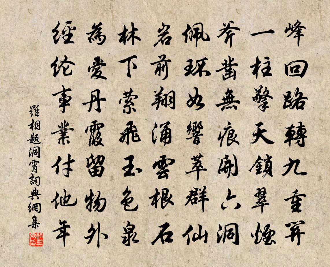 詩詞名句歷史字典書法欣賞書法字典國語詞典說文解字康熙字典古漢語字典標 題 作 者 詩 句 題洞霄作者:羅相 朝代:宋代題洞霄原文峰迴路轉九重關,一柱擎天鎖翠煙。斧鑿無痕開六洞,佩環如響萃群仙。岩前翔涌雲根石,林下縈飛玉色泉。為愛丹霞留物外,經綸事業付他年。詩詞問答問:題洞霄的作者是誰?答:羅相問:題洞霄寫於哪個朝代?答:宋代羅相題洞霄書法欣賞題洞霄書法作品詩詞推薦減字木蘭花朱敦儒〔宋代〕無人惜我。我自殷勤憐這個。恧峭惺惺。不肯隨人獨自行。乾坤許大。只在棘針尖上坐。依舊多情。摟著虛空睡到憶仙姿洪皓〔宋代〕小憩書齊胡處,間取響泉調去。是事不關心,自得曲中深趣。無語,無語,回首暮雲飛絮。題余尚書山居要術祖無擇〔宋代〕張衡已作歸田賦,氾勝仍修種樹書。願借山居精要術,欲將嵩洛葺吾廬。偈頌三十六首釋如珙〔宋代〕鼓聲咬破七條,只著偏衫去也。老鼠滿地走,拖取貓兒來。末秋到家潘圖〔唐代〕歸來無所利,骨肉亦不喜。黃犬卻有情,當門臥搖尾。有感李流謙〔宋代〕眼看燕雀鬧雲間,塌翼蓬榛笑孔鸞。未暇持竿釣渭水,卻因採菊見南山。床頭有酒三冬足,案上無書一日閒。世路滿江紅 別毗陵二十載,一日北歸,艤舟訪舊周權〔元代〕戲調此詞以自述獨酌新豐,任疏放、從人不識。還只是、舊時把酒,秋風狂客。顛倒天吳歸短褐,風濤歲月頭將白久過重陽菊英粲然即事十首方回〔宋代〕紫陽山下園五畝,一半教兒種菊花。霜漸濃時花更好,六年何事未還家。射梅李龍高〔宋代〕由基去後揮瞻來,不慣穿楊慣射梅。寄語東居莫塗抹,犧樽自是木之災。偈頌十七首釋師範〔宋代〕舊歲今宵去,去去實不去。新年明日來,來來實不來。萬古長空無變異,循環日月空相催。贈式上人方乾〔唐代〕縱居鼙角喧闐處,亦共雲溪邃僻同。萬慮全離方寸內,一生多在五言中。芰荷葉上難停雨,松檜枝間自有風。莫笑雲山歌徐僑〔宋代〕雲山窈兮風微,山徑繚兮雲依。蘭馨兮晨晞,松樛兮夕暉。有禽消搖其間兮不去,飛俛啄兮蔌薇。昂吟兮綠筠枝,驀山溪仲殊〔宋代〕清江平淡,疏雨和煙染。春在廣寒宮,付江梅、先開素艷。年年第一,相見越溪東,雲體態,雪精神,不把年華占薛子舒墓葉適〔宋代〕悒悒西門路,樵歌占晚雲。燐迷王弼宅,蒿長孟郊墳。少病憐醫錯,題書與父分。又言重把筆,兼欲使余聞。護龍河范成大〔宋代〕新郭門前見客舟,清漣淺淺抱城樓。六龍行在東南國,河若能神合斷流。臥疾走筆酬韓愈書問賈島〔唐代〕一臥三四旬,數書惟獨君。願為出海月,不作歸山雲。身上衣頻寄,甌中物亦分。欲知強健否,病鶴未離群。送人西上劉克莊〔宋代〕華胄惟莆冠七閩,陳岩所產必聞人。穆陵鳳閣曾分席,朝道麟台有後身。上覽四書方唱嘆,子行三策好條陳。明時涇渭揚清濁呂牧〔唐代〕涇渭橫秦野,逶迤近帝城。二渠通作潤,萬戶映皆清。明晦看殊色,潺湲聽一聲。岸虛深草掩,波動曉煙輕。御獵風流子(清涵萬象閣)趙孟堅〔宋代〕望極思悠悠。江如練、籟息浪紋收。看帆卷帆舒,往來征艇,鷺飛鷺立,遠近芳洲。逝波不捨山常好,祗白少年頭十七日過無住庵,因留題簽上人半雲軒楊維楨〔元代〕我訪東山丞相譜,因過南墅半雲竂。雉棲薜荔都蒼墓,鰲補天容大士橋。萬歲藤枝神蛻杖,三花樹子癭為瓢。老僧名句推薦世間花葉不相倫,花入金盆葉作塵。李商隱《贈荷花》 書無不可讀者!魏徵《隋書·列傳·卷四十一》 順天意者,義政也;反天意者,力政也。墨子《墨子·26章 天志(上)》 不作無益害有益,功乃成;不貴異物賤用物,民乃足。佚名《尚書·周書·旅獒》 苕之華,其葉青青。佚名《苕之華》 政者正也。君為正,則百姓從政矣。戴聖《禮記·哀公問》 息徒蘭圃,秣馬華山。嵇康《贈秀才入軍·其十四》 花氣襲人知驟暖,鵲聲穿樹喜新晴。陸游《村居書喜》 石溪久住思端午,館驛樓前看發機。盧肇《競渡詩 / 及第後江寧觀競渡寄袁州剌史成應元》 無限河山淚,誰言天地寬夏完淳《別雲間》