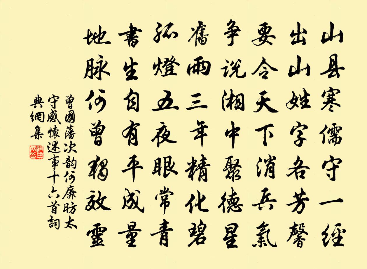 詩詞名句歷史字典書法欣賞書法字典國語詞典說文解字康熙字典古漢語字典標 題 作 者 詩 句 次韻何廉昉太守感懷述事十六首作者:曾國藩 朝代:清代原文山縣寒儒守一經,出山姓字各芳馨。要令天下消兵氣,爭說湘中聚德星。舊雨三年精化碧,孤燈五夜眼常青。書生自有平成量,地脈何曾獨效靈!詩詞問答問:《次韻何廉昉太守感懷述事十六首》的作者是誰?答:曾國藩問:該詩寫於哪個朝代?答:清代書法欣賞次韻何廉昉太守感懷述事十六首書法作品詩詞推薦宿長蘆寺下四絕鄭剛中〔宋代〕風伯清塵過浙西,隨春萬騎擁旌旗。野人不識巡方意,驚蹕還憂為虜移。用陳和你太博韻題江州高遠亭四首袁說友〔宋代〕亭高未涉意先申,五馬同來卻報春。一笑孰知今在旅,茲游端不厭居塵。分張好景因人重,排拶佳篇逐日新。我是十二月二日夜夢與客並馬行黃河上息於古驛陸游〔宋代〕並轡徐驅百里中,雲開太華翠摩空。是間合有神靈在,七十餘年墮犬戎。悼亡趙蕃〔宋代〕死別生難見,生離死會逢。休憑海山信,浪覓少翁容。春院無新跡,羅衣有舊縫。昨朝桃李艷,今日綠陰重。十四日二首趙蕃〔宋代〕梅開在高岡,仰望不可攀。微風一動搖,落片紛斕斑。下者隱幽閟,叢然榛棘間。著根近谿流,墮地即水灣。是物月夜江行 / 旅次江亭權德輿〔唐代〕扣舷不能寐,浩露清衣襟。彌傷孤舟夜,遠結萬里心。幽興惜瑤草,素懷寄鳴琴。三奏月初上,寂寥寒江深。宮詞一百首岳珂〔宋代〕驥騄雙馳挽六鈞,一枝花蕊委紅塵。相輝樓下空排馬,徒見寧王奉太真。學舍晝上宋祁〔宋代〕風射長廊雪絮春,經筵無客有流塵。捫心自問何功德,五管支離治繲人。戊子正月六日雷雨感嘆示壽仁子楊萬里〔宋代〕今晨忽雷雨,天地又發春。草木悶紅綠,生意察已欣。蟄蟲且徐動,余寒未全仁。先生起裹頭,三嘆一再顰。春風偈頌七十六首釋子益〔宋代〕秋未霜,菊正芳。千朵萬朵香吐蕊,三枝兩枝金樣黃。不作世諦流布,亦非佛法商量。九月九日是重陽。謝城南張氏弟兄冒雪載餚酒見過邵雍〔宋代〕久旱幾逾冬,川守祈未得。雁行聯鑣來,佳雪遽盈尺。酒面生紅光,客心喜何極。上夜離天津,天津陡岑寂。浪淘沙王仲甫〔宋代〕素手水晶盤。壘起仙丸。紅綃碾碎卻成團。逗得安排金粟遍,何似雞冠。味勝玉漿寒。只被宜酸。莫將荔子一般看答段秀才呂溫〔唐代〕盡日看花君不來,江城半夜與君開。樓中共指南園火,紅燼隨花落碧苔。句劉接〔宋代〕湛湛直通龍渡水,虢虢傍過鹿頭山。獄中聞駕幸長安二首沈佺期〔唐代〕傳聞聖旨向秦京,誰念羈囚滯洛城。扈從由來是方朔,為申冤氣在長平。無事今朝來下獄,誰期十月是橫河。君看感舊寫真白居易〔唐代〕李放寫我真,寫來二十載。莫問真何如,畫亦銷光彩。朱顏與玄鬢,日夜改復改。無嗟貌遽非,且喜身猶在。陪守齋至玉湖書院作陳鑒之〔宋代〕天垂大溪碧,近樹齊遠山。水氣涵野色,縹緲亭數間。維昔文節公,孤標凜 * 。飄然兩屐齒,雲岩遍躋攀。此地長乾曲佚名〔南北朝〕逆浪故相邀,菱舟不怕遙。妾家揚子住,便弄廣陵潮。題竹軒張景脩〔宋代〕種竹才添十數竿,題詩已僅百餘篇。有時碎影搖金地,盡日清風伴玉泉。不與愛魚人把釣,肯教騎馬客求鞭。平生自吳岳歸李復〔宋代〕鳴鳳岡邊路,秋風動夕嵐。閒雲依絕壁,獨鳥下空潭。疇昔經行慣,重來委曲諳。試尋遺墨在,投策訪僧龕。名句推薦有桃花紅,李花白,菜花黃。秦觀《行香子·樹繞村莊》 能令暫開霽,過是吾無求。韓愈《洞庭湖阻風贈張十一署·時自陽山徙掾江陵》 使君宏放,談笑洗盡古今愁。陸游《水調歌頭·多景樓》 山僧過嶺看茶老,村女當壚煮酒香。祝允明《首夏山中行吟》 客行野田間,比屋皆閉戶。姚合《莊居野行》 智之所貴,存我為貴;力之所賤,侵物為賤。然身非我有也,既生,不得不全之列子及其弟子《列子·楊朱》 終日兩相思。為君憔悴盡,百花時。溫庭筠《南歌子·倭墮低梳髻》 謙尊而光,卑而不可逾,君子之終也。佚名《易傳·彖傳上·謙》 己欲立而立人,己欲達而達人。孔子弟子《論語·雍也篇》 日光寒兮草短,月色苦兮霜白。李華《弔古戰場文》