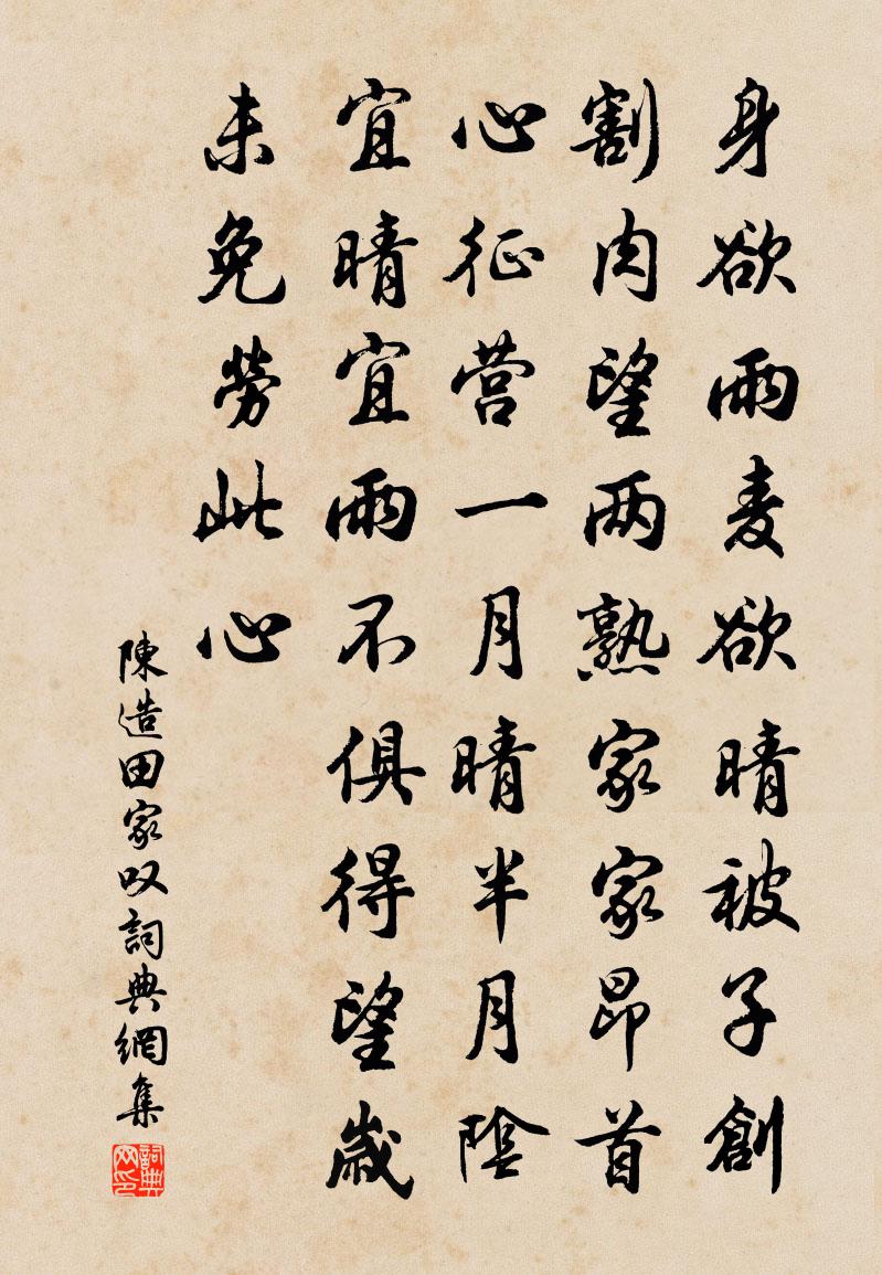 詩詞名句歷史字典書法欣賞書法字典國語詞典說文解字康熙字典古漢語字典標 題 作 者 詩 句 田家嘆作者:陳造 朝代:宋代田家嘆原文身欲雨,麥欲晴。被子創割肉望兩熟,家家昂首心征營。一月晴,半月陰。宜晴宜雨不俱得,望歲未免勞此心。詩詞問答問:田家嘆的作者是誰?答:陳造問:田家嘆寫於哪個朝代?答:宋代陳造田家嘆書法欣賞田家嘆書法作品詩詞推薦鼓腹無所思朝起暮歸眠湫明詩也以詩定韻為十滕岑〔宋代〕立夏少半月,穀雨是今朝。梅子酸著齒,麥穗長半腰。天運不暫停,又將轉斗杓。無復冬裘御,重取夏扇搖。橫江詞其四李白〔唐代〕海神來過惡風回。浪打天門石壁開。浙江八月何如此。濤似連山噴雪來。霜角 黃山尋霽張可久〔元代〕雲開洞府。按罷瓊妃舞。三十六峰圖畫,張素錦、列冰柱。幾縷。翠煙聚。曉妝眉更嫵。一個山頭不白,人知是,己未生朝謝莘叟兄送梅陳傅良〔宋代〕莫笑栽培日月遲,待看老乾及孫枝。天將臘去春回首,人與花同雪滿頤。萬里隴頭空故跡,孤山籬落但余基。至今歸去來引佚名〔唐代〕歸去來,歸期不可違。相見旋明月,浮雲共我歸。投壺朱翌〔宋代〕誰可忘憂慰寂寥,夏長惟以一壺消。坐中皆欲從多馬,妙處何妨不絕梟。幸郭滑稽無事日,將遵取士中興朝。諸公肩吾生日以三絕為壽魏了翁〔宋代〕宇靜晝窗長似歲,心清夏簟冷於秋。是間訊息君知得,看盡區中浪白頭。頌證道歌證道歌釋印肅〔宋代〕空拳指上生實解,巡行數墨看經快。圓蟾光體指俱迷,枉入三途虛受罪。皇太妃閣五首蘇軾〔宋代〕雨細方梅夏,風高已麥秋。應憐百花盡,綠葉暗紅榴。疏墮晁說之〔宋代〕疏墮何堪行役勞,窮陰急景晚風高。京華前歲此時雪,獨臥先廬亦寂寥。送太常王素博士許昌通理宋庠〔宋代〕連佐陪京郡,愁銜出祖杯。新曹拋野蕝,舊第老公槐。府檄迎車遠,戎牙宴豆開。遙知傾坐日,方歡阿{左盧右耳庚午正月七夜自詠張九成〔宋代〕余性寡所諧,平生惟自得。談名頸深縮,論利面作赤。文不貴雕蟲,詩尤惡鉤擿。粗豪真所畏,機巧非予匹。所以秋佚名〔宋代〕月色驅秋下穹昊,梁間燕語辭巢早。古苔凝紫貼瑤階,露槿啼紅墮江草。越客羈魂掛長道,西風欲揭南山倒。粉娥虞美人(自蘭陵歸,冬夜飲嚴州酒作)葛勝仲〔宋代〕嚴陵灘畔香醪好。遮莫東方曉。春風盎盎如寒肌。人道霜濃臘月、我還疑。紅爐火熱香圍坐。梅蕊迎春破。一聲清早春郭知運〔宋代〕年來飄泊任西東,解組論文意自雄。臘盡竺溪漁唱晚,杏花溪上又春風。郊行劉克莊〔宋代〕一雨餞殘熱,忻然思杖藜。野田沙鸛立,古木廟鴉啼。失仆行迷路,逢樵負過溪。獨游吾有趣,何必問棲棲。書事二首劉克莊〔宋代〕人道山東入職方,書生膽小虜空長。遺民似蟻飢難給,俠士如鷹飽易揚。未見馳車修寢廟,先聞鑄印拜侯王。青齊橫吹曲辭。隴頭吟翁綬〔唐代〕隴水潺湲隴樹黃,征人隴上盡思鄉。馬嘶斜日朔風急,雁過寒雲邊思長。殘月出林明劍戟,平沙隔水見牛羊。橫行登幽州台歌陳子昂〔唐代〕前不見古人,後不見來者。念天地之悠悠,獨愴然而涕下。題友人山居黃滔〔唐代〕到君棲跡所,竹徑與衡門。亦在乾坤內,獨無塵俗喧。新泉浮石蘚,崩壁露松根。更說尋僧處,孤峰上嘯猿。名句推薦海燕歲微渺,乘春亦暫來。張九齡《歸燕詩》 敕勒川,陰山下。天似穹廬,籠蓋四野佚名《敕勒歌》 回首故山千里外,別離心緒向誰言?楊徽之《寒食寄鄭起侍郎》 莫道藍橋路遠,行雲中隔幽坊。吳文英《風入松·為友人放琴客賦》 去好去惡,臣乃見素;去舊去智,臣乃自備。韓非及後人《韓非子·主道》 書卷多情似故人,晨昏憂樂每相親。于謙《觀書》 晚日寒鴉一片愁。柳塘新綠卻溫柔。辛棄疾《鷓鴣天·晚日寒鴉一片愁》 高詞迥映,如朗月之懸光;疊意回舒,若重岩之積秀。房玄齡《晉書·列傳·第二十四章》 野火燒不盡,春風吹又生。白居易《草 / 賦得古原草送別》 雲雨朝還暮,煙花春復秋。李珣《巫山一段雲·古廟依青嶂》
