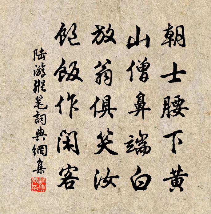 詩詞名句歷史字典書法欣賞書法字典國語詞典說文解字康熙字典古漢語字典標 題 作 者 詩 句 縱筆作者:陸游 朝代:宋代縱筆原文朝士腰下黃,山僧鼻端白;放翁俱笑汝,飽飯作閒客。詩詞問答問:縱筆的作者是誰?答:陸游問:縱筆寫於哪個朝代?答:宋代問:陸游的名句有哪些?答:陸游名句大全陸游縱筆書法欣賞縱筆書法作品詩詞推薦次韻觀月陳師道〔宋代〕風雲隨落日,河漢欲回天。隔巷如千里,還家已再圓。簾疏分細細,江淨共娟娟。他日吾何適,聽詩說去年。題傅侍郎寒碧十五韻宜月陳宓〔宋代〕海底初上時,柳末清光發。滿窗璠歟映,我胸中月地。送黃岩二陳秀才葉適〔宋代〕一雙璞玉稟天和,遠向東州就琢磨。待得永無痕鋟相,莫言功用不須多。留題仙觀徐鉉〔唐代〕瑤壇醮罷晚雲開,羽客分飛俗士回。為報移文不須勒,未曾游處待重來。重陽節玉津園錫宴宋庠〔宋代〕紀節符陽序,承恩出上蘭,廚均堯脯膳,優集漢觴歡。紫菊吹花酎,丹萸辟惡丸。秋光浮翠帟,雜蘤珥華冠。宮樹益壽美金花侯善淵〔元代〕擘開鬼窟。杳杳冥冥精恍惚。滿目華陽。*耀靈珠映日光。至真無物。寶燦精*明返復。致死不忘。星*丹霄得久宮詞張公庠〔宋代〕年華先到未央宮,嬉賞班班四序中。瀟灑梅花元耐雪,輕狂柳絮不嫌風。即事張鎡〔宋代〕池通幽澗碧如油,試水新鵝小拍浮。行過板橋花片落,被風邀上采菱舟。讀大行皇帝遺詔感恩哀慟六首劉克莊〔宋代〕聖度如天未易量,每憐孤直赦疏狂。中傷競發千鈞弩,拂拭重登七寶床。昔忝未歸同二老,今無殉死愧三良。鼎湖今日史課偶少暇戲作五字陸游〔宋代〕仲夏性入都門,性堂性忽已性霜。史館方掄才,我亦廁其傍。三日敗一筆,手胝視芒芒,吏來督日程,炙冷不及嘗七月二十五日為廣州蒲澗節鞏帥相招坐上默營曾豐〔宋代〕石激幽泉響,風排古木號。離城未多遠,去地不勝高。出處向來誤,是非何處逃。安期相領略,回首付兒曹。逍遙詠宋太宗〔宋代〕世界諸方聖,如同在眼前。其於通要妙,便見理深玄。法教窮難盡,周知本自然。信誠含萬象,秘隱口親宣。寄張守仲思十首陳造〔宋代〕珍蔬解佐盤餐館,妙劑真令病骨輕。鍾乳茈姜皆楚產,薦芹聊致野人誠。信州道士蕭了空坐逝或見其在湘潭總府貳蕭公方回〔宋代〕了了了了,空空空空,心肝不在臭皮袋中。想見出神似蟬蛻,可能吸露更餐風。餘乾史子固本知縣趨朝便舟見訪以四絕句敘舊曹彥約〔宋代〕仕已都無喜慍三,有弦不解但操南。歸來穩上論思直,政爾民情已熟諳。義寧華岩洞和純陽真人方信孺〔宋代〕跨鶴曾來不記年,洞中流水綠依然。紫簫吹徹無人見,萬里西風月滿天。憩老方回〔宋代〕憩老千山里,投閒五載余。直令艱日糴,何用戀鄉居。白傅欲賣宅,虞卿空著書。秋園菊籬好,荒草欠人鋤。漁歌李彭〔宋代〕選佛堂中川苴。衲僧卑孔頭垂下。獨秀握業無一把。杖頭掛。從教西海禪徒訝。郊廟朝會歌辭方皇樂歌佚名〔宋代〕卓彼嘉壇,奠玉方澤。百辟祗簫,八音純繹。祀呈承明,柔祗感格。白日偶無客青山長對門韓淲〔宋代〕枕流飯脫粟,長夏以終日。曳屣行歌商,風軒時弄筆。名句推薦石溪久住思端午,館驛樓前看發機。盧肇《競渡詩 / 及第後江寧觀競渡寄袁州剌史成應元》 君有妒臣,則賢人不至。荀子《荀子·大略》 傷心千古,秦淮一片明月!薩都剌《念奴嬌·登石頭城次東坡韻》 多謝月相憐,今宵不忍圓。朱淑真《菩薩蠻·山亭水榭秋方半》 葉開隨足影,花多助重條。陰鏗《雪裡梅花詩》 廣陵城裡昔繁華,煬帝行宮接紫霞。曾棨《維揚懷古》 灞橋煙柳,曲江池館,應待人來。陸游《秋波媚·七月十六日晚登高興亭望長安南山》 枝枝相糾結,葉葉競飄揚。李白《古意》 百二禁兵辭象闕,三千宮女下龍舟。許渾《汴河亭》 來時父母知隔生,重著衣裳如送死。王建《渡遼水》