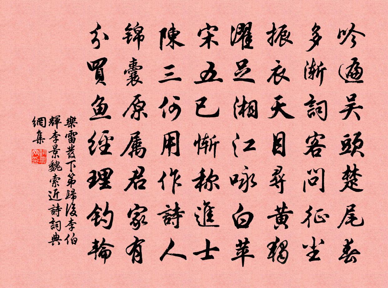 詩詞名句歷史字典書法欣賞書法字典國語詞典說文解字康熙字典古漢語字典標 題 作 者 詩 句 下第歸後李伯輝李景魏索近詩作者:樂雷發 朝代:宋代原文吟遍吳頭楚尾春,多漸詞客問征塵。振衣天目尋黃獨,濯足湘江詠白苹。宋五已慚稱進士,陳三何用作詩人。錦囊原屬君家有,分買魚經理釣輪。詩詞問答問:《下第歸後李伯輝李景魏索近詩》的作者是誰?答:樂雷發問:該詩寫於哪個朝代?答:宋代書法欣賞下第歸後李伯輝李景魏索近詩書法作品詩詞推薦戲答諸少年白居易〔唐代〕顧我長年頭似雪,饒君壯歲氣如雲。朱顏今日雖欺我,白髮他時不放君。濡須道中孫應時〔宋代〕睡足蓬窗江月明,濡須浦口片帆輕。菰蒲兩岸長春水,楊柳一村啼曉鶯。休指山川問今古,且欣時節正蠶耕。白鷗滿庭芳 贈武功薛先生馬鈺〔元代〕同流相聚,遞相覺察。須當外搜內惻。斗做修行,有若爭頭競角。見賢思齊休妒,把神珠、時時擦抹。如開悟,便答郭師聖馮時行〔宋代〕問訊煩書札,情親語味長。是非元自定,得失已兼忘。洗手分僧飯,清心炷佛香。窮城不假給,何似水雲鄉。衡陽龐居士庵釋智愚〔宋代〕居士當年錯用心,渾家不睦到如今。摝籬柄短無人買,空自蕭蕭風滿林。次韻鄉人華秀才冬至日投贈二首項安世〔宋代〕異鄉初見子文章,短至仍逢日吉良。下馬入門知意重,芳華贈我愧情長。筆端風味誰能及,江上形容莫自傷。一線觀陸士龍作顧彥先婦答夫二首有感韻戴復古〔宋代〕北風吹歲暮,空閨獨棲止。夙興淚盈掬,夕息夢千里。妾生胡不仁,失身從浪子。嚼檗苦我心,餐冰噤我齒。離異游東山和程大卿師孟許將〔宋代〕東山十里復溪流,遠客時時騁望愁。泉近榴花深洞口,亭開獅子舊峰頭。一州旂色天邊出,三館芸香海上留。南北即事文天祥〔宋代〕去年傷北使,今日嘆南馳。雲濕山如動,天低雨欲垂。征夫行未已,遊子去何之。正好王師出,崆峒麥熟時。促拍滿路花佚名〔宋代〕抱元能守一,四大自輕安。心中須返照,幾曾閒。金烏銜耀,飛入爛銀盤。心心心是道,只在心心,更於何處求仙長安月夜與友人話故山(一作舊山,一作故人)趙嘏〔唐代〕宅邊秋水浸苔磯,日日持竿去不歸。楊柳風多潮未落,蒹葭霜冷雁初飛。重嘶匹馬吟紅葉,卻聽疏鍾憶翠微。今夜柏溪岩頭陳著〔宋代〕晴色上游筇,西行二里中。薺花黃纈地,麥穗白潮風。紙杵鳴山屋,齋鍾出梵宮。歸途須傍早,要折石岩紅。春日覽鏡有感范成大〔宋代〕習氣不解老,壯心故嵯峨;忽與鄉曲齒,方驚年許多!有眼不自見,尚謂朱顏酡;今朝鏡中逢,憔悴如枯荷。形骸同前蘇軾〔宋代〕我頃三章乞越州,欲尋萬壑看交流。且憑造物開山骨,已見天吳出浪頭。(石中似有海獸形狀。)履道鑿池雖可致寄監察從兄曹鄴〔唐代〕我祖居鄴地,鄴人識文星。此地星已落,兼無古時城。古風既無根,千載難重生。空留建安書,傳說七子名。賤子次韻才子曹溪道中李彌遜〔宋代〕偶脫塵纓百慮寬,更窮目力快遐觀。旋謀濁酒招強伴,行拾落英供晚餐。樹擁山根張密幄,雲隨雨腳走驚湍。試追【雙調】湘妃怨盧摯〔元代〕西湖湖山佳處那些兒,恰到輕寒微雨時。東風懶倦催春事,嗔垂楊裊綠絲,海棠花偷抹胭脂。任吳岫眉尖恨,厭錢秋懹陸游〔宋代〕昨者風雨過,浩然天地秋。年光雙雪鬢,生計一漁舟。賣藥來查浦,聽猿到沃洲。平生畏暑毒,八月記初游。鷓鴣天謝逸〔宋代〕紅暈香腮粉末勻。梳妝閒淡穩精神。誰知碧嶂清溪畔,也有姚家一朵春。眉黛淺,誰為顰。莫將心事付朝雲。坐中似史和甫傳清陳著〔宋代〕翩翩鶴往還,高眼看塵寰。家世崔盧上,風流晉宋閒。開門種桃李,落筆動江山。勳業時來做,青春贏得閒。名句推薦有無相生,難易相成,長短相形,高下相傾,音聲相和,前後相隨。老子《老子·道經·第二章》 燕子不歸春事晚,一汀煙雨杏花寒。戴叔倫《蘇溪亭》 遠水難救近火,遠親不如近鄰。佚名《增廣賢文·上集》 偶然值林叟,談笑無還期。王維《終南別業 / 初至山中 / 入山寄城中故人》 楚王好細腰,宮中多餓死。佚名《無題》 幾時能命駕,對酒落花前。賈島《清明日園林寄友人》 紅豆生南國,春來發幾枝。王維《相思》 跨馬出郊時極目,不堪人事日蕭條杜甫《野望》 只在此山中,雲深不知處。賈島《尋隱者不遇 / 孫革訪羊尊師詩》 夜覺曉非,今悔昨失顏之推《顏氏家訓·序致篇》