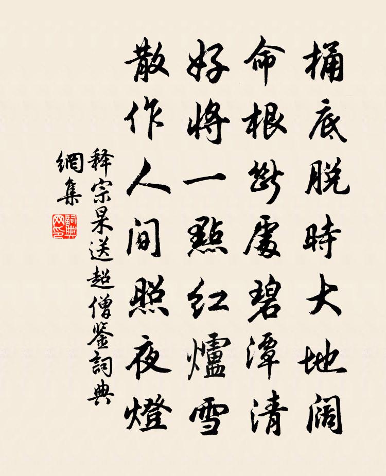 詩詞名句歷史字典書法欣賞書法字典國語詞典說文解字康熙字典古漢語字典標 題 作 者 詩 句 送超僧鑒作者:釋宗杲 朝代:宋代送超僧鑒原文桶底脫時大地闊,命根斷處碧潭清。好將一點紅爐雪,散作人間照夜燈。詩詞問答問:送超僧鑒的作者是誰?答:釋宗杲問:送超僧鑒寫於哪個朝代?答:宋代釋宗杲送超僧鑒書法欣賞送超僧鑒書法作品詩詞推薦瀟湘神黃公紹〔宋代〕賀靈灶。賀靈灶。幾年翠舞與珠歌。看到日斜猶未足,涌金門外涌金波。農家嘆陸游〔宋代〕有山皆種麥,有水皆種秔。牛領瘡見骨,叱叱猶夜耕。竭力事本業,所願樂太平。門前誰剝啄,縣吏徵租聲。一身送方元忠鄭獬〔宋代〕京師惡塵土,兩足沒至踝。狂風暴然作,塞天赤如赭。事牽或出門,復又無驢跨。垢汗黏透衣,留遲固不遐。走歸答丘長史詩何遜〔南北朝〕宿昔敦遠遊。名分乃異路。千里泝波潮。一朝披雲霧。從容舍密勿。繾綣論襟趣。披文極詆訶。析理窮章句。明鍾無題朱元璋〔明代〕雞叫一聲撅一撅,雞叫二聲撅二撅。三聲四聲天下白,褪盡殘星與曉月。句 * 真〔宋代〕卷衣更上前岩去,別有雲山千萬重。六六峰從雲外立,三三人出洞中來。碧玉環中藏世界,白雲影里見樓台。玉樓春 重書靈嚴舊題處洪希文〔元代〕燕語垂楊春又暮。往事空隨流水去。當時傑句倩誰題,塵筆只今無著處。酒債尋常隨所寓。煙竹風花堪笑語。偷閒習馬長楊詩樓鑰〔宋代〕強漢承平後,兢兢武不忘。整師臨五柞,習馬向長楊。冀野來騏驥,天閒出驌驦。驤騰射熊館,馳驟華山陽。輦路鷓鴣鄧剡〔宋代〕行不得也哥哥。瘦妻弱子羸牸馱,天長地闊多網羅。南音漸少北音多,肉飛不起可奈何。行不得也哥哥。讀陳勝傳屈大均〔清代〕閭左稱雄日,漁陽謫戍人。王侯寧有種?竿木足亡秦。大義呼豪傑,先聲仗鬼神。驅除功第一,漢將可誰倫?新州鹿鳴宴致語口號胡寅〔宋代〕秋氣清高肅雁行,賢侯勸駕會黃堂。賓朋滿座曳珠履,鼓吹喧天飛羽觴。題柱棄繻俱有志,班荊折桂正相望。明年山寺夜起看月李昴英〔宋代〕丙夜忽窗白,披衣起憑欄。山川如晝見,松檜照人寒。孤鶴欬屋脊,群僧鼾紙單。燈前呼老佛,妙境許同觀。入湧泉道中程師孟〔宋代〕寒林已見早梅芳,盡日臨流野與長。門外牛羊人自得,籬邊雞犬盜誰防。三江夜色滄浪白,千里秋香{禾巴}稏黃漫興張元乾〔宋代〕老答書題懶,貧營口腹忙。未能忘壯志,詎肯變剛腸。晷短催寒急,燈明伴漏長。床頭褚衾在,不怕滿檐霜。送李公恕赴闕蘇軾〔宋代〕君才有如切玉刀,見之凜凜寒生毛。願隨壯士斬蛟蜃,不願腰間纏錦絛。用違其才志不展,坐與胥吏同疲勞。忽然予賦雁湖詩蒙友社諸文繼聲不一輒復自和四首李壁〔宋代〕閒來日日理荒余,剩引漣漪一派俱。試把漁竿臨斷岸,從教畫手貌成圖。啼春不到鶯無友,警夜誰知雁有奴。出處洞庭湖孫應時〔宋代〕明湖綱宇宙,春思滿樓台。沙鳥一行去,風帆千里來。平生眼今飽,落日首重回。會趁江山約,還愁白髮催。【雙調】一綻銀佚名〔元代〕昨日東周今日秦,舊冢新墳。轉首三年一閏,抱官囚痴人。 座上花枝袖裡金,朋盍簪。不醉青春圖甚?再難來莫養虎彭子翔〔宋代〕莫養虎,飽則喜子飢則怒。莫養鷹,飢則附人飽颺去。鷹去但忘恩,虎怒將為冤。不如團飯養雞狗,狗能吠盜雞戒挽吳尚書三首吳芾〔宋代〕晚歲登台省,頻年侍殿墀。從容如素宦,卓犖冠明時。人冀終圖任,天胡不憗遺。流芳知未艾,家有寧馨兒。名句推薦君若清路塵,妾若濁水泥;曹植《明月上高樓》 愁煩中具瀟灑襟懷,滿抱皆春風和氣;暗昧處見光明世界,此心即白日青天。王永彬《圍爐夜話·第七八則》 冰,水為之,而寒於水。荀子《勸學》 見梨花初帶夜月,海棠半含朝雨。万俟詠《三台·清明應制》 野渡花爭發,春塘水亂流。李嘉祐《送王牧往吉州謁王使君叔》 我來一長嘆,知是東溪蓮。白居易《京兆府栽蓮》 應是天仙狂醉,亂把白雲揉碎。李白《清平樂·畫堂晨起》 蕃漢斷訊息,死生長別離。張籍《沒蕃故人》 去年今日此門中,人面桃花相映紅。崔護《題都城南莊》 寄言燕雀莫相啅,自有雲霄萬里高。李白《觀放白鷹二首》