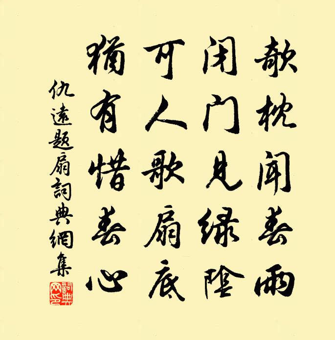 詩詞名句歷史字典書法欣賞書法字典國語詞典說文解字康熙字典古漢語字典標 題 作 者 詩 句 題扇作者:仇遠 朝代:宋代題扇原文欹枕聞春雨,閉門見綠陰。可人歌扇底,猶有惜春心。詩詞問答問:題扇的作者是誰?答:仇遠問:題扇寫於哪個朝代?答:宋代仇遠題扇書法欣賞題扇書法作品詩詞推薦酬山月江與投贈施樞〔宋代〕帝里風光好,隨緣適宦情。卻居城郭外,不雜市廛聲。水國霜天冷,梅庭夜月清。正慚無雅韻,敢說到詩名。齡叟得稼山好語因贊之陳著〔宋代〕高懷不是愛山行,鐘鼓樓高有宿盟。今夜老禪聯榻臥,定應說到有西成。清平樂·野花芳草韋莊〔唐代〕野花芳草,寂寞關山道。柳吐金絲鶯語早,惆悵香閨暗老。羅帶悔結同心,獨憑朱欄思深。夢覺半床斜月,小窗風商山路有感白居易〔唐代〕憶昨征還日,三人歸路同。此生都是夢,前事旋成空。杓直泉埋玉,虞平燭過風。唯殘樂天在,頭白向江東。酬韓侍郎張博士雨後游曲江見寄白居易〔唐代〕小園新種紅櫻樹,閒繞花行便當游。何必更隨鞍馬隊,沖泥蹋雨曲江頭。和戴禹功幕府歸來三首王之道〔宋代〕客里詩成付漫書,清風一榻黑甜余。相山舊隱今分定,卻是歸來計不疏。六言章甫〔宋代〕從來鐘鼎無夢,是處林泉可家。料事頗知風雨,逢人且說桑麻。八詠詩 歲暮愍衰草沈約〔南北朝〕愍衰草。衰草無容色。憔悴荒徑中。寒荄不可識。昔時兮春日。昔日兮春風。含華兮佩實。垂綠兮散紅。氛氳鳷鵲滿庭芳王處一〔元代〕龍轉西江,金光搖曳,踴身飛上穹蒼。興雲吐霧,威力大施張。槁稼俄逢飽雨,人心盡、欣喜洋洋。將何喻,如收和蔡景繁海州石室蘇軾〔宋代〕芙蓉仙人舊遊處,蒼藤翠壁初無路。戲將桃核裹黃泥,石間散擲如風雨。坐令空山出錦繡,倚天照海花無數。花間春日途中五首項安世〔宋代〕未說離家日日晴,離家三日雨如傾。津頭小吏詢名氏,但道當年段墨卿。自省曾豐〔宋代〕肺肝供物態,須鬢管年華。眼閱世更變,口談時過差。眉因公道蹙,手為貴人叉。點檢通身事,都無益自家。霅溪夜宴詩(湘江神歌)水神〔唐代〕渺渺煙波接九疑,幾人經此泣江蘺。年年綠水青山色,不改重華南狩時。楊復先寄荔子仍和予昨所贈二詩因次韻晁公溯〔宋代〕嘉果喜三嗅,名園思一游。駢頭丹殼皺,繞指玉漿流。味壓乾{月巽}子,韻高蕭灑侯。安居日啗此,邊堠幸兵休題紫溪驛黃公度〔宋代〕離家一月斷家書,家在閩山深處居。路入江南隔分水,山猶不見況吾廬。書劉克莊〔宋代〕兩帖走蛟虬,堂堂腕力遒。太師唐死節,大令晉風流。要續 * 刻,那容扇媼求。教兒勤護惜,恐被六丁偷。金縷曲/賀新郎劉辰翁〔宋代〕絕北寒聲動。渺黃昏、葉滿長安,雲迷章貢。最苦周公千年後,正與莽新同夢。五十國、紛紛入中。搖颺都人歌郿酬夢得秋夕不寐見寄(次用本韻)白居易〔唐代〕碧簟絳紗帳,夜涼風景清。病聞和藥氣,渴聽碾茶聲。露竹偷燈影,煙松護月明。何言千里隔,秋思一時生。山居七詠瑞萱堂方岳〔宋代〕攜得春歸通德門,等閒萬木亦沾恩。母桃未熟蓬萊淺,連夜吹開堂北萱。憶江南·銜泥燕牛嶠〔唐代〕憶泥燕,飛到畫堂前。占得杏梁安穩處,體輕唯有主人憐,堪羨好因緣。名句推薦西施若解傾吳國,越國亡來又是誰。羅隱《西施》 悵望千秋一灑淚,蕭條異代不同時。杜甫《詠懷古蹟五首·其二》 龍馬花雪毛,金鞍五陵豪。李白《白馬篇》 我有三寶,持而保之。一曰慈,二曰儉,三曰不敢為天下先。老子《老子·德經·第六十七章》 舊相思、偏供閒晝。吳文英《夜遊宮·春語鶯迷翠柳》 讀書法,有三到。心眼口,信皆要。李毓秀《弟子規·餘力學文》 愁雲淡淡雨瀟瀟。暮暮復朝朝。石孝友《眼兒媚·愁雲淡淡雨蕭蕭》 今夜月明人盡望,不知秋思落誰家。王建《十五夜望月寄杜郎中》 今歲早梅開,依舊年時月。張孝祥《卜運算元·雪月最相宜》 夜覺曉非,今悔昨失顏之推《顏氏家訓·序致篇》