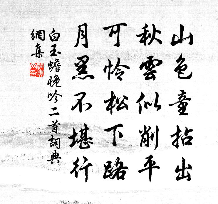 詩詞名句歷史字典書法欣賞書法字典國語詞典說文解字康熙字典古漢語字典標 題 作 者 詩 句 晚吟二首作者:白玉蟾 朝代:宋代晚吟二首原文山色童拈出,秋雲似削平。可憐松下路,月黑不堪行。詩詞問答問:晚吟二首的作者是誰?答:白玉蟾問:晚吟二首寫於哪個朝代?答:宋代問:晚吟二首是什麼體裁?答:五絕白玉蟾晚吟二首書法欣賞晚吟二首書法作品詩詞推薦馬上見賣白蓮者三首陳造〔宋代〕東盪花清晨,西湖渺無津。涼荷引天遠,極目妝面新。鳴榔與鼓枻,彼豈尋芳人。香風漂我舟,領略不及賓。當時水龍吟(甲申潼川玩月)李曾伯〔宋代〕西風吹上牛頭,天涯慰此人情耳。斜陽任晚,青山全似,故人知己。迤邐歸來,須臾懶去,桂華猶未。待冰輪推上句鄭文寶〔宋代〕舊井霜封仙界橘,雙溪晴落海邊鷗。清心鏡 薄待詔求問馬鈺〔元代〕薄待詔,能捏塑。夸妙手奇功,不曾停住。騁精神、漉水拖泥,為養家之故。心還省,性還悟。閒閒供養,本真父遣興釋文珦〔宋代〕吾方慕孤貞,俗苦尚馮附。一身天地間,瓠落如大瓠。短寄無百年,倏忽已遲暮。平生清淨禪,猶嫌被詩污。洗除送吳照鄰還江南歐陽修〔宋代〕霜前江水磨碧銅,岸背菱葉翹青蟲。吳郎鬢絲生幾縷,不羞月上扶桑東。羞見清波照人景,去時黑髮吹春風。五年沁園春 題畫骷髏吳鎮〔元代〕漏*元陽,爹娘搬販,至今未休。百種鄉音,千般狃扮,一生人我,幾許機謀。有限光陰,無窮活計,急急忙忙作中渡晚眺韋莊〔唐代〕魏王堤畔草如煙,有客傷時獨扣舷。妖氣欲昏唐社稷,夕陽空照漢山川。千重碧樹籠春苑,萬縷紅霞襯碧天。家寄贈江貫道吳則禮〔宋代〕即今海內丹青妙,只有南徐江貫道。孤峰疊巘真自奇,老樹滄波亦復好。扶杖時來問麴生,戲捉毛錐吾絕全。龍眠賀曾帥得祠二首釋善珍〔宋代〕千騎叢中舊擁旄,丹心猶在鬢蕭騷。漢庭重少馮唐老,晉士趨卑張翰高。靜看棋枰爭勝負,閒馳筆陣寄雄豪。搶榆和宋太史(一作大使)北樓新亭孟浩然〔唐代〕返耕意未遂,日夕登城隅。誰謂山林近,坐為符竹拘。麗譙非改作,軒檻是新圖。遠水自嶓冢,長雲吞具區。願隨贈雷簡夫宋祁〔宋代〕豪英出名胄,偃蹇倦宦遊。大言滿千牘,高氣橫九州。試毗陵周壽墨池樣筆楊萬里〔宋代〕舊來雞距說宣城,近來墨池說毗陵。不知阿誰喜柔懦,毛穎只今泥樣軟。筆頭政要挽千釣,渠自無力隨人轉。兔尖送五叔入京兼寄綦毋三李頎〔唐代〕吏部明年拜官後,西城必與故人期。寄書春草年年色,莫道相逢玉女祠。曉出兜率寺送許耀卿二首楊萬里〔宋代〕兜率山深露氣清,柳陰暗處藕花明。無端拾得閒煩惱,背卻西湖又入城。贈智舟三藏懷浦〔唐代〕壯歲心難伏,師心伏豈難。尋常獨在院,行坐不離壇。岳雪當禪暝,松聲入咒寒。更因文字外,多把史書看。臨江仙 次仲正經歷韻三闋蒲道源〔元代〕二路滔滔方得意,從渠掉臂昂頭。崢嶸笑殺楚纍囚。功名雖自許,妻妾見應羞。吏隱羨君懷雅志,胸中自有嵩丘。法立上人釋祖欽〔宋代〕萬法無根,人何而立。一念心堅,銀山鐵壁。發大誓願,大解脫幢。萬木生秋風自涼,庭前一陣桂花香。洛陽道馮著〔唐代〕洛陽宮中花柳春,洛陽道上無行人。皮裘氈帳不相識,萬戶千門閉春色。春色深,春色深,君王一去何時尋。春雨句富弼〔宋代〕古雲伏日當早歸,況今著令許休假。名句推薦然而其持之有故,其言之成理。荀子《荀子·非十二子》 聞道閶門萼綠華,昔年相望抵天涯李商隱《無題二首》 昔歲逢太平,山林二十年。元結《賊退示官吏》 萬物並育而不相害。道並行而不相悖。小德川流;大德敦化。子思《中庸·第三十章》 之子歸窮泉,重壤永幽隔。潘安《悼亡詩三首》 穿針人在合歡樓,正月露、玉盤高瀉。嚴蕊《鵲橋仙·碧梧初出》 絲槐煙柳長亭路,恨取次、分離去。惠洪《青玉案·絲槐煙柳長亭路》 瑤草一何碧,春入武陵溪。黃庭堅《水調歌頭·遊覽》 目察秋毫之末,耳不聞雷霆之音;耳調玉石之聲,目不見泰山之高劉安及其門客《淮南子·俶真訓》 藍橋春雪君歸日,秦嶺秋風我去時。白居易《藍橋驛見元九詩》