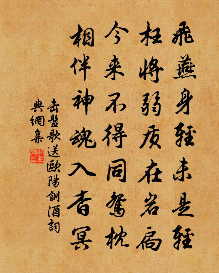 詩詞名句歷史字典書法欣賞書法字典國語詞典說文解字康熙字典古漢語字典標 題 作 者 詩 句 擊盤歌送歐陽訓酒作者:佚名 朝代:唐代擊盤歌送歐陽訓酒原文飛燕身輕未是輕,枉將弱質在岩扃。今來不得同鴛枕,相伴神魂入杳冥。詩詞問答問:擊盤歌送歐陽訓酒的作者是誰?答:佚名問:擊盤歌送歐陽訓酒寫於哪個朝代?答:唐代問:佚名的名句有哪些?答:佚名名句大全佚名擊盤歌送歐陽訓酒書法欣賞擊盤歌送歐陽訓酒書法作品詩詞推薦送趙興國趙蕃〔宋代〕憶昨屢過叢桂坊,誦詩說賦聲琅琅。飄流倏忽歲幾換,邂逅分攜天一方。治狀如君行且召,賦歸於我策為良。一篙韓大使東齋會岳上人諸學士孟浩然〔唐代〕郡守虛陳榻,林間召楚材。山川祈雨畢,雲物喜晴開。抗禮尊縫掖,臨流揖渡杯。徒攀朱仲李,誰薦和羹梅。翰墨過鳴雁城梅堯臣〔宋代〕九月過鳴雁,斜陽上廢台。兵車千載會,桑柘萬疇開。代謝隨秋草,草靈化死灰。我來空詠古,寒鳥有餘哀。問遙山禪老皎然〔唐代〕天與松子壽,獨飲日月精。復令顏子賢,胡為夭其生。吾將尋河源,上天問天何不平?吾將詰仙老,大道無私誰強陳參政簡易帖贊岳珂〔宋代〕眼底中興日月,手中建筆虹霓。造經功成秋兔,先生原有機關報詩。途次武元衡〔唐代〕去國策羸馬,勞歌行路難。地崇秦制險,人樂漢恩寬。御沼澄泉碧,宮梨佛露丹。鼎成仙馭遠,龍化宿雲殘。不問奉和永豐殿下言志詩 五庾信〔南北朝〕托情忻六學。游目愛三餘。覆局能懸記。看碑解暗疏。誆嘗游魏冉。那時說范睢。池水朝含墨。流螢夜聚書。示然侍者釋如珙〔宋代〕以法傳法獅子吼,以心傳心鐵牛機。十方世界無行路,圓覺空中有路歸。讀隱逸傳陸游〔宋代〕終南處士入都門室山人補諫垣。畢竟只供千載笑,石封三品鶴乘軒。妾薄命六首林景熙〔宋代〕盈盈梁家姝,奕奕晉朝使。斛珠不論貨,得奮巾櫛侍。一笑金谷春,列屋俱斂避。豈知錦步溫,已復為愁地。念主用坡仙梅花十韻訪梅劉黻〔宋代〕山寒木落峭孤台,南北常分冷暖開。自笑三生如結習,每來月下立蒼苔。水簾洞石應孫〔宋代〕珠簾巧費水日裁,萬古垂垂淺碧苔。幾度月鉤鉤不上,孤雲能入此中來。勸行樂白居易〔唐代〕少年信美何曾久,春日雖遲不再中。歡笑勝愁歌勝哭,請君莫道等頭空。棣華堂先大父國錄叔大父安撫教授之地堂前古吳錫疇〔宋代〕古桂吹香秋月明,當年曾聽讀書聲。角弓有賦門人在,邂逅猶須問悴榮。三月八日發舟後作趙蕃〔宋代〕沙步行初改,津亭望且遙。青山出圖畫,白鷺立風標。境熟詩難就,愁深酒易消。雲歸還漠漠,雨靜復蕭蕭。登歸宗岩游酢〔宋代〕奇冠南閩此最奇,歸宗千古是誰歸。至今來訪誰先生,知是曹劉先我知。念奴嬌佚名〔宋代〕脈脈此情難識。生查子·春山煙欲收牛希濟〔唐代〕春山煙欲收,天澹星稀小。殘月臉邊明,別淚臨清曉。語已多,情未了,回首猶重道:記得綠羅裙,處處憐芳草。李簡夫輓詞二首蘇轍〔宋代〕老成渾欲盡,弔客一潸然。遺事人人記,清詩句句傳。掛冠疏傅早,樂世白公賢。嘆息風流在,埋文得細鐫。歸隱絕句黃文雷〔宋代〕琴劍平生嘆薄游,雲間春晚思如秋。夢回浸書窗冷,身在吳松江飛盡頭。名句推薦宮女如花滿春殿,只今惟有鷓鴣飛。李白《越中覽古》 強中自有強中手,用詐還逢識詐人。羅貫中《三國演義·第十七回》 塵中見月心亦閒,況是清秋仙府間。劉禹錫《八月十五夜桃源玩月》 已知泉路近,欲別故鄉難。夏完淳《別雲間》 遊說萬乘苦不早,著鞭跨馬涉遠道。李白《南陵別兒童入京》 升沉應已定,不必問君平。李白《送友人入蜀》 上有愁思婦,悲嘆有餘哀。曹植《明月上高樓》 蚤是傷春夢雨天,可堪芳草更芊芊。韋莊《長安清明》 自從一閉風光後,幾度飛來不見人。李益《隋宮燕》 風雨梨花寒食過,幾家墳上子孫來?高啟《送陳秀才還沙上省墓》