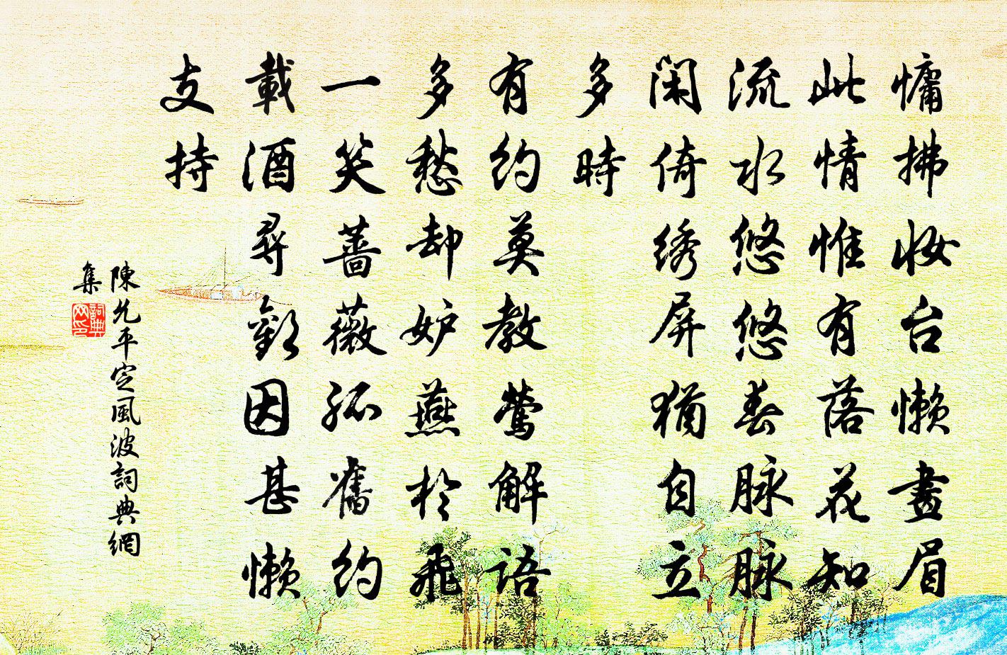 詩詞名句歷史字典書法欣賞書法字典國語詞典說文解字康熙字典古漢語字典標 題 作 者 詩 句 定風波作者:陳允平 朝代:宋代定風波原文慵拂妝檯懶畫眉。此情惟有落花知。流水悠悠春脈脈,閒倚繡屏,猶自立多時。有約莫教鶯解語,多愁卻妒燕于飛。一笑薔薇孤舊約,載酒尋歡,因甚懶支持。詩詞問答問:定風波的作者是誰?答:陳允平問:定風波寫於哪個朝代?答:宋代問:定風波是什麼體裁?答:詞陳允平定風波書法欣賞定風波書法作品詩詞推薦贈臧文仲四首陳造〔宋代〕理以定胡明,用智或成疎。芸芸自根求,一一皆我儲。飢{左米右備}渴須漿,水固不宜車。請君默自燭,是物誰再游雲門山寺李新〔宋代〕筠馬梯空正肉飛,山幽鳴鳥自聲微。地趨玉嶂新朝眼,岩織天花欲墜衣。雲木綢繆青羽葆,竇泉零落小珠現。重來子云兄命賦祿隱韓元吉〔宋代〕子牟居江湖,而有魏闕心。方朔待金馬,與世相浮沈。古為曠達士,豈必棲山林。吾兄官湖南,一室橫古今。朝披西街范祖禹〔宋代〕西街春日永,輦道與天通。御水橫銀漢,仙橋掛彩虹。草荒平樂館,花發上陽宮。擾擾都門路,輪蹄日向東。走筆成一篇答徐君先輩見寄強至〔宋代〕定交初何年,昔齒會稽學。君壯我尚少,道復先我覺。子時於眾人,百鳥一鸑鷟。學官程諸生,題品或義卓。眾方贈湖州張從事王禹偁〔宋代〕前年春牓亞龍頭,詞賦曾推第一流。上直未歸紅藥院,供吟先得白苹洲。酒醒野寺烹山蕨,公退溪亭狎海鷗。自是和張運使題長樂台陳襄〔宋代〕雲暗騶鳴出谷時,一方生齒庇餘輝。知君才業非張翰,莫為鱸魚有意歸。夜坐吟林一龍〔宋代〕山寒雨點半成雪,石冷泉流旋作冰。坐至夜分眠不得,熒然欲滅案頭燈。送張頡仲舉知奉新王安石〔宋代〕故人為邑士多稱,繇賦寬賒獄訟平。老吏閉門無重糈,荒山開隴有新粳。方揮玉麈日邊坐,又結銅章天外行。此去次韻潘茂洪春日書懷張鎡〔宋代〕東風漸放柳遮門,隔水人家聚似村。漁艇遠來夸甫里,僧隣閒過講慈恩。花繁慣識蜂情性,晝靜初聞燕語言。病起贈初上人張喬〔唐代〕竹色覆禪棲,幽禽繞院啼。空門無去住,行客自東西。井氣春來歇,庭枝雪後低。相看念山水,盡日話曹溪。送鈐轄館使王公高惟幾〔宋代〕遊宦俱為關外人,與君五看海棠春。園林選勝聊鑣遍,風月相思命駕頻。大斾先時辭蜀道,短轅何日見京塵。子矣陋居一首蘇籀〔宋代〕平生瓮牖蔀茆菁,江左那無雨土寧。遊宦飄然紆幕燕,陋居粗有讀書螢。浮生佛腳須當抱,亂世儒衣便欲停。天定約任千載大卿同王萬里楊仲博汎湖任賦二詩和魏了翁〔宋代〕滿目親朋似故鄉,夢邪非夢夢何長。春風坐上白雲屨,玉鑒光中明月璫。酒到湖山嫌遜避,話逢氣類省稱量。謝家閏正月三日偶書二首李覯〔宋代〕無賴年年逐酒徒,今年不飲興何如。醉鄉若有人名籍,但願春風點檢疏。寄題武陵柳氏所居二首其二康樂樓蘇轍〔宋代〕邑居欲盡溪山好,不作層樓無奈何。岩谷滿前收蠟屐,漪漣極目卷漁蓑。安心已得安身法,樂土偏令樂事多。千里豐乾寒拾贊釋心月〔宋代〕雙磵底,五峰前。塊石上,磨松煙。多無一兩字,少有三百篇,明明此意落誰邊。二靈寺守歲戴叔倫〔唐代〕守歲山房迥絕緣,燈光香灺共蕭然。無人更獻椒花頌,有客同參柏子禪。已悟化城非樂界,不知今夕是何年。憂心題天柱山圖戴叔倫〔唐代〕拔翠五雲中,擎天不計功。誰能凌絕頂,看取日升東。寄周表卿王洋〔宋代〕簿領正塵埃,天邊驛使來。姓名傳寶琰,朋舊集蘭台。始望豈及此,故人發在哉。曾陪丞相幕,撫事勿驚猜。名句推薦任憑弱水三千,我只取一瓢飲。曹雪芹《紅樓夢·第九十一回》 恨無千日酒,空斷九迴腸。劉彤《臨江仙·千里長安名利客》 昨夜星辰昨夜風,畫樓西畔桂堂東。李商隱《無題·昨夜星辰昨夜風》 可憐閨里月,長在漢家營。沈佺期《雜詩三首·其三》 雨後雙禽來占竹,秋深一蝶下尋花。文同《北齋雨後》 對聖賢言語,必要我平時照樣行去,才算讀書。王永彬《圍爐夜話·第二則》 水墨畫疏窗,孤影淡瀟湘。納蘭性德《木蘭花慢·立秋夜雨送梁汾南行》 江山如有待,花柳自無私。杜甫《後游》 俊眼修眉,顧盼神飛,文彩精華,見之忘俗。曹雪芹《紅樓夢·第三回》 黃師塔前江水東,春光懶困倚微風。杜甫《江畔獨步尋花·其五》