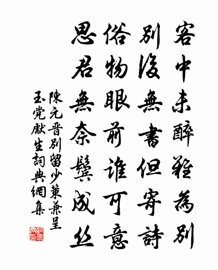 詩詞名句歷史字典書法欣賞書法字典國語詞典說文解字康熙字典古漢語字典標 題 作 者 詩 句 別留少策兼呈玉黨先生作者:陳元晉 朝代:宋代別留少策兼呈玉黨先生原文客中未醉難為別,別後無書但寄詩。俗物眼前誰可意,思君無奈鬢成絲。詩詞問答問:別留少策兼呈玉黨先生的作者是誰?答:陳元晉問:別留少策兼呈玉黨先生寫於哪個朝代?答:宋代陳元晉別留少策兼呈玉黨先生書法欣賞別留少策兼呈玉黨先生書法作品詩詞推薦季懷設醴且示佳篇再賦一章以酬五詠周必大〔宋代〕卯飲高樓徹暮霞,絕勝茅屋己公茶。篛包句好逢真賞,荷葉甌深稱嫩芽。詩老坐中容我輩,朝賢乞處藉君家。從來崇聖寺別楊至之許渾〔唐代〕蕭寺暫相逢,離憂滿病容。寒齋秋少燕,陰壁夜多蛩。樹暗水千里,山深雲萬重。懷君在書信,莫過雁回峰。送外龍輔〔宋代〕榜人檥舟待,催飯送郎行。獨諳郎食性,廚下自調羹。秋日四首宋祁〔宋代〕短影悠揚日,薄寒憀慄天。林聲蟬後老,陂影雁賓聯。悽感客自爾,變衰時適然。何須問容鬢,所遇是凋年。題余仲祥松齋裘萬頃〔宋代〕芳妍桃李場,紛趨欻成蹊。長松坐偃蹇,遂爾不見知。平生異時人,不與俗轉移。蕭然塵埃中,擅此丘壑奇。窗空河瀆神·風緊雁行高納蘭性德〔清代〕風緊雁行高,無邊落木蕭蕭。楚天魂夢與香消,青山暮暮朝朝。斷續涼雲來一縷,飄墮幾絲靈雨。今夜冷紅浦漵,宮詞王仲修〔宋代〕暑天何處避炎蒸,駕在蕭台第九層。黃蓋亭亭日將午,宮嬪催賜近臣冰。悼往黃庭堅〔宋代〕西風悲兮敗葉索索,照陳根兮秋日將落。彷佛兮夢與神遇,顧瞻九泉兮豈其可作。俄有悲乎之羽蟲兮,自傷時去物次王成之詠梅裘萬頃〔宋代〕誰遣冰魂照夕陽,搖搖一任北風涼。眼前共有幾多蕊,鼻觀胡為如此香。佳寶會須歸列鼎,孤標已自壓群芳。濡毫重到城七絕句。見元九白居易〔唐代〕容貌一日減一日,心情十分無九分。每逢陌路猶嗟嘆,何況今朝是見君。簡蘇邵叟陸游〔宋代〕君家文獻歷十朝,魏公峨冕加金貂。孫支得君愈雋發,貴名突兀凌煙霄。居吳入蜀三十載,諸公孰能折簡招。澗松懷遠人鮑溶〔唐代〕遠道在天際,客行如浮雲。浮雲不知歸,似我長望君。秋至漢水高,南音何時聞。瑤草難遠寄,西風氣氤氳。常恐陸務觀效孔方四舅氏體倒用二舅氏題雲門草堂曾幾〔宋代〕陸子家風有自來,胸中所患卻多才。學如大令倉盛筆,文似若耶溪轉雷。襟抱極知非世俗,簿書那解作氛埃。集賢洞仙歌謝懋〔宋代〕愁邊雨細。漠漠天如醉。搖揚遊絲晚風外。釀輕寒、和暝色,花柳難勝,春自老,誰管啼紅斂翠。關情潛入夜,斜送中洪邁〔宋代〕驕陽久 * ,一雨盪龜坼。田夫夢亦好,翻隴已幽咽。朝來喜相語,一飽心已決。翻翻風葉亂,嫋嫋露芒出。去年燭影搖紅 春日雨中袁易〔元代〕日日春陰,瑞香亭下寒成陣。鳳靴頻誤踏青期,寂寞牆陰徑。翠被堆床未整。睡初酣、風篁喚醒。幾多心緒,鵲語次韻王才少師雜花五首李彌遜〔宋代〕不禁花惱曲江頭,欲對清尊舞沐猴。留得春紅撩客恨,爭如庭草解忘憂。和答劉中叟殿院黃庭堅〔宋代〕平生劉宗正,聞有湖海氣。黃石與兵書,雷震鎖胸次。跨馬開武溪,韔弓作文吏。守祧仁九族,瑑玉詔萬世。去乘春日即事四絕王炎〔宋代〕年少逢春喜欲狂,長年心事易淒涼。胸中不可無今古,坐閱陳編自炷香。撥不斷·菊花開馬致遠〔元代〕菊花開,正歸來。伴虎溪僧、鶴林友、龍山客;似杜工部、陶淵明、李太白;有洞庭柑、東陽酒、西湖蟹。哎,楚名句推薦虛靜無事,以暗見疵。韓非及後人《韓非子·主道》 葉潤林塘密,衣乾枕席清。杜甫《水檻遣心二首》 人之敵,非奸亦奸;人之友,其奸亦忠。來俊臣《羅織經·察奸卷第八》 嗟萬事難忘,惟是輕別。周邦彥《浪淘沙慢·曉陰重》 此夜星繁河正白,人傳織女牽牛客。沈佺期《七夕曝衣篇》 敗不可處,時不可失,忠不可棄,懷不可從左丘明《國語·晉語·齊姜勸重耳勿懷安》 致治在於任賢,興國在於務農。陳壽《三國志·魏書·辛毗楊阜高堂隆傳》 燕支長寒雪作花,蛾眉憔悴沒胡沙。李白《王昭君二首》 鄉淚客中盡,孤帆天際看。孟浩然《早寒江上有懷 / 早寒有懷 / 江上思歸》 心事孤山春夢在,到思量、猶斷詩魂吳文英《極相思·題陳藏一水月梅扇》