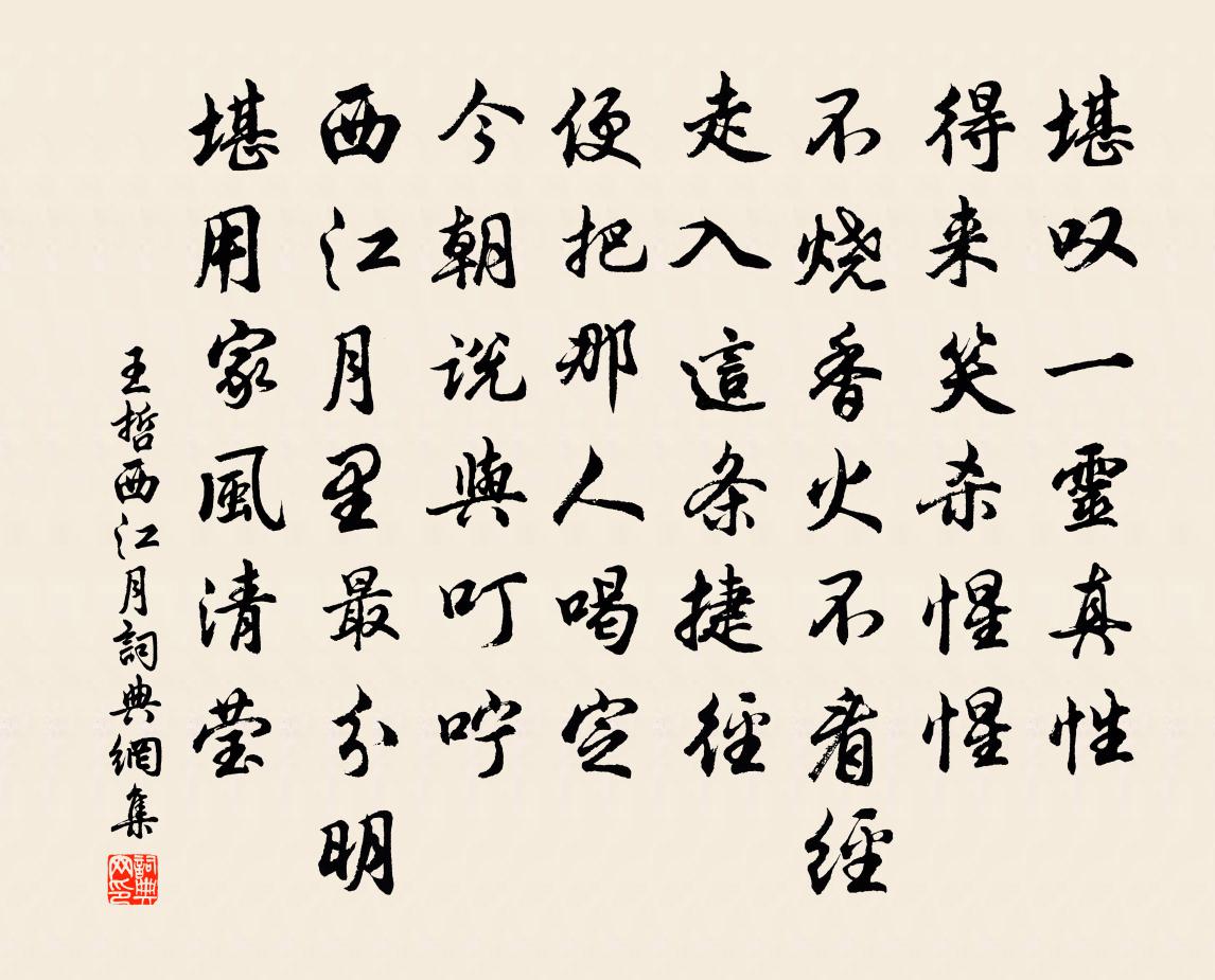 詩詞名句歷史字典書法欣賞書法字典國語詞典說文解字康熙字典古漢語字典標 題 作 者 詩 句 西江月作者:王哲 朝代:元代西江月原文堪嘆一靈真性。得來笑殺惺惺。不燒香火不看經。走入這條捷徑。便把那人喝定。今朝說與叮嚀。西江月里最分明。堪用家風清瑩。詩詞問答問:西江月的作者是誰?答:王哲問:西江月寫於哪個朝代?答:元代問:西江月是什麼體裁?答:詞王哲西江月書法欣賞西江月書法作品詩詞推薦岳陽樓別竇司直韓愈〔唐代〕洞庭九州間,厥大誰與讓。南匯群崖水,北注何奔放。瀦為七百里,吞納各殊狀。自古澄不清,環混無歸向。炎風冬夜即事呂溫〔唐代〕百憂攢心起復臥,夜長耿耿不可過。風吹雪片似花落,月照冰文如鏡破。高郵陳直躬處士畫雁二首蘇軾〔宋代〕野雁見人時,未起意先改。君從何處看,得此無人態。無乃槁木形,人禽兩自在。北風振枯葦,微雪落璀璀。慘澹句嚴中和〔宋代〕寺老柳遮塔,雨多春礙船。君不來方乾〔唐代〕遠路東西欲問誰,寒來無處寄寒衣。去時初種庭前樹,樹已勝巢人未歸。句李若水〔宋代〕半軒開萬象,一水斷雙峰。句羅椿〔宋代〕露濕看花腳,鶯啼欲曉山。和新鄉二十一兄華嚴水亭五首晃沖之〔宋代〕池水冷冷淥未深,叢篁低草背庭陰。晚來欲別龜魚去,更向軒 * 瞰臨。贊三十六祖頌釋印肅〔宋代〕國名常自在,王子摩拿羅。化鶴成菩薩,動止涌禪河。冬日放言二十一首張耒〔宋代〕寒羊肉如膏,江魚如切玉。肥兔與奔鶉,日夕懸庖屋。嬉嬉顧妻孥,滋味喉可欲。謫官但強名,比者何不足。寄遠釋智圓〔宋代〕車聲日日碾紅埃,何事良人獨未回。苔鎖洞房書久絕,月明深夜雁空來。寒侵竹葉難成醉,塵暗菱花更懶開。杳杳雲谷徐集孫〔宋代〕月浸千林萬壑秋,聽琴驚起鶴回頭。孤雲帶濕藏空谷,不逐人間富貴浮。題長安趙氏園晁說之〔宋代〕長安池館郁崢嶸,此地偏多客子情。秋晚寒藤侵石瘦,夜深熟果落池驚。後生解識南山趣,先德元高戎夏聲。感時李文饒一首劉克莊〔宋代〕畫取維州如槁葉,策禽潞將似嬰兒。九原精爽人猶畏,想見中書秉筆時。甲午七夕在京和朱子木韻李曾伯〔宋代〕巫雲一去付悠悠,堪笑星河老不休。天上淒涼兩魂夢,人間閱歷幾春秋。銷磨長恨詩難盡,領略良宵酒莫留。借我春日湖上五首釋斯植〔宋代〕繞堤莎草綠纖纖,老里吟情覺未厭。應是踏青天氣近,柳條多插野人檐。寄題吳介夫專壑七詠息庵劉學箕〔宋代〕日出機事生,日入群動息。吁嗟利名子,逐逐何所急。宿天童釋紹嵩〔宋代〕太白山頭月欲氏,鵲棲不穩繞枝飛。坐來客子渾忘倦,卻聽松聲聯翠微。峽中和卜彥才韻方逢振〔宋代〕尹躬樂不在耕莘,樂在明明以及民。貪看回頭多應錯,偶聞變色始知真。聖賢氣象心為大,天地根萌人是仁。認著子□林粹餉予雙雞劉克莊〔宋代〕空谷跫然聞足音,殷勤通守致家禽。陰晴不爽司晨□,□暮全無起舞心。夢短那堪眠警枕,脛長稍已怯□衾。可憐名句推薦取酒須勤醉,鄉關不可思。司馬光《送張寺丞覲知富順監》 兼相愛,交相利。墨子《墨子·15章 兼愛(中)》 雪滿山中高士臥,月明林下美人來。高啟《詠梅九首》 曉戰隨金鼓,宵眠抱玉鞍。李白《塞下曲六首·其一》 人生得意須盡歡,莫使金樽空對月。李白《將進酒》 平沙芳草渡頭村。綠遍去年痕。洪咨夔《眼兒媚·平沙芳草渡頭村》 枯木逢春猶再發,人無兩度再少年。佚名《增廣賢文·上集》 美惡既殊,情貌不一,有溫良而為詐者,有外恭而內欺者,有外勇而內怯者,有盡力而不忠者。諸葛亮《將苑·卷一·知人性》 此際閒愁郎不共,月移窗罅春寒重。王士禎《蝶戀花·和漱玉詞》 敕勒川,陰山下。天似穹廬,籠蓋四野佚名《敕勒歌》