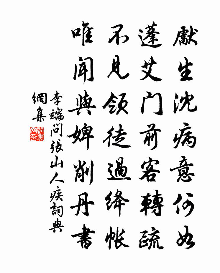 詩詞名句歷史字典書法欣賞書法字典國語詞典說文解字康熙字典古漢語字典標 題 作 者 詩 句 問張山人疾作者:李端 朝代:唐代問張山人疾原文先生沈病意何如,蓬艾門前客轉疏。不見領徒過絳帳,唯聞與婢削丹書。詩詞問答問:問張山人疾的作者是誰?答:李端問:問張山人疾寫於哪個朝代?答:唐代問:問張山人疾是什麼體裁?答:七絕李端問張山人疾書法欣賞問張山人疾書法作品注釋全唐詩:卷286_64詩詞推薦沁園春(閒居)王質〔宋代〕二百年間,十二時中,悲歡往來。但蓋頭一把,容身方丈,無多緣飾,莫遣塵埃。屈曲成幽,蕭條生淨,野草閒花古意十四首章雲心〔宋代〕百川畢東注,兩丸盡西頹。二物常汲汲,未嘗少徘徊。短生亦如斯,逝者良可哀。自昔青雲士,皆為黃土堆。何如雪夜獨宿柏仙庵蘇軾〔宋代〕晚雨纖纖變玉霙,小庵高臥有餘清。夢驚忽有穿窗片,夜靜惟聞瀉竹聲。稍壓冬溫聊得健,未濡秋旱若為耕。天公紫芝申之有月夜賡唱俾予續之蘇泂〔宋代〕樓高發興微,山水自清輝。有月略窺枕,無風時動扉。他生嫌火食,投老羨空飛。安得余盧趙,相從去不歸。藥名一絕洪皓〔宋代〕獨活他鄉已九秋,剛腸續斷更淹留。寧知老母相思子,沒藥醫治白盡頭。嘵望雲氣平凝前山遮盡僅餘翠峰數點因賦史彌寧〔宋代〕障山可奈白云何,露出峰尖能幾多。宛心群仵粉牆外,髻環歷歷見青螺。太府寺梅花盛開和曾玉堂韻二首李曾伯〔宋代〕姑射丰標慣野塘,不虞水部入佳章。雪邊未了孤山約,盡有春風一面妝。聽角思歸顧況〔唐代〕故園黃葉滿青苔,夢破城頭曉角哀。此夜斷腸人不見,起行殘月影徘徊。漁家傲方千里〔宋代〕冷葉啼螿聲惻惻。銀床曉起清霜積。魂斷江南煙水國。書難得。相思此意無人識。綠鬢金釵年少客。愁來懶傍菱花秋思陸游〔宋代〕水際柴門一扇開,白頭羸病亦堪哀。阿誰得似桄榔杖,肯為閒人萬里來?感皇恩(中外三人受封)程大昌〔宋代〕中外受郊恩,三封綸告。依並小君出稱號。錦犀光艷,不比香薰脂膏。況從鳴瑟里,添花草。更願天公,別施洪造人日重宴大明宮恩賜彩縷人勝應制鄭愔〔唐代〕瓊殿含光映早輪,玉鸞嚴蹕望初晨。池開凍水仙宮麗,樹發寒花禁苑新。佳氣裴回籠細網,殘霙淅瀝染輕塵。良時月下杲飲七首楊萬里〔宋代〕人靜更深丈室虛,欲眠聊復小踟躕。竹床最冷也成熱,羽扇不涼差勝無。樂飲王洋〔宋代〕何意親杯杓,初期樂性真。若教狂勝德,多被酒忘身。談笑交情密,氤氳酒力醇。勸酬如錯雜,莫過兩三巡。鉛山喻良能〔宋代〕三月春風暖更飄,滿山嫩綠正嬌嬈。幾聲勸我脫破袴,何處撩人婆餅焦。甘旨僅能供素髮,涓埃未有答皇朝。吾廬頌一百則釋重顯〔宋代〕活中有眼還同死,藥忌何須鑒作家。古佛尚言曾未到,不知誰解撒塵沙。初到績溪視事三日出城南謁二祠游石照偶成四蘇轍〔宋代〕石門南出眾山巔,沃壤清溪自一川。老令舊諳田事樂,春耕正及雨晴天。可憐鞭撻終無補,早向叢祠乞有年。歸告巫山一段雲 贈龍虎夫人尹志平〔元代〕北海功還未,赤城行已周。一身清靜永忘憂。何處得閒愁。四十天當不惑。事事諳來明白。樂知知命保全和。真理翔泳堂即景釋行海〔宋代〕一池荷蓋綠陰涼,數朵紅蕖浥露香。最是畫橋林薄外,滿湖煙景淡斜陽。謁陸宣公雙湖新祠錢時〔宋代〕奏稿倘能安國步,投荒何敢愛家林。雙湖萬頃湖天月,長與先生照赤心。名句推薦洞房昨夜停紅燭,待曉堂前拜舅姑。朱慶餘《近試上張籍水部 / 近試上張水部 / 閨意獻張水部》 天秋日正中,水碧無塵埃。柳宗元《湘口館瀟湘二水所會》 誰憐散髻吹笙,天涯芳草關情。納蘭性德《清平樂·孤花片葉》 長江春水綠堪染,蓮葉出水大如錢。張籍《春別曲》 謀先事則昌,事先謀則亡。劉向《說苑·談叢》 飛蓬各自遠,且盡手中杯。李白《魯郡東石門送杜二甫》 路人借問遙招手,怕得魚驚不應人。胡令能《小兒垂釣》 斜髻嬌娥夜臥遲,梨花風靜鳥栖枝。唐寅《美人對月》 貨盡而後知不足,是不知量也,事已,而後知貨之有餘,是不知節也管仲《管子·乘馬》 善者不辯,辯者不善。老子《老子·德經·第八十一章》