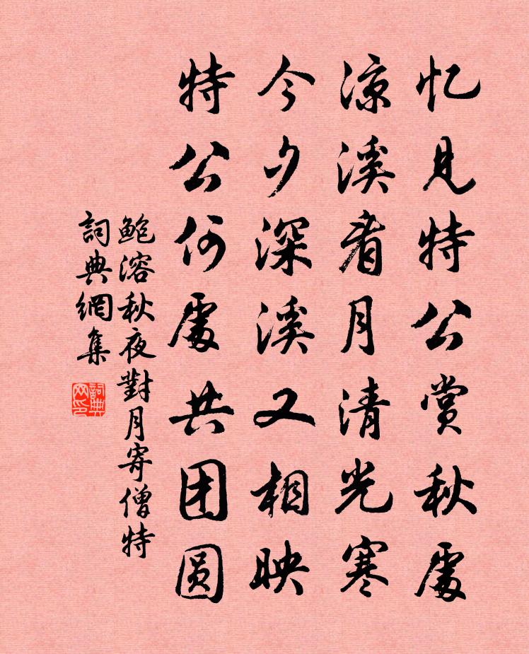詩詞名句歷史字典書法欣賞書法字典國語詞典說文解字康熙字典古漢語字典標 題 作 者 詩 句 秋夜對月寄僧特作者:鮑溶 朝代:唐代秋夜對月寄僧特原文憶見特公賞秋處,涼溪看月清光寒。今夕深溪又相映,特公何處共團圓。詩詞問答問:秋夜對月寄僧特的作者是誰?答:鮑溶問:秋夜對月寄僧特寫於哪個朝代?答:唐代鮑溶秋夜對月寄僧特書法欣賞秋夜對月寄僧特書法作品詩詞推薦題張曲江像宋孝宗〔宋代〕鹿入深宮花解愁,牛登高鼎餗傷休。當時若聽履霜語,豈到峨嵋山盡頭。阮郎歸孫惟信〔宋代〕滿階紅影月昏黃,玉爐催換香。碧窗嬌困懶梳妝。粉沾金縷裳。鸞髻聳,黛眉長。燭光分兩行。許誰騎鶴上維揚。寒夜張明府宅宴孟浩然〔唐代〕瑞雪初盈尺,寒宵始半更。列筵邀酒伴,刻燭限詩成。香炭金爐暖,嬌弦玉指清。醉來方欲臥,不覺曉雞鳴。舜泉曾鞏〔宋代〕山麓舊耕迷故壟,井幹余汲見飛泉。清涵廣陌能成雨,冷浸平湖別有天。南狩一時成往事,重華千古似當年。更應題懷秀堂裘萬頃〔宋代〕莫教滿地長莓苔,杖屨從今日日來。曲徑要隨松巷轉。柴門須對石橋開。牆頭花木因時種,案上圖書任意堆。幸有和魏元明四月菊黃榦〔宋代〕鵜鴃才鳴歇眾芳,忽看佳菊變秋光。江頭雨漲梅同游,隴上風情麥正黃。莫等重陽拚一醉,不愁長夏日微涼。籬根上元夜作王禹偁〔宋代〕去年正月十五夜,乾元門上奉乘輿。今年正月十五夜,商洛郡中為貳車。謫宦門欄偏冷落,山城燈火苦蕭疏。爐灰賢者之孝二百四十首樂正子春林同〔宋代〕向非親在念,念念每精專。未必飯加損,能令疾脫然。減字木蘭花王千秋〔宋代〕陰檐雪在。小雨廉纖寒又。莫上危樓。樓迥空低雁更愁。一杯濁酒。萬事世間無不有。待早歸田。欲買田無使鬼春水杜甫〔唐代〕三月桃花浪,江流復舊痕。朝來沒沙尾,碧色動柴門。接縷垂芳餌,連筒灌小園。已添無數鳥,爭浴故相喧。洄溪閣喻良能〔宋代〕十尋傑閣倚雲隈,淡靄輕煙照眼來。山色不隨天際遠,溪流長為水深回。溪村即事二首王鎡〔宋代〕村村綠樹起青煙,隔岸行人叫渡船。昨夜不知何處雨,水推枯葉出溪邊。婆羅門引(春情)嚴仁〔宋代〕花明柳暗,一天春色繞朱樓。斷鴻聲喚人愁。欲問歸鴻何處,身世自悠悠。正東風留滯,楚尾吳頭。追思舊遊。嘆聞子瞻將如終南太平宮溪堂讀書蘇轍〔宋代〕為吏豈厭事,厭事日墮媮。著書雖不急,實與百世謀。問吏所事何,過客及繫囚。客實虛攪人,囚有不自由。辦之偈頌六十七首釋原妙〔宋代〕呱聲未絕便稱尊,攪得三千海岳昏。惡水一年澆一度,知他雪屈是酬恩。筋竹這新居僧居邠錄寄寺中留題次孫溫叟所用趙蕃〔宋代〕夢向清江不見涯,覺來身乃太行車。新居寄我山中集,倦枕渾忘午後茶。愛此好風當北牖,待來明月望西斜。但憐奉和張燕公早霽南樓趙冬曦〔唐代〕方曙躋南樓,憑軒肆遐矚。物華盪暄氣,春景媚晴旭。川霽湘山孤,林芳楚郊縟。列岩重疊翠,遠岸逶迤綠。風帆九鎖山十詠丹泉呂同老〔宋代〕觱沸檻外泉,遠出天柱陽。清音映空谷,潛波渙寒塘。昔人養靈芝,長年此山旁。金骨換玉髓,素虬朝紫皇。尚余題喻氏萬卷樓趙蕃〔宋代〕今人藏書務書多,昔人讀書病書少。藏書不讀竟何用,歲老財供蠹魚齩。俞君命意何其賢,藏書讀書兩相兼。有樓哨遍李曾伯〔宋代〕天限長江,雲擾中原,一局持棋勢。漢將誰。盍為掃清之。彼伎猶、黔驢而止。客亦知。何材不生斯世。丁寧屢費名句推薦窗間梅熟落蒂,牆下筍成出林。范成大《喜晴》 春風依舊。著意隨堤柳。趙令畤《清平樂·春風依舊》 蟬鳴空桑林,八月蕭關道。王昌齡《塞下曲四首》 愁與西風應有約,年年同赴清秋。史達祖《臨江仙·閨思》 不患位之不尊,而患德之不崇范曄《後漢書·列傳·張衡列傳》 積善三年,知之者少,為惡一日,聞於天下。房玄齡《晉書·帝紀·第一章》 願君多採擷,此物最相思。王維《相思》 戰必覆人之軍,攻必凌人之城。商鞅《商君書·賞刑》 今夕何夕,見此良人?佚名《綢繆》 霧失樓台,月迷津渡。秦觀《踏莎行·郴州旅舍》