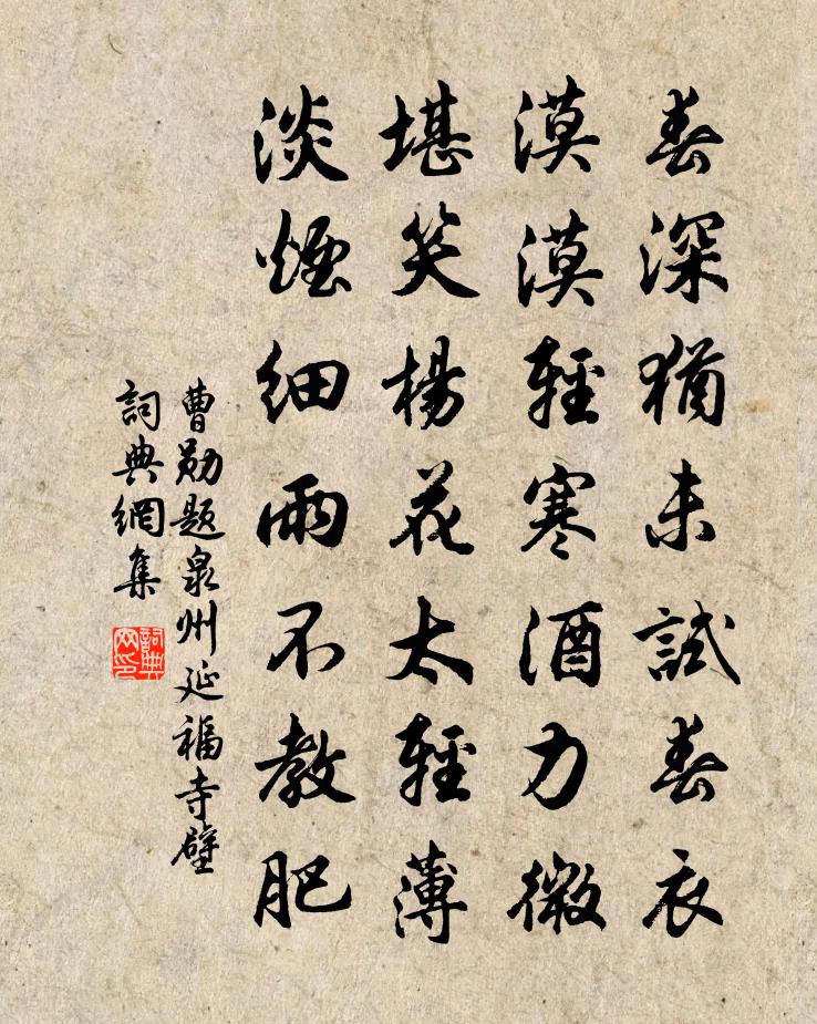 詩詞名句歷史字典書法欣賞書法字典國語詞典說文解字康熙字典古漢語字典標 題 作 者 詩 句 題泉州延福寺壁作者:曹勛 朝代:宋代題泉州延福寺壁原文春深猶未試春衣,漠漠輕寒酒力微。堪笑楊花太輕薄,淡煙細雨不教肥。詩詞問答問:題泉州延福寺壁的作者是誰?答:曹勛問:題泉州延福寺壁寫於哪個朝代?答:宋代曹勛題泉州延福寺壁書法欣賞題泉州延福寺壁書法作品詩詞推薦憩靈隱寫懷釋紹嵩〔宋代〕莫恨征途遠,題詩記獨游。十年行路飽,萬里此生浮。宇宙知何極,山川慰久留。倚欄喔五字,不覺散人愁。鷓鴣天侯置〔宋代〕蜀錦吳綾剪染成。東皇花令一番新。風簾不礙尋巢燕,雨葉偏禁鬥草人。非病酒,不關春。恨如芳草思連雲。西樓送悅心北上陳深〔宋代〕便乘天驥上通逵,笑拂吳鈞氣益奇。徐庶交遊盡名士,王維才藝重當時。西風星斗寒芒動,落日川原秋興悲。莫向乙丑中秋與山僧數輩自虎邱靈岩泛太湖登洞庭史堯弼〔宋代〕海門湖上東畔開,海東飛仙呼不來。乘桴便欲徑浮去,無人從我復空回。扇子詩李石〔宋代〕蘄竹皮膚事業,齊統手腕工夫。跳出二乘火宅,直饒一段水壺。西峰院林嗣復〔宋代〕參遍曹溪眾所欽,玄堂虛寂砌蟲吟。定回瞑目誰相顧,好鳥銜花下翠林。浣溪沙(再用韻)吳潛〔宋代〕海棠已綻牡丹芽,猶有東君向上花。不須惆悵怨春華。裝綴園林新景物,推敲風月舊情懷。也饒浪蕊與浮葩。簡寂觀作孫邁〔宋代〕松接朝天路,鍾聞賈客船。醮壇秋有月,丹井古無泉。見京兆韋參軍量移東陽其一李白〔唐代〕潮水還歸海,流人卻到吳。相逢問愁苦,淚盡日南珠。聞說金華渡,東連五百灘。全勝若耶好,莫道此行難。猿嘯立春日雨陳與義〔宋代〕衡山孫下春日雨,遠映青山絲樣斜。容易江邊欺客袂,分明沙際濕年華。竹林路隔生新水,古渡船空集亂鴉。未暇韓漳州書報徹上人亡因寄二絕柳宗元〔唐代〕早歲京華聽越吟,聞君江海分逾深。他時若寫蘭亭會,莫畫高僧支道林。頻把瓊書出袖中,獨吟遺句立秋風。桂江關下崔道融〔唐代〕百二山河壯帝畿,關門何事更開遲。應從漏卻田文後,每度聞雞不免疑。送進士苗縱歸紫邏山居司馬扎〔唐代〕汝上多奇山,高懷愜清境。強來乾名地,冠帶不能整。常言夢歸處,泉石寒更靜。鶴聲夜無人,空月隨松影。今朝劉公佐親家奉議輓詞二首楊萬里〔宋代〕一命華其老,諸昆半作官。相高仍孝悌,不但盛衣冠。近別那雲訣,臨喪獨忍看。心知公不恨,我自淚難乾。挽修撰先生何元泰〔宋代〕在昔虞庠日,嘗陪陳少陽。詞傾三峽水,忠烈九秋霜。藥石塵丹扆,琅玕寶皂囊。後來門下士,多有紫薇郎。王文恭公輓詞二首黃庭堅〔宋代〕宥密深黃閣,光輝極上台。藏舟移夜壑,華屋落泉台。雨紼誰為挽,寒笳故作哀。傷心具瞻地,無復袞衣來。蛇銜草佚名〔〕昔有田夫耕地,值見傷蛇在焉。頃之,有一蛇銜草著傷口上,經日創蛇走。田夫取其餘葉治傷,皆驗。本不知草名薄薄酒二章黃庭堅〔宋代〕薄酒可與忘憂,醜婦可與白頭。徐行不必駟馬,稱身不必狐裘。無禍不必受福,甘餐不必食肉。富貴於我如浮雲,揚州過雪呈祝靜得二首黎廷瑞〔宋代〕玉佩珊珊怯暮寒,青霄夜半躡飛鸞。真妃似念尋芳晚,別剪瓊花與客看。即目歐陽修〔宋代〕李徑陰森接翠疇,押簾風日澹清秋。晚烏藏柳棲殘照,遠燕傷風失故樓。星漢經年雖可望,雲波千疊不緘愁。平居名句推薦美人慵翦上元燈,彈淚倚瑤瑟。朱敦儒《好事近·春雨細如塵》 同穴窅冥何所望,他生緣會更難期。元稹《遣悲懷三首·其三》 當年得意如芳草。日日春風好。辛棄疾《虞美人·賦虞美人草》 閏余成歲,律呂調陽。周興嗣《千字文·全文》 金鞍玉勒尋芳客,未信我廬別有春。于謙《觀書》 聞誅一夫紂矣,未聞弒君也。孟子《孟子·梁惠王章句下·第八節》 仙佛茫茫兩未成,只知獨夜不平鳴。黃景仁《雜感》 銜霜當路發,映雪擬寒開。何遜《詠早梅 / 揚州法曹梅花盛開》 大人者,不失其赤子之心者也。孟子《孟子·離婁章句下·第十二節》 思親堂上茱初插,憶妹窗前句乍裁。秋瑾《九日感賦》