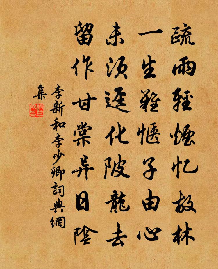 詩詞名句歷史字典書法欣賞書法字典國語詞典說文解字康熙字典古漢語字典標 題 作 者 詩 句 和李少卿作者:李新 朝代:宋代和李少卿原文疏雨輕煙憶故林,一生難愜子由心。未須逕化陂龍去,留作甘棠異日陰。詩詞問答問:和李少卿的作者是誰?答:李新問:和李少卿寫於哪個朝代?答:宋代李新和李少卿書法欣賞和李少卿書法作品詩詞推薦浣溪沙陳亮〔宋代〕小雨翻花落畫檐。欄堂香注酒重添。花枝能語出朱簾。緩步金蓮移小小,持杯玉筍露纖纖。此時誰不醉厭厭。謝侃老送苦筍袁說友〔宋代〕籜老泯黃千仞種,箇中風味亦佳哉。誤人政為甘言誘,愛我從渠苦口來。蘇武慢 贈徐伯樞謝應芳〔元代〕蘭雪衣衿,芝雪冠佩,*唾動成珠玉。芳草萋迷,蓬萊杳渺,皎皎白駒空谷。濯發滄洲,怡顏芳樹,樂甚從伶絲竹讀書樓二首洪咨夔〔宋代〕流水青山一榻深,銅柯石榦半窗陰。公餘點校七分易,老去服行三字箴。消長乘除觀物理,存亡操舍驗人心。日長撥置吏牘再作一詩以酬相惱之什蔡戡〔宋代〕朝來衙集事還生,不覺文書几上盈。顧我塵埃敗佳思,羨君心跡得雙清。也知靜色撩詩興,無奈蕪辭愧俊英。得句蝶戀花方千里〔宋代〕翠浪藍光新雨後。整整斜斜,高下籠窗牖。萬斛深傾重碧酒。量愁知落何人手。櫳霧梳煙晴色透。照影迴風,一段再次韻四首陳造〔宋代〕公朝已後茹茅連,幕府偷閒亦所天。寵辱肯為差別觀,道人隨寓只怡然。寄宇文邛州張栻〔宋代〕寄語臨邛守,相望萬里情。有來詩句好,足驗教條清。好古從時訕,為邦已政成。無尋子虛賦,忠厚詔諸生。冬日放言二十一首張耒〔宋代〕寒羊肉如膏,江魚如切玉。肥兔與奔鶉,日夕懸庖屋。嬉嬉顧妻孥,滋味喉可欲。謫官但強名,比者何不足。懷趙德懷戴復古〔宋代〕所學源流遠,澹交滋味長。看來渾易與,別去自難忘。獨客夢千里,佳人天一方。細觀賓退錄,亦足慰淒涼。連江官湖徐璣〔宋代〕眾山圍繞淥團圓,官木參差古道邊。行飛濃陰全不了,一湖飛雨帶輕煙。挽林通判德溥林光朝〔宋代〕豈為長者畏時名,梁楚何從得此聲。只隔螺江衣帶水,自應別駕舊廉平。應天長(花港觀魚)張矩〔宋代〕岸容浣錦,波影墮紅,纖鱗巧避鳧唼。禹浪未成頭角,吞舟膽猶怯。湖山外,江海匝。怕自有、暗泉流接。楚天遠閉戶袁說友〔宋代〕戶屨無人滿,庭羅盡日張。閒窗書白羽,清夢熟黃粱。瓦瓮苕溪淥,銅爐柏子香。出門本無礙,龜穴慣深藏。秋夜紀懷陸游〔宋代〕缺月淡欲盡,老雞鳴苦遲。聊為待旦坐,不作感秋悲。魯叟一王法,豳人七月詩。平生經世志,老死欲誰期?次韻弟茝醉中示弟觀二首為弟茝道陳著〔宋代〕斑發朱顏楚秀翁,陶陶樂意與天融。凌虛長嘯天無際,耐靜高眠日過中。茅屋生涯消幾許,梅花氣味最相通。詩書翠蛟亭怡然〔宋代〕縈紆九鎖山,稜層幾疊水。誰令翻其源,銀濤迸石髓。宿楊家白居易〔唐代〕楊氏弟兄俱醉臥,披衣獨起下高齋。夜深不語中庭立,月照藤花影上階。頌古十三首釋德光〔宋代〕喪盡生涯賣笊籬,白拈火里討便宜。看來枝節只如此,也道心空及第歸。過雲木冰記黃宗羲〔清代〕歲在壬午,余與晦木澤望入四明,自雪竇返至過雲。雰靄淟濁,蒸滿山谷,雲亂不飛,瀑危弗落,遐路窈然。夜行名句推薦學然後知不足,教然後知困。戴聖《禮記·學記》 君在天一涯,妾身長別離。江淹《古離別》 我寄愁心與明月,隨君直到夜郎西。李白《聞王昌齡左遷龍標遙有此寄》 惟將終夜常開眼,報答平生未展眉。元稹《遣悲懷三首·其三》 為有雲屏無限嬌,鳳城寒盡怕春宵。李商隱《為有》 白水明田外,碧峰出山後。王維《新晴野望》 有為者辟若掘井,掘井九軔而不及泉,猶為棄井也。孟子《孟子·盡心章句上·第二十九節》 日落君山雲氣,春到沅湘草木,遠思渺難收。張孝祥《水調歌頭·過岳陽樓作》 渭北春天樹,江東日暮雲。杜甫《春日憶李白》 忍淚佯低面,含羞半斂眉。韋莊《女冠子·四月十七》