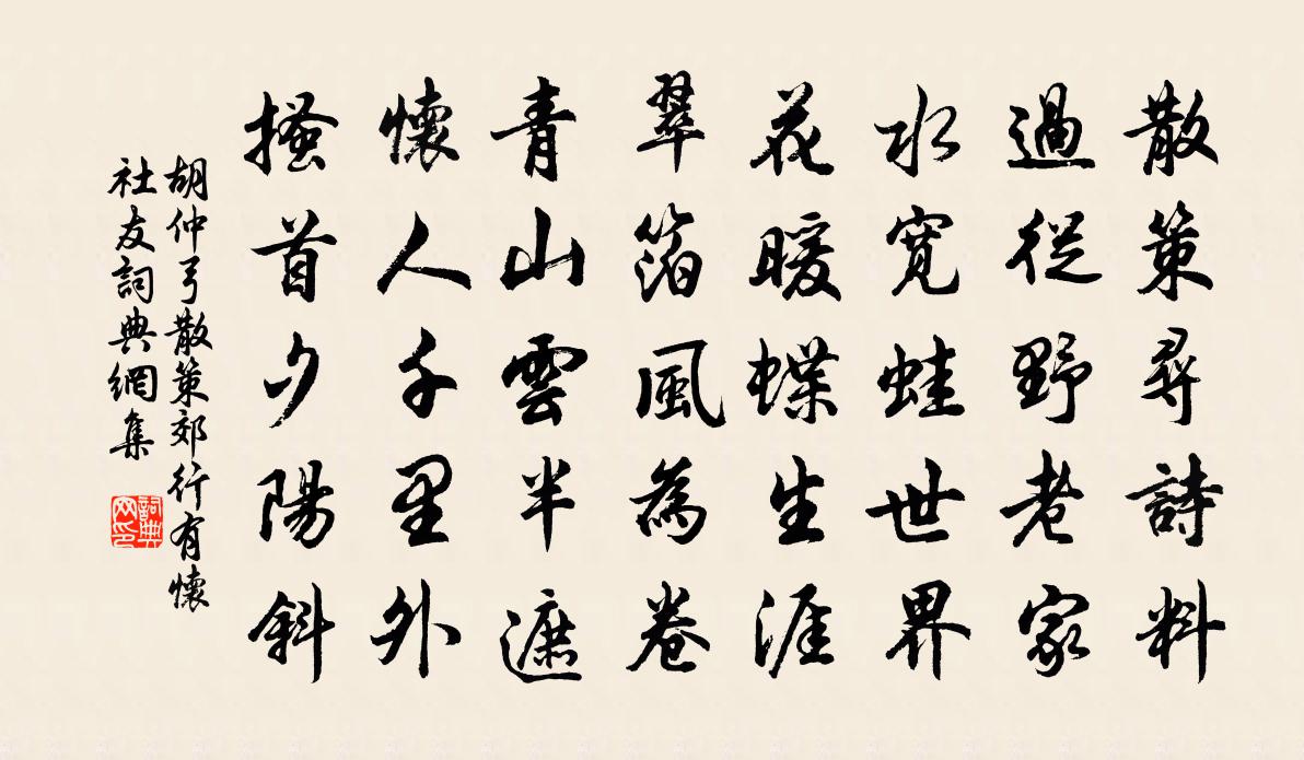 詩詞名句歷史字典書法欣賞書法字典國語詞典說文解字康熙字典古漢語字典標 題 作 者 詩 句 散策郊行有懷社友作者:胡仲弓 朝代:宋代散策郊行有懷社友原文散策尋詩料,過從野老家。水寬蛙世界,花暖蝶生涯。翠箔風為卷,青山雲半遮。懷人千里外,搔首夕陽斜。詩詞問答問:散策郊行有懷社友的作者是誰?答:胡仲弓問:散策郊行有懷社友寫於哪個朝代?答:宋代胡仲弓散策郊行有懷社友書法欣賞散策郊行有懷社友書法作品詩詞推薦百字令/念奴嬌東岡〔宋代〕排雲拓月,向天上移下,神仙華屋。畫棟飛檐千萬落,黼黼城南喬木。出谷鶯遷,趨庭燕爾,袍綰登科綠。嫦娥分汲江煎茶蘇軾〔宋代〕活水還須活火煮,自臨釣石取深清[1]:大瓢貯月歸春瓮,小杓分江入夜瓶。雪乳已翻煎處腳[2],松風忽作和昌言官舍十題萱草司馬光〔宋代〕葉濯宿露翠,花迎朝日黃。昔誰封殖此,儼列侍高堂。達士隱於吏,孰為行與藏。逍遙玩永日,自無憂可忘。即席用委順聽甘師琴韻蒲壽宬〔宋代〕獨抱琴聲感歲年,冥搜趣外欲無弦。廣陵寂寂嵇生去,秋水幽幽鳴犢賢。一點山泉岩竇雨,數聲瑤佩泬寥天。音徽蘭畹曾幾〔宋代〕深林以薌名,花木不知數。一點無俗氛,蘭芽在幽處。與歐陽伯威同飲遇卿江樓趙蕃〔宋代〕不上江樓又兩春,人間到處略知津。勞君置酒仍呼客,快語端能洗劫塵。春夜雪再用韻十首楊公遠〔宋代〕詩夢關情草滿池,東皇已向歲前歸。怪渠楊柳搖金未,底事漫空絮便飛。古意王安石〔宋代〕采芝天門山,寒露淨毛骨。帝青九萬里,空洞無一物。傾河略西南,昌射河鼓沒。蓬萊眼中見,人世嘆超忽。當時書第二考劉克莊〔宋代〕兵去未妨行酒令,印收不礙掌詩權。只嫌海嶠登臨少,夢繞朱陵紫蓋邊。和符君俞卜鄰楊萬里〔宋代〕朱崖柳 * 春風,庾嶺梅花尚雪容。念子南歸騎瘦馬,只今誰解好真龍。吾鄉端是山水窟,何日來同丘岳胸。白鷺喜屯田凌員外至宋祁〔宋代〕昔歲裁詩送為郡,今年把袂喜還台。遒妍賦筆悲秋罷,寂寞衣囊被謗回。勁節肯凋霜外葉,驚湍須畏岸前堆。撫塵故相少師李公輓詩李彌遜〔宋代〕白髮陳雷舊,交情貴不渝。詩箋留曉炬,書雁聚春蘆。憂國言猶在,知心道子孤。江皋一襟淚,不復見夷吾。圓通張伯端〔宋代〕見了真空空不空,圓明何處不圓通。根塵心法都無物,妙用方知與物同。建元寺晝公與崔秀才見過聯句,與鄭奉禮說同作皇甫曾〔唐代〕人閒宜歲晚,道者訪幽期。獨與寒山別,行當暮雪時。 ——皇甫曾柏台辭漢主,竹寺寄潛師。荷登彼公堂燕貢士陳襄〔宋代〕登彼公堂,鴻飛戾止。君子燕湑,維其不已。曉坐釋文珦〔宋代〕夢破不成寐,茅齋坐清曉。他山已擊鐘,獨樹初啼鳥。四體既調柔,眾境亦深窈。素書未終軸,朝光射林杪。任性蝶戀花何大圭〔宋代〕魚尾霞收明遠樹。翠色黏天,一葉迎風舉。一笑相逢蓬海路。人間風月如塵土。翦水雙眸雲鬢吐。醉倒天瓢,笑語避方寇五絕鄭剛中〔宋代〕朝廷平日祗尊儒,文武於今遂兩途。聞說官軍又旗靡,誰收黃石老人書。暮春杜甫〔唐代〕臥病擁塞在峽中,瀟湘洞庭虛映空。楚天不斷四時雨,巫峽常吹千里風。沙上草閣柳新暗,城邊野池蓮欲紅。暮春賀鄭丞相厲寺正〔宋代〕瑞應金穰均禹甸,一邊洗甲誰言戰。關河豈但犬羊奔,郊藪殆將麟鳳見。名句推薦桑之未落,其葉沃若。佚名《氓》 碧蕪千里思悠悠,惟有霎時涼夢、到南州。李廌《虞美人·玉闌乾外清江浦》 老來疾病都是壯時招得;衰時罪孽都是盛時作得。洪應明《菜根譚·概論》 數年來往鹹京道,殘杯冷炙謾消魂晏殊《山亭柳·贈歌者》 匹馬南來渡浙河,汴城宮闕遠嵯峨。于謙《岳忠武王祠》 君不肖,則國危而民亂,君賢聖則國安而民治,禍福在君不在天時。姜子牙《六韜·文韜·盈虛》 君不見管鮑貧時交,此道今人棄如土。杜甫《貧交行》 江水漾西風,江花脫晚紅。王安石《江上》 錦里開芳宴,蘭缸艷早年。盧照鄰《十五夜觀燈》 冀枝葉之峻茂兮,願俟時乎吾將刈。屈原《離騷》