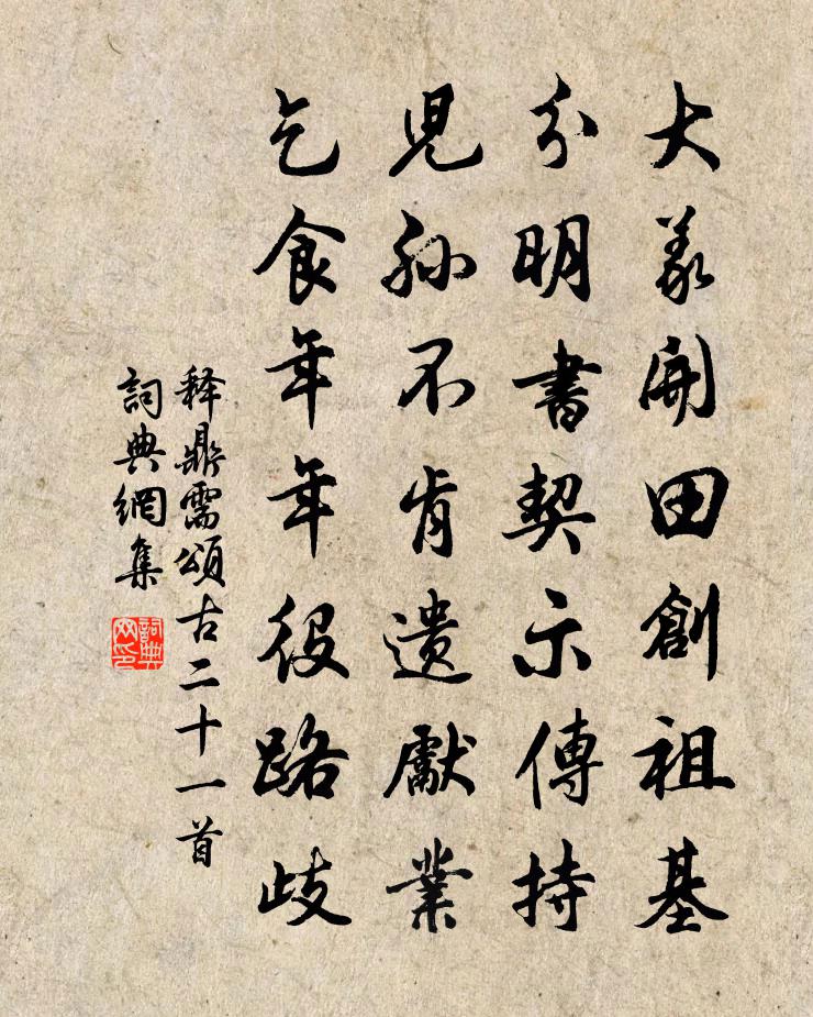 詩詞名句歷史字典書法欣賞書法字典國語詞典說文解字康熙字典古漢語字典標 題 作 者 詩 句 頌古二十一首作者:釋鼎需 朝代:宋代頌古二十一首原文大義開田創祖基,分明書契示傳持。兒孫不肯遺先業,乞食年年役路歧。詩詞問答問:頌古二十一首的作者是誰?答:釋鼎需問:頌古二十一首寫於哪個朝代?答:宋代釋鼎需頌古二十一首書法欣賞頌古二十一首書法作品詩詞推薦對雪二首宋祁〔宋代〕縈叢著樹半瀟瀟,皓氣妍華混泬寥。為倚風流偏解舞,故藏朝晛未成消。玉繩四徹仙峰迥,銀界三千佛國遙。向曙次韻泛舟仲秉有詩馮伯規〔宋代〕且喜山城未傍邊,漫從錦水學游舡。何時官晨真無事,是處壺中別有天。豈復江湖增遠興,強憑絲竹寫中年。接?和聶之美雞澤官舍詩七首葦司馬光〔宋代〕索索夕風遒,渡瀼瀼朝露哀。啅雀裊寒枝,宿螢依敗葉。眇然秋興長,坐與江潮接。木蘭花慢(為同年趙必達壽)黃機〔宋代〕亶文王前子,自不與、世人同。況地望既華,天資更偉,雲驥行空。年少才名蜚動,泛星槎、曾到廣寒宮。桂子香四安道中所見牟巘五〔宋代〕千顆豐融怕日侵,楮生調護貴於金。直須待折囊封了,方見冰霜一片心。過櫟陽山谿陳羽〔唐代〕眾草穿沙芳色齊,蹋莎行草過春溪。閒雲相引上山去,人到山頭雲卻低。點絳唇陳允平〔宋代〕分袂情懷,快風一箭輕帆舉。暮煙雲浦。芳草斜陽路。輸與閒鷗,朝暮潮來去。空凝佇。小橋樊素。金屋春深處。梅花喜神譜欲謝一十六枝宋伯仁〔宋代〕一夢在人間,東風吹不覺。莊周鴻冥冥,胡戀花枝巧。滿江紅(都下作)袁去華〔宋代〕社雨襯晴,煙光暖、吳山滴翠。望絳闕、祥雲虧蔽,粉垣千雉。萬柳低垂春似酒,微風不動天如醉。遍萬井、嬉嬉同群公十月朝宴李太守宅高適〔唐代〕良牧征高賞,褰帷問考槃。歲時當正月,甲子入初寒。已聽甘棠頌,欣陪旨酒歡。仍憐門下客,不作布衣看。屈原塔在忠州,原不當有塔於此,意者後人蘇軾〔宋代〕楚人悲屈原,千歲意未歇。精魂飄何處,父老空哽咽。至今滄江上,投飯救饑渴。遺風成競渡,哀叫楚山裂。屈原溫泉羅鄴〔唐代〕一條春水漱莓苔,幾繞玄宗浴殿回。此水貴妃曾照影,不堪流入舊宮來。淨光山四詠呈水心先生宿覺庵徐照〔宋代〕公說曹溪事,經今六百年。庵基平地築,碑記遠人傳。種竹初遮日,蔬岩只欠泉。自當居鼎鼐,豈在學修禪。孔雀薛能〔唐代〕偶有功名正俗才,靈禽何事降瑤台。天仙黼黻毛應是,宮後屏幃尾忽開。曾處嶂中真霧隱,每過庭下似春來。佳人禱雨報恩到翟園四首楊萬里〔宋代〕霧氣初迎日腳開,春光偏傍柳邊回。寒暄訊息何人會?十拂今朝出袖來。送人東歸溫庭筠〔唐代〕荒戍落黃葉,浩然離故關。高風漢陽渡,初日郢門山。江上幾人在,天涯孤棹還。何當重相見,樽灑慰離顏。養氣陸游〔宋代〕學道先養氣,吾聞三住章。屏除金鼎藥,糠秕玉函方。凜凜春冰履,兢兢拱璧藏。高談忘力守,此病最膏肓。寒夜讀書陸游〔宋代〕北窗暖焰滿爐紅,夜半濤翻古檜風。老死愛書心不厭,來生恐墮蠹魚中。赤壁鄭獬〔宋代〕帳前斫案決大議,赤壁火船燒戰旗。若使曹公忠漢室,周郎爭敢破王師。熙寧以後祀高禖六首佚名〔宋代〕昔帝高辛,先禖筆祀。爰揆仲陽,式祈嘉祉。陳之科牲,授以弓矢。敷祐皇宗,施於孫子。名句推薦歸雁橫秋,倦客思家。張可久《折桂令·九日》 甚時躍馬歸來,認得迎門輕笑。時彥《青門飲·寄寵人》 小荷才露尖尖角,早有蜻蜓立上頭。楊萬里《小池》 當言而不言,爾之責也;言而不聽,我之咎也。宋濂、王褘《元史·列傳·卷六》 乍聽得、鴉啼鶯弄,惹起新愁無限。呂渭老《薄倖·青樓春晚》 博學之,審問之,慎思之,明辨之,篤行之。子思《中庸·第二十章》 桃李不言,下自成蹊。司馬遷《史記·李將軍列傳》 顛狂柳絮隨風去,輕薄桃花逐水流。杜甫《絕句漫興九首·其五》 改章難於造篇,易字艱於代句劉勰《文心雕龍·附會》 良禽擇木而棲,賢臣擇主而事。羅貫中《三國演義·第三回》