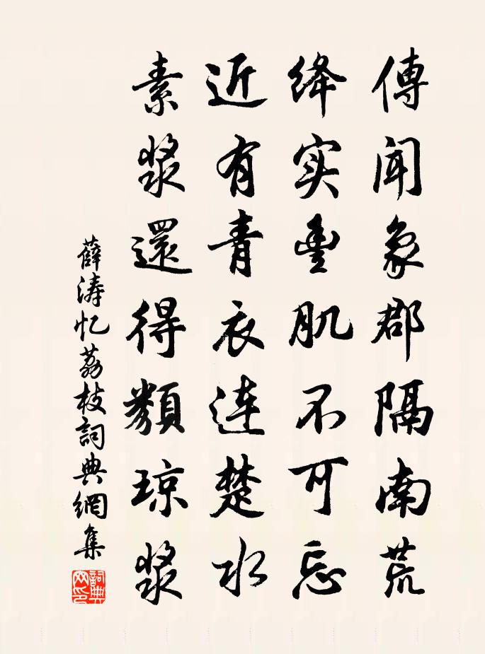 詩詞名句歷史字典書法欣賞書法字典國語詞典說文解字康熙字典古漢語字典標 題 作 者 詩 句 憶荔枝作者:薛濤 朝代:唐代憶荔枝原文傳聞象郡隔南荒,絳實豐肌不可忘。近有青衣連楚水,素漿還得類瓊漿。詩詞問答問:憶荔枝的作者是誰?答:薛濤問:憶荔枝寫於哪個朝代?答:唐代問:憶荔枝是什麼體裁?答:七絕薛濤憶荔枝書法欣賞憶荔枝書法作品注釋全唐詩詩詞推薦山居雜詩九十首曹勛〔宋代〕東岡老道友,招我閱子孫。大兒教以孝,小兒撫以溫。舉觴意未暢,已復月掛昏。興言還吾廬,更待它日論。感懷寄楊公濟強至〔宋代〕身世飄颻水上萍,時情暗淡草邊螢。百年日月空憂喜,一笑乾坤任醉醒。此外浮沈俱委命,相逢汝我即忘形。尋山題江夏修靜寺(此寺是李北海舊宅)李白〔唐代〕我家北海宅,作寺南江濱。空庭無玉樹,高殿坐幽人。書帶留青草,琴堂冪素塵。平生種桃李,寂滅不成春。黃神谷紀事馬戴〔唐代〕霹靂振秋岳,折松橫洞門。雲龍忽變化,但覺玉潭昏。題梅嶺雲封四絕戴復古〔宋代〕南遷過嶺面無慚,前有東坡後澹庵。兒輩欲知當日事,青山解語水能談。遙傷茅山縣孫尊師三首李德裕〔唐代〕蟬蛻遺虛白,蜺飛入上清。同人悲劍解,舊友覺衣輕。黃鵠遙將舉,斑麟儼未行。惟應鮑靚室,中夜識琴聲。金格初過潼疳值雨石介〔宋代〕二十年來憶華山,揚鞭西笑入秦川。浮云何苦深遮閉,豈是三峰不好賢。汝平諸公見和復用韻二首陳棣〔宋代〕鵝黃快瀉映金盆,白隨湘酃豈並論。酩酊不妨尋醉侶,鞠躬底事入公門。杯觴往往陪嘲謔,筆札時時荷記存。指日西湖早春釋行海〔宋代〕多時不向柳邊來,每個幽亭坐一回。春哢未容鶯燕鬧,芳心猶待杏桃開。飄搖水面漁舟穩,宛轉風前玉笛哀。太乙江上晚眺董嗣杲〔宋代〕江北西風高,江南新酒熟。長笛吹梅花,月色滿營屋。穆王宴王母於九光流霞館曹唐〔唐代〕桑葉扶疏閉日華,穆王邀命宴流霞。霓旌著地雲初駐,金奏掀天月欲斜。歌咽細風吹粉蕊,飲余清露濕瑤砂。不知回心院蕭觀音〔遼代〕展瑤席,花笑三韓碧。笑妾新鋪玉一床,從來婦歡不終夕。展瑤席,待君息。偈頌一百二十三首釋祖欽〔宋代〕天寒人寒,大寒小寒。熱則普天匝地熱,寒則普天匝地寒。熱不自熱,寒不自寒。紅日上三竿,當陽仔細看。別儲邕之剡中李白〔唐代〕借問剡中道,東南指越鄉。舟從廣陵去,水入會稽長。竹色溪下綠,荷花鏡里香。辭君向天姥,拂石臥秋霜。幸梨園亭觀打球應制(一作梨園亭子侍宴應制)崔湜〔唐代〕年光陌上發,香輦禁中游。草綠鴛鴦殿,花明翡翠樓。寶杯承露酌,仙管雜風流。今日陪歡豫,皇恩不可酬。上元日道室焚修寄襲美陸龜蒙〔唐代〕三清今日聚靈官,玉刺齊抽謁廣寒。執蓋冒花香寂歷,侍晨交佩響闌珊。將排鳳節分階易,欲校龍書下筆難。唯有三贈劉員外柳宗元〔唐代〕信書成自誤,經事漸知非。今日臨岐別,何年待汝歸。洛城秋砧徐凝〔唐代〕三川水上秋砧發,五鳳樓前明月新。誰為秋砧明月夜,洛陽城裡更愁人。虞美人(辰州上元)王庭珪〔宋代〕城東樓閣連雲起。冠絕辰州市。蓮燈初發萬枝紅。也似江南風景、半天中。花衢柳陌年時靜。劃地今年盛。棚前簫浣溪沙蘇軾〔宋代〕野飲松下,設松黃湯,作此闋。羅襪空飛洛浦塵。錦袍不見謫仙人。攜壺藉草亦天真。玉粉輕黃千歲藥,雪花浮動名句推薦鴻羽難憑芳信短,長安猶近歸期遠。盧祖皋《倦尋芳·香泥壘燕》 素衣莫起風塵嘆,猶及清明可到家。陸游《臨安春雨初霽》 勢有不可得,事有不可成。韓非及後人《韓非子·觀行》 中心愿,平虜保民安國。宋江《滿江紅·喜遇重陽》 安詳是處事第一法,謙退是保身第一法,涵容是處人第一法,灑脫是養心第一法。陳繼儒《小窗幽記·集醒篇》 靡不有初,鮮克有終。佚名《盪》 舊相思、偏供閒晝。吳文英《夜遊宮·春語鶯迷翠柳》 春雲不變陽關雪,桑葉先知胡地秋。李昂《從軍行》 傷心莫問前朝事,重上越王台。倪瓚《人月圓·傷心莫問前朝事》 野戰格鬥死,敗馬號鳴向天悲。李白《戰城南》
