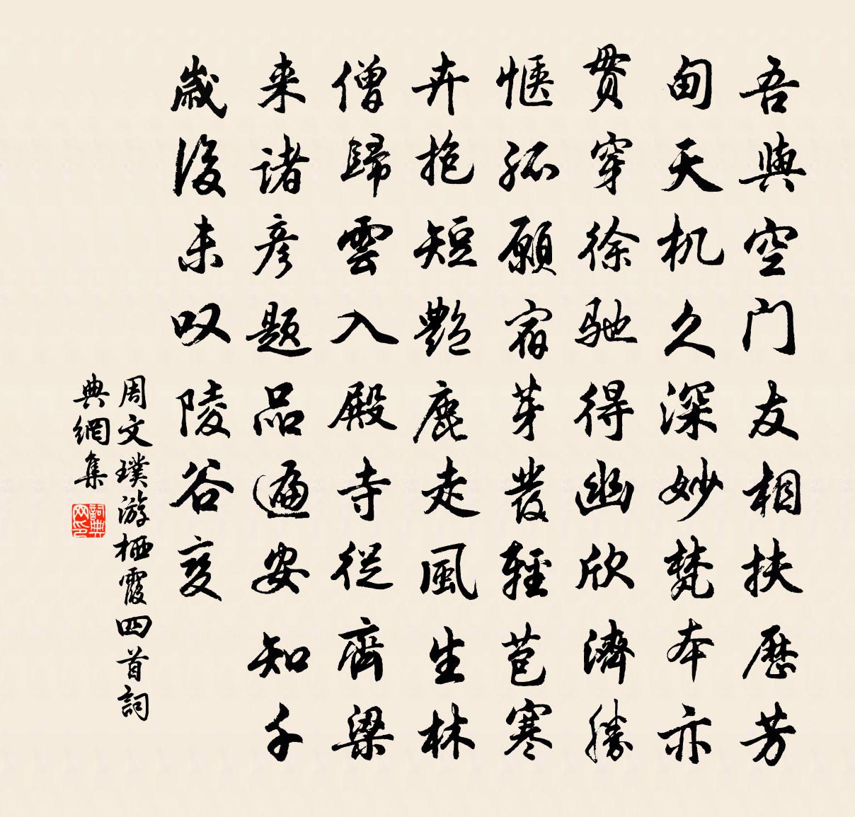 詩詞名句歷史字典書法欣賞書法字典國語詞典說文解字康熙字典古漢語字典標 題 作 者 詩 句 游棲霞四首作者:周文璞 朝代:宋代游棲霞四首原文吾與空門友,相扶歷芳甸。天機久深妙,梵本亦貫穿。徐馳得幽欣,濟勝愜孤願。宿芽發輕苞,寒卉抱短艷。鹿走風生林,僧歸雲入殿。寺從齊梁來,諸彥題品遍。安知千歲後,未嘆陵谷變。詩詞問答問:游棲霞四首的作者是誰?答:周文璞問:游棲霞四首寫於哪個朝代?答:宋代周文璞游棲霞四首書法欣賞游棲霞四首書法作品詩詞推薦奉和劉採訪縉雲南嶺作庾光先〔唐代〕百越城池枕海圻,永嘉山水復相依。懸蘿弱筱垂清淺,宿雨朝暾和翠微。鳥訝山經傳不盡,花隨月令數仍稀。幸陪始產公新作雙樗庵命光為詩司馬光〔宋代〕間氣生王佐,多才秉國鈞。棟隆憑楊梓,節勁仰松筠。底績承平業,遺榮壽考身。結廬依散木,退讓樂天真。送劉郎中知廣德軍梅堯臣〔宋代〕昔在少年時,辛勤事諸父。諸父為桃州,物宜皆可數。事君勤職貢,采茗先穀雨。劭農井田桑,科薅重鋤斧。城西和王常侍登郡樓望山呂公著〔宋代〕四賢當日此盤桓,千百年人尚厚顏。天下有名難避世,胸中無物漫居山。事觀今古興亡後,道在君臣進退間。若蘊清江引·清明日出遊王磐〔明代〕問西樓禁菸何處好?綠野晴天道。馬穿楊柳嘶,人倚鞦韆笑,探鶯花總教春醉倒。於時春也,慨然有江湖之思,寄贈柳九隴盧照鄰〔唐代〕提琴一萬里,負書三十年。晨攀偃蹇樹,暮宿清泠泉。翔禽鳴我側,旅獸過我前。無人且無事,獨酌還獨眠。遙聞啄木鳥二首魏野〔宋代〕爪利嘴還剛,殘陽啄更忙。千林蠹如盡,一腹餒何妨。形小過槐陌,聲高近草堂。豈同閒燕雀,唯解占雕梁。夢過城東謁洛陽尉楊應之邵雍〔宋代〕夜來清夢過城東,溪水分流徑路通。全似乘查上天漢,但無嚴子驗行蹤。山中五絕句白居易〔唐代〕游嵩陽見五物,各有所感,感興不同,隨興而吟,因成五絕。長乾寺同劉宮苑浴張舜民〔宋代〕人看浴出如枯木,我自無心類死灰。在處秋風吹鬢髮,不堪更上雨花台。敘州弟輓詩魏了翁〔宋代〕禍我天何酷,子歸自古誠。女孥俄別父,宗直亦辭兄。家難已稠疉,寇氛方滿盈。分明天有眼,不照此時情。菩薩蠻舒亶〔宋代〕綠窗酒醒春如夢。小池猶見紅雲動。露濕井幹桐。翠陰生細風。雨過芳塘淨。清晝閒中永。門外立雙旌。隔花聞笑方壺自詠汪莘〔宋代〕性靜無一物,心生有萬端。曾將魂魄練,不被鬼神瞞。縱步地雖窄,仰頭天自寬。裁詩偏得偶,遇卦只成單。寄樓居朱漕樂雷發〔宋代〕住近江心古寺邊,幅巾應伴浙僧閒。官銜自管金陵觀,冠業多依雁宕山。出處要留青史看,功名且逐白雲還。殷勤游棲岩寺呈提刑學士毅夫兄晁補之〔宋代〕飛樓壓城城跨野,黃河逶迤避條華。城南鳥道拱高岩,入谷車箱不容馬。解鞍初步石苔青,細泉鳴遶竹間亭。肩輿送杜陽安奉親還蜀二首洪咨夔〔宋代〕買我歸吳棹,揚君泝蜀旃。雖為萬里別,端有一家緣。臘雪添新漲,春風減舊綿。江山隨處好,橫槊小留連。次韻劉莘老學士惜別言懷兼呈次中察院二首蘇頌〔宋代〕詩侶方逢夢與微,攄懷未盡遽言歸。正思玉鱠將登俎,應笑緇塵又染衣。金石交情知不改,輔車形體自相依。何時沁園春侯善淵〔元代〕世累塵情,鎮日昏沉,何時盡期。被利名財色,相牽繫,把天真昧卻,一向愚痴。好女嬌兒,金枷玉*,鎖絆 * 謝趙宰拜襄敏墓並留題二首王阮〔宋代〕班春故事亦年年,公獨推誠遠布宣。麗日借黃催麥壠,惠風吹綠散秧田。眾魚入夢蓑衣下,異雉飛馴桑蔭前。好詠送石孫赴童科方岳〔宋代〕聖澤被卷阿,髫童亦置科。兩蝸從小競,三家至今訛。亦漫為官耳,其將奈若何。豈關門戶事,翁已老漁蓑。名句推薦敗荷零落,衰楊掩映,岸邊兩兩三三,浣沙游女。柳永《夜半樂·凍雲黯淡天氣》 山僧過嶺看茶老,村女當壚煮酒香。祝允明《首夏山中行吟》 眾生必死,死必歸土:此之謂鬼。戴聖《禮記·祭義》 醉里挑燈看劍,夢回吹角連營。辛棄疾《破陣子·為陳同甫賦壯詞以寄之》 其人雖已沒,千載有餘情。陶淵明《詠荊軻》 恨蕭蕭、無情風雨,夜來揉損瓊肌。李清照《多麗·詠白菊》 不在其位,不謀其政。孔子弟子《論語·泰伯篇》 知臣莫若於君,知子莫若於父。魏徵《隋書·帝紀·卷二》 為報今年春色好。花光月影宜相照。李清照《蝶戀花·上巳召親族》 悠悠卷旆旌,飲馬出長城。李世民《飲馬長城窟行》