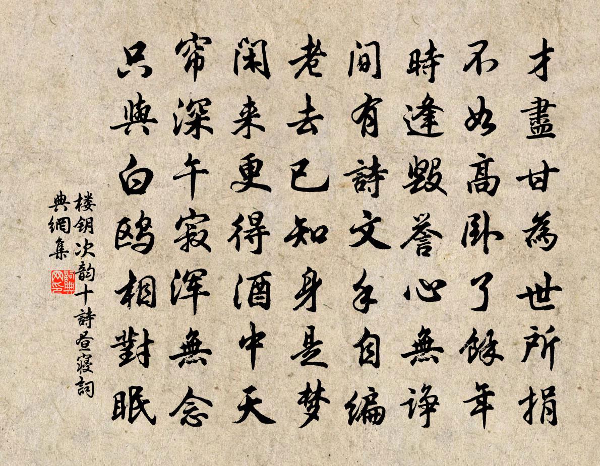 詩詞名句歷史字典書法欣賞書法字典國語詞典說文解字康熙字典古漢語字典標 題 作 者 詩 句 次韻十詩晝寢作者:樓鑰 朝代:宋代次韻十詩晝寢原文才盡甘為世所捐,不如高臥了餘年。時逢毀譽心無諍,間有詩文手自編。老去已知身是夢,閒來更得酒中天。簾深午寂渾無念,只與白鷗相對眠。詩詞問答問:次韻十詩晝寢的作者是誰?答:樓鑰問:次韻十詩晝寢寫於哪個朝代?答:宋代樓鑰次韻十詩晝寢書法欣賞次韻十詩晝寢書法作品詩詞推薦句諶祜〔宋代〕宮大阿房行日月,關通函谷混車書。寄謝周子開趙蕃〔宋代〕四益堂中四益碑,南軒文字述家規。殷勤打寄非無益,從此折肱當得醫。蝶戀花晏殊〔宋代〕南雁依稀回側陣。雪霽牆陰,偏覺蘭牙嫩。中夜夢余消酒困。爐香卷穗燈生暈。急景流年都一瞬。往事前歡,未免汶陽道中文天祥〔宋代〕積雨面不肯霽,面行陸如涉面川。青氈面纊我後,白氈覆我前。我欲正衣冠,兩手如糾纏。飛沫流被面,代我泣涕和王倅見惠十篇曹勛〔宋代〕嗟嗟困犯難,皎皎心莫改。而能畏四知,遂復瞻八彩。又起山林思,浩蕩渺江海。送乘叔羽寺丞持節淮東二首楊萬里〔宋代〕煮海誰為崇,沿淮困不勝。民思賢使者,帝遣大農丞。玉節寒侵斗,牙檣凍作冰。來歸聞早著,紫禁要渠登。述懷陸游〔宋代〕尺寸雖無補縣官,此心炯炯實如丹。羯胡未滅敢愛死?尊酒在前終鮮歡。亞父抱忠撞玉斗,虞人守節待皮冠。縱言嘲廬山道士陳沆〔唐代〕啖肉先生欲上升,黃雲踏破紫雲崩。龍腰鶴背無多力,傳與 * 借大鵬。往回臨安口號八首蘇泂〔宋代〕清曉無車一仆隨,南山行遍北山來。日長搭得回船去,薄暮涌金門尚開。雜曲歌辭。遊俠行孟郊〔唐代〕壯士性剛決,火中見石裂。 * 不回頭,輕生如暫別。豈知眼有淚,肯白頭上發。平生無恩酬,劍閒一百月。送周元吉顯謨左司將漕湖北三首楊萬里〔宋代〕君詩日日說歸休,忽解西風一葉舟。黃鶴樓前作重九,水精宮裡過中秋。職親六閣仍金馬,喜入千屯看木牛。繡斧都梁北鄉士多好學有向君敏衡者一日訪予語甚牟巘五〔宋代〕書滿精廬芷繞門,門前流水出於沅。夫君自得濂溪意,直向沄沄認本原。寒園即目詩庾信〔南北朝〕寒園星散居。搖落小村墟。遊仙半壁畫。隱士一床書。子月泉心動。陽爻地氣舒。雪花深數尺。冰床厚尺余。蒼鷹奉和受圖溫洛應制蘇味道〔唐代〕綠綺膺河檢,清壇俯洛濱。天旋俄制蹕,孝享屬嚴禋。陟配光三祖,懷柔洎百神。霧開中道日,雪斂屬車塵。預奉呂{左山右尋}省謁二絕劉克莊〔宋代〕□□□下挾兩拐,凍皴身上披三絮。非為辟支放登光,自是龐公上冢去。遊仙華山方鳳〔宋代〕仙華矗萬仞,我乃廬其東。日夕與山對,今茲踏玲瓏。起左信奔鹿,當前任啼狨。大嘯崖石裂,一覽天宇空。蒼松閨晚元稹〔唐代〕紅裙委磚階,玉爪朱橘。素臆光如砑,明瞳艷凝溢。調弦不成曲,學書徒弄筆。夜色侵洞房,春煙透簾出。天平山范師道〔宋代〕萬物天地間,或有奇勝跡。見賞能幾人,不止今與昔。吳門多好山,天平為峻極。旦暮常白雲,表里皆珍石。煙嵐義雞行方岳〔宋代〕西害粥粥雞將雛,俯啄蚱蜢行相呼。羽毛未合事紛奪,四顧不虞烏畢逋。翻窺捷取血丹吻,性命須臾那可忍。草深送章季萬戶部王洋〔宋代〕吳人不授館,楚人不分田。此身天地間,泛若不擊船。憶昨罷吏役,白鷗同一川。欲乘萬里風,短翼無夤緣。使君名句推薦凡出言,信為先。詐與妄,奚可焉?李毓秀《弟子規·信》 別院深深夏席清,石榴開遍透簾明。蘇舜欽《夏意》 世有伯樂,然後有千里馬。千里馬常有,而伯樂不常有。韓愈《雜說四·馬說》 露濕晴花春殿香,月明歌吹在昭陽。李益《宮怨》 歲暮鋤犁傍空室,呼兒登山收橡實。張籍《野老歌 / 山農詞》 風回雲斷雨初晴,返照湖邊暖復明。白居易《南湖早春》 知君獨坐青軒下,此時結念同所懷。李白《早秋單父南樓酬竇公衡》 智者不危眾以舉事,仁者不違義以要功。范曄《後漢書·列傳·竇融列傳》 夜發清溪向三峽,思君不見下渝州。李白《峨眉山月歌》 人之生利也,然且猶尚有節;葬埋者,人之死利也,夫何獨無節於此乎。墨子《墨子·22章 節用(下)》