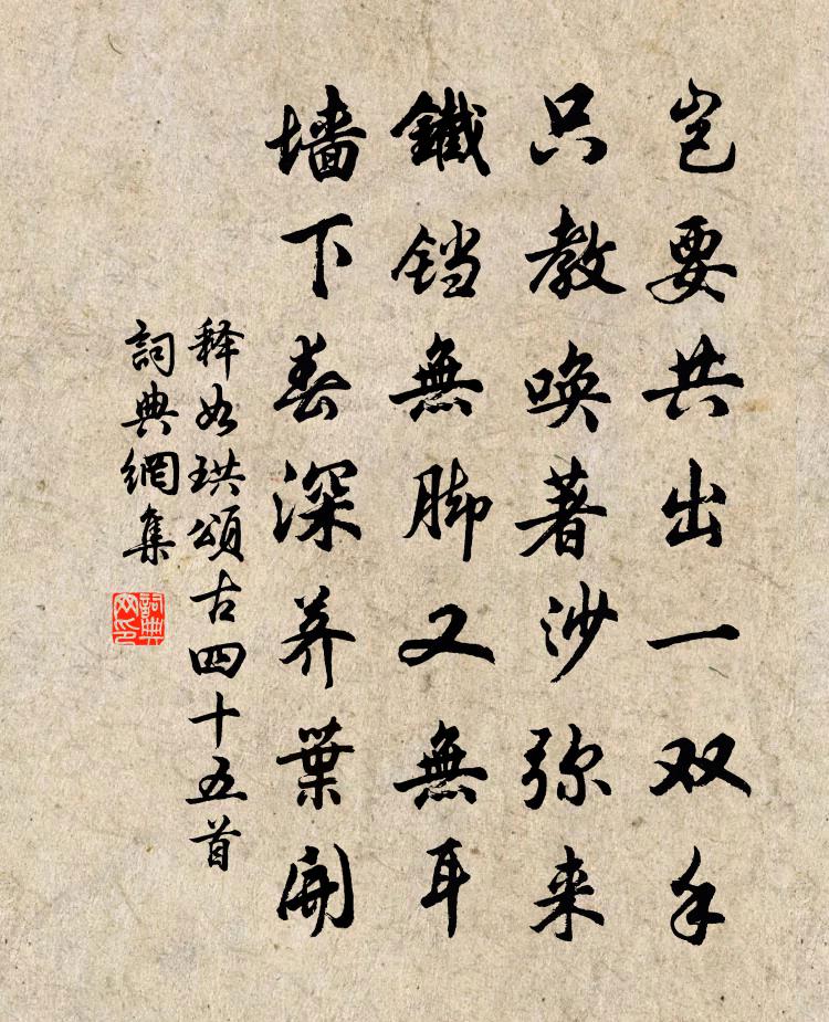 詩詞名句歷史字典書法欣賞書法字典國語詞典說文解字康熙字典古漢語字典標 題 作 者 詩 句 頌古四十五首作者:釋如珙 朝代:宋代頌古四十五首原文豈要共出一雙手,只教喚著沙彌來。鐵鐺無腳又無耳,牆下春深薺葉開。詩詞問答問:頌古四十五首的作者是誰?答:釋如珙問:頌古四十五首寫於哪個朝代?答:宋代釋如珙頌古四十五首書法欣賞頌古四十五首書法作品詩詞推薦念奴嬌(暮秋登石橋追和祝子權韻)佚名〔宋代〕十年湖海,嘆潘郎憔悴,無心雲閣。強起登臨驚暮序,目極清霜搖落。散發層阿,振衣千仞,浩蕩窮林壑。B87初春書喜陸游〔宋代〕我生本痴絕,萬事不繫懷;一朝蛻形去,豈問棄與埋。遊宦三十年,所向無一諧,偶然有天幸,自退非人排。黃紙和朱水鄉韻趙必象〔宋代〕一我獨棲棲,相逢又解攜。驚魚依亂藻,忙燕壘新泥。亦有種桃者,獨無芳草兮。買舟欲乘興,風雨黯前溪。聞辯才法師復歸上天竺以詩戲問蘇軾〔宋代〕道人花出山去,花山色如死花灰。白雲不解笑,青松有餘哀。忽聞道人歸,鳥語山容開。神光出寶髻,法雨洗浮埃南冠亭秋晚閒望寇準〔宋代〕南冠亭外淡江天,久客登臨更浩然。遠浦秋深翻白浪,孤山日暮起蒼煙。已嗟異國逢衰節,況復西風聽亂蟬。倦鳥挽趙碧蘭母劉氏牟巘五〔宋代〕苗裔真王后,儀型老監同。庭惟參玉樹,氣未感秋蓬。衣制先期具,舟藏半夜空。故應芳懿在,位刻賁幽宮。對雪二首毛滂〔宋代〕空庭白鳳舞毰毸,撲帟窺簾去卻回。柳絮似將春色到,梅梢不認月華來。輕盈舞殿三千女,縹緲飛天十二台。定有夜讀夷堅放卷偶成洪咨夔〔宋代〕斂卷驚嗟語幻嚨,搔頭危坐對明缸。梧桐細語秋傳信,絡緯長鳴月上窗。濁酒不多雙耳熱。妙香無盡寸心降。家山塞垣春楊 * 〔宋代〕繡閣臨芳野。向晚把、花枝卸。世間尋覓,除是圖畫。這歡娛已系人心也。更翰墨、新揮灑。展蠻箋、明窗底,把鷓鴣天(百官傳宣)王安中〔宋代〕蒨霧紅雲捧建章。鳴珂星使渡銀潢。親將聖主如絲語,傳與陪都振鷺行。香裊裊,〓鏘鏘。昇平歌管趁飛觴。明時五君詠五首魏齊公元忠張說〔唐代〕齊公生人表,迥天聞鶴唳。清論早揣摩,玄心晚超詣。入相廊廟靜,出軍沙漠霽。見深呂祿憂,舉後陳平計。甘心秋晚雜書三十首方回〔宋代〕我觀滿囷粟,一粟之所充。海魚千百億,孕卵與粟同。春菊寸許芽,霜華秋叢叢。誤耘或失溉,槁死厥壤童。萬物其七惜才賈似道〔宋代〕雄師百戰百番贏,不可交他出陣頻。身弱難禁生力對,一時托大誤蟲身。雜詩四首張說〔唐代〕抱薰心常焦,舉旆心常搖。天長地自久,歡樂能幾朝。君看西陵樹,歌舞為誰嬌。山閒苦積雨,木落悲時遽。賞心明日復賦蘇轍〔宋代〕放舟城西南,卻向東南泊。朝來雨新霽,白水浸城腳。古汴多流苴,清泗亦浮沫。平吞百澗暴,滅盡三洪惡。遊人再還宜豐寺靈一〔唐代〕再尋招隱地,重會息心期。樵客問歸日,山僧記別時。野雲陰遠甸,秋雨漲前陂。勿謂探形勝,吾今不好奇。小雨陸游〔宋代〕川雲疊疊密如鱗,山雨霏霏細似塵。未必便為耕隴喜,天公分付與詩人。至人六言劉克莊〔宋代〕幽子多棲白雲,至人或混紅塵。有時鼻涕擇菜,有時丫髻負薪。次韻石湖居士游虎丘陳造〔宋代〕山靈知我欲巾車,岫幌雲扃已袚除。竹葆松幢平幾席,碧煙紅影認林廬。飯分禪供清無敵,飲屬詩流興有餘。莫話酬和知府李殿院見訪之什往來不休因成四首魏野〔宋代〕使君悞訪樂郊民,顧我何由得暫親。茜旆動驅千百騎,茅亭才著兩三人。旋燒陸羽烹茶鼎,忙換陶潛漉酒巾。可愛名句推薦天上若無修月戶,桂枝撐損向西輪。米芾《中秋登樓望月》 河冰結合,非一日之寒;積土成山,非斯須之作。王充《論衡·卷十四·狀留篇》 聲無小而不聞,行無隱而不形。荀子《荀子·勸學》 何似當筵虎士,揮手弦聲響處,雙雁落遙空。葉夢得《水調歌頭·九月望日與客習射西園余偶病不能射》 白酒新熟山中歸,黃雞啄黍秋正肥。李白《南陵別兒童入京》 暗塵隨馬去,明月逐人來。蘇味道《正月十五夜》 湘女歸魂,佩環玉冷無聲,凝情誰訴。吳文英《過秦樓·黃鐘商芙蓉》 舟非水不行,水入舟則沒佚名《孔子家語·六本》 送數聲驚雁,下離煙水,嘹唳度寒雲。孔夷《南浦·旅懷》 恨蕭蕭、無情風雨,夜來揉損瓊肌。李清照《多麗·詠白菊》