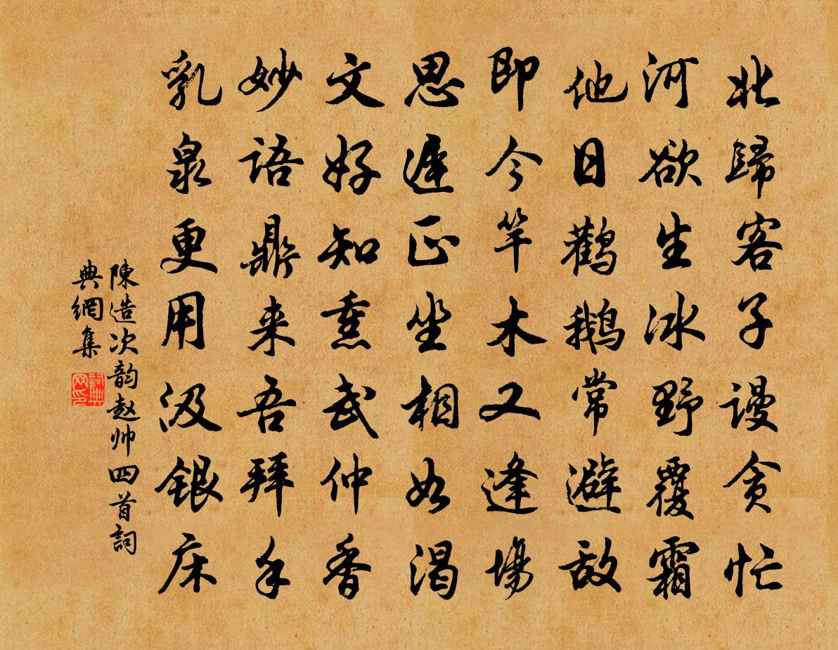 詩詞名句歷史字典書法欣賞書法字典國語詞典說文解字康熙字典古漢語字典標 題 作 者 詩 句 次韻趙帥四首作者:陳造 朝代:宋代次韻趙帥四首原文北歸客子謾貪忙,河欲生冰野覆霜。他日鸛鵝常避敵,即今竿木又逢場。思遲正坐相如渴,文好知熏武仲香。妙語鼎來吾拜手,乳泉更用汲銀床。詩詞問答問:次韻趙帥四首的作者是誰?答:陳造問:次韻趙帥四首寫於哪個朝代?答:宋代陳造次韻趙帥四首書法欣賞次韻趙帥四首書法作品詩詞推薦胡義修推官再招彥桓與予同游龍泉寺李復〔宋代〕江曲花開惱醉翁,經旬出飲獨床空。芳羹間筋溪毛碧,異果堆盤海藥紅。盡晚莫辭千日酒,余春已怨幾番風。主人又寒食日見紫荊花有懷三館項安世〔宋代〕東君老去梨花白,緋桃占斷春顏色。剩紅分付紫荊枝,回首千花盡陳跡。汗青庭外曲池濱,憶昔攢葩繞樹深。不解雙調 湘君阿魯威〔元代〕問湘君何處翱遊,怎弭節江皋,江水東流。薜荔芙蓉,涔陽極浦,杜若芳洲。駕飛龍兮蘭旌蕙綢,君不行兮河故夷次韻羅偉正寺丞見遺之什李彌遜〔宋代〕鵰鶚逢秋已恨遲,公才如此尚誰羈。江城樽俎未三月,世路干戈方百為。去馬便如千里別,斷葭已作十分披。它年七十九吟十首劉克莊〔宋代〕舊田廬我先人業,某水丘吾童子游。有杞菊姑安甫里,無蒲萄可博涼州。題家信後高選〔宋代〕十載殷勤訓子情,禮闈今幸占微名。彤庭策獻三千字,鵬海風摶九萬程。帽插宮花瓊宴罷,身沾仙露賜衣榮。瞻雲浯溪林伯成〔宋代〕讀時方喜能甚亂,責備猶疑過頌功。歸美縱來臣子事,誰歌宋德乃心同。病中大雪數日未嘗起觀虢令趙薦以詩相屬戲用蘇軾〔宋代〕經旬臥齋閣,終日親劑和。不知雪已深,但覺寒無奈。飄蕭窗紙鳴,堆壓檐板墮。(關中皆以板為檐。風飆助凝冽初上安仁灘清見毛髮其中奇石五色可掇拾也從晁補之〔宋代〕行盡江南最遠山,卻尋乾越上清灘。秋晴雲錦溪中過,玉石瑰奇一萬般。再蒙寵示佳什殆無遺巧勉成二章一以報佳貺一陳與義〔宋代〕睆睆休嫌笏與紳,如公本是九包人。讀書只用三冬足,學道從來一色醇。太尉談辭仍玉麈,侍中風韻更紗巾。誰言冬孟駕出親享太廟連日雨是朝大霽都人云凡四王邁〔宋代〕穀旦街塵淨,滿城春意我。威儀清警蹕,鹵簿扈鑒和。從騎黃金勒,回班白玉珂。恩榮誰不羨,報上合如何。成王冠辭先秦無名〔先秦〕使王近於民。遠於佞。近於義。嗇於時。惠於財。親賢使能。朱丞相赴宣州四十韻葛立方〔宋代〕天佑於皇宋,時生柱石賢。餘光承祖禰,秀氣稟山川。應物心如水,臨機直似弦。孔書窮竹簡,羲易玩韋編。記問次希道弟韻寄竹院孚上人胡仲弓〔宋代〕閉門商古道,細雨濕青春。屬和卯君句,殷勤巳上人。 * 安地位,秀語發天真。舊日曾同社,吾今愧許詢。古上方邵彪〔宋代〕凌雲細路險可遵,稍從飛錫攀嶙峋。烏巢崔嵬寄林莽,蟻穴細碎嚴君臣。震開樓閣一彈指,俯覽世界千微塵。人間頌古二十首釋了一〔宋代〕甘贄設粥念摩訶,致見南泉打破鍋。萬事但將公道斷,任教四海動干戈。宿鳳翅山懸泉寺張耒〔宋代〕秋山晚景涼,幽路轉石壁。稍知步武峻,漸與雞犬隔。層崖恃我西,懸瀑垂百尺。崩騰搗重泓,晝夜碎珪璧。天寒挽趙秋曉羅附鳳〔宋代〕發軔功名發未華,轉頭世事已堪嗟。晚栽栗里歸田菊,早看長安得意花。空憶去鴻留爪跡,只今舊燕傍誰家。重尋行舟漢口宋庠〔宋代〕澤國風波恨,孤帆日夕征。山連吳樹綠,江入漢源清。鬢亂將成葆,心搖不後旌。銷魂千里外,寧是憶蒪羹。遣興陸游〔宋代〕綠髮凋零白髮多,山林未死且婆娑。無端忤俗坐狂耳,甚欲讀書如嬾何!雨過亂蓑堆野艇,月明長笛和菱歌。此中名句推薦益者三友,損者三友。友直、友諒、友多聞,益矣;友便辟、友善柔、友便佞,損矣。孔子弟子《論語·季氏篇》 我有所念人,隔在遠遠鄉。白居易《夜雨》 漢家旌幟滿陰山,不遣胡兒匹馬還。戴叔倫《塞上曲二首·其二》 武皇去金閣,英威長寂寞江淹《銅爵妓》 堤上遊人逐畫船,拍堤春水四垂天。歐陽修《浣溪沙·堤上遊人逐畫船》 文武之政,布在方策。其人存,則其政舉;其人亡,則其政息。子思《中庸·第二十章》 窈窕淑女,君子好逑。佚名《關雎》 不知何日始工愁。記取那回花下一低頭。王國維《虞美人·弄梅騎竹嬉遊日》 仙佛茫茫兩未成,只知獨夜不平鳴。黃景仁《雜感》 柘彈何人發,黃鸝隔故宮。溫庭筠《清明日》