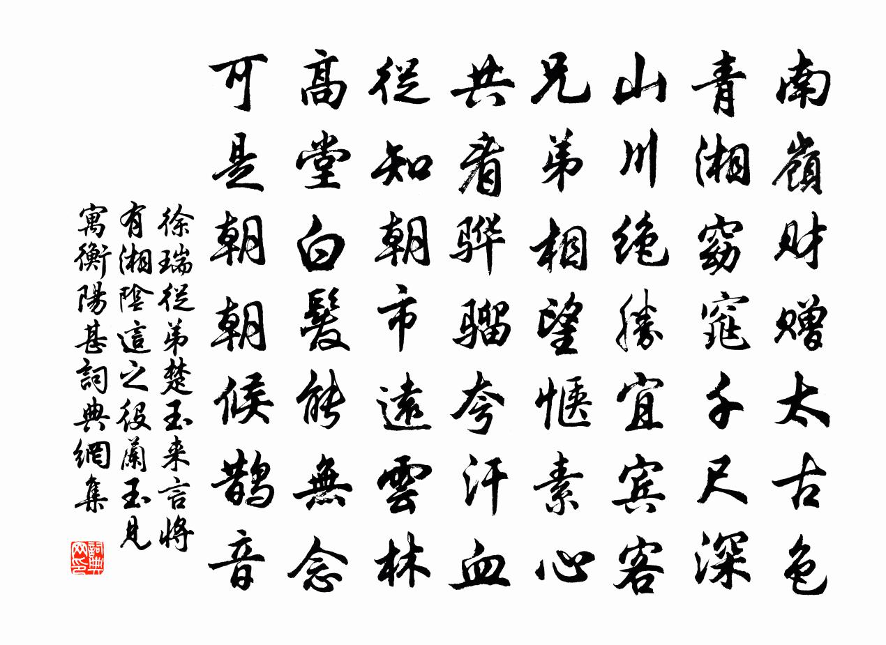 詩詞名句歷史字典書法欣賞書法字典國語詞典說文解字康熙字典古漢語字典標 題 作 者 詩 句 從弟楚玉來言將有湘陰這之役蘭玉見寓衡陽甚作者:徐瑞 朝代:宋代原文南嶺財贈太古色,青湘窈窕千尺深。山川絕勝宜賓客,兄弟相望愜素心。共看驊騮夸汗血,從知朝市遠雲林。高堂白髮能無念,可是朝朝候鵲音。詩詞問答問:《從弟楚玉來言將有湘陰這之役蘭玉見寓衡陽甚》的作者是誰?答:徐瑞問:該詩寫於哪個朝代?答:宋代書法欣賞從弟楚玉來言將有湘陰這之役蘭玉見寓衡陽甚書法作品詩文賞析【原題】:從弟楚玉來言將有湘陰這之役蘭玉見寓衡陽甚求詩送行為賦長句詩詞推薦劉無言輞川詩帖贊岳珂〔宋代〕輞川之勝,新詩之詠,所以適性也。繭紙這瑩,筆力之勁,所以寫興也。維詩與筆,景物交映也。並於唐圖,於是將往滁城戀新竹,簡崔都水示端韋應物〔唐代〕停車欲去繞叢竹,偏愛新筠十數竿。莫遣兒童觸瓊粉,留待幽人回日看。句尹穡〔宋代〕本來饑飽非同鼎,安得浮沈自一舟。張仁仲提乾衡陽冰壺亭燕客戴復古〔宋代〕大抵吾曹臭味同,留歡卜夜莫匆匆。一亭景物冰壺上,萬里乾坤玉鏡中。疏柳無心掛明月,敗荷有恨倚西風。吟家東門之墠佚名〔先秦〕東門之墠,茹藘在阪。其室則邇,其人甚遠。東門之栗,有踐家室。豈不爾思?子不我即!和韓致光侍郎無題三首十四韻吳融〔唐代〕珠佩元消暑,犀簪自辟塵。掩燈容燕宿,開鏡待雞晨。去懶都忘舊,來多未厭新。每逢憂是夢,長憶故延真。杏小記小圃花果二十首劉克莊〔宋代〕生長古牆陰,園荒草樹深。可曾沾雨露,不改向陽心。生日贈潘郎張耒〔宋代〕春雨蕭蕭江上城,論花與子酒同傾。恨君未到淮陽市,一見姚黃慰此生。上運管張平國華岳〔宋代〕武城三載促公歸,自合班行列禁闈。計幕暫參知有在,野夫曾此便橫飛。過土筧岡楊萬里〔宋代〕木落初宜菜,亭荒不復茅。牛分叉路口,鸛立禿松梢。秋熱方升日,朝涼更迥郊。襄年走塵鞅,何計返雲巢。側犯袁去華〔宋代〕篆銷余馥,燭堆殘蠟房櫳曉。寒峭。看杏臉羞紅、尚嬌小。游蜂靜院落,綠水搖池沼。閒繞。翠樹底、支頤聽啼鳥沁園春(二月廿七)程東灣〔宋代〕毓德婺虛,聯輝魁宿,天啟儒英。正仲春蓂階,三留葉秀,曉來蓬矢,六掛門榮。星昴誕蕭,神嵩降甫,怎似今朝天仙子 淥水亭秋夜納蘭性德〔清代〕水浴涼蟾風入袂,魚鱗觸損金波碎。好天良夜酒盈樽,心自醉,愁難睡,西南月落城烏起。早發始興江口至虛氏村作宋之問〔唐代〕候曉逾閩嶠,乘春望越台。宿雲鵬際落,殘月蚌中開。薜荔搖青氣,桄榔翳碧苔。桂香多露裛,石響細泉回。抱葉和人經隋唐間戰處徐夤〔唐代〕孤軍前度戰,一敗一成功。卷旆早歸國,臥屍猶臂弓。草間腥半在,沙上血殘紅。傷魄何為者,五湖垂釣翁。鷓鴣天劉一止〔宋代〕岩下清陰引興長。坐中初識令君香。攬將風月歸詩藪,乞得溪山作醉鄉。憐我老,與傳觴。吳霜點鬢又何妨。只應會稽山居寄薛播侍郎袁高給事高參舍人秦系〔唐代〕稷契今為相,明君復為堯。寧知買臣困,猶負會稽樵。酬合沙徐君寅林景熙〔宋代〕歸鶴悠悠度海遲,間來野寺看僧棋,鄉心荔子薰風國。客路槐花細雨時。天地一身愁自語,江湖諸老澹相知。烏絲送裕師骨蘇泂〔宋代〕去年石上君攜我,今日溪邊我送君。世事盡從朝晚過,人情難必死生分。四月十八日之桐川潘獻可〔宋代〕白鳥蒼煙外,黃鸝綠樹間。雨晴初有路,雲薄不藏山。村酒成孤酌,征鞍厭獨攀。日長人自倦,更覺馬蹄慳。名句推薦流水落花春去也,天上人間。李煜《浪淘沙令·簾外雨潺潺》 一聲畫角譙門,豐庭新月黃昏,雪裡山前水濱。白樸《天淨沙·冬》 歌里千重意,才欲歌時淚已流,恨應更、多於淚杜安世《卜運算元·樽前一曲歌》 聞賢而不舉,殆;聞善而不索,殆;見能而不使,殆管仲《管子·法法》 人去鞦韆閒掛月,馬停楊柳倦嘶風。吳文英《望江南·三月暮》 任你官清似水,難逃吏滑如油。馮夢龍《醒世恆言·卷二十》 春無蹤跡誰知。除非問取黃鸝。黃庭堅《清平樂·春歸何處》 煙籠寒水月籠沙,夜泊秦淮近酒家。杜牧《泊秦淮》 庭前雪壓松桂叢,廊下點點懸紗籠。劉禹錫《更衣曲》 漢甲連胡兵,沙塵暗雲海。李白《經亂離後天恩流夜郎憶舊遊書懷贈江夏韋太守良宰》