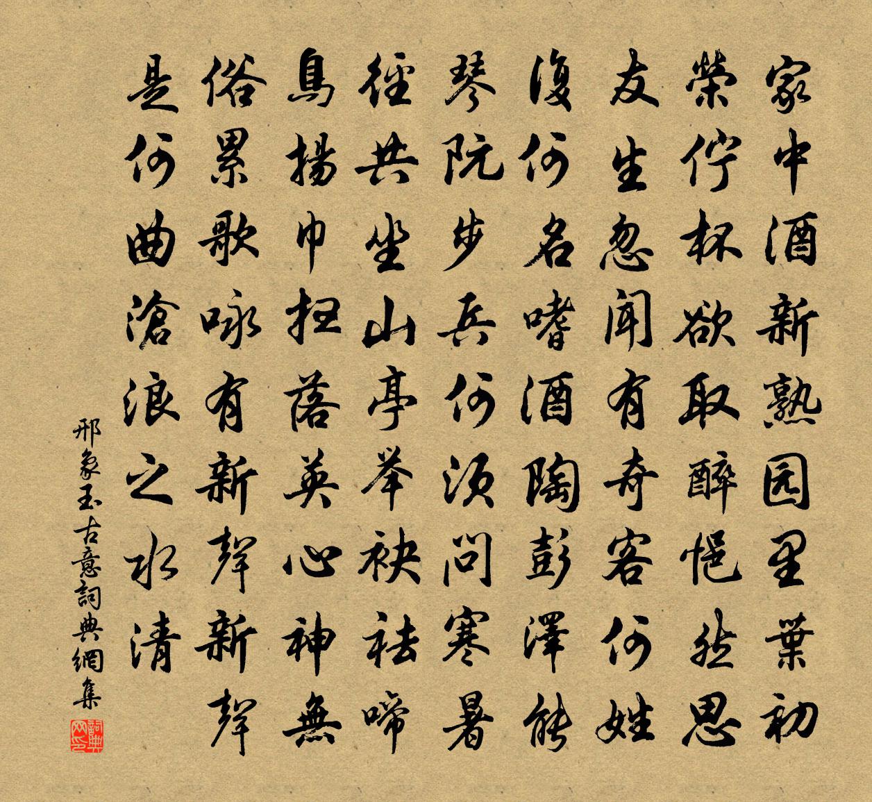 詩詞名句歷史字典書法欣賞書法字典國語詞典說文解字康熙字典古漢語字典標 題 作 者 詩 句 古意作者:邢象玉 朝代:唐代古意原文家中酒新熟,園裡葉初榮。佇杯欲取醉,悒然思友生。忽聞有奇客,何姓復何名。嗜酒陶彭澤,能琴阮步兵。何須問寒暑,徑共坐山亭。舉袂祛啼鳥,揚巾掃落英。心神無俗累,歌詠有新聲。新聲是何曲,滄浪之水清。詩詞問答問:古意的作者是誰?答:邢象玉問:古意寫於哪個朝代?答:唐代問:古意是什麼體裁?答:樂府邢象玉古意書法欣賞古意書法作品注釋全唐詩:卷777-1詩詞推薦南征彭秋宇〔宋代〕聖皇神武志規恢,南國胡為貢未來。銅柱地荒雲隔斷,珠崖天盡雁飛回。秋風曾見秦師出,曉日今聞漢詔哀。中國春詞方岳〔宋代〕草色將寒上客衣,柔情只了得花飛。湘簾不隔社公雨,百姓人家燕未歸。喜雨陸游〔宋代〕雨氣侵人暮不休,雨聲逼枕冷颼颼。方欣草木有生意,已報溝池無涸流。避濕入檐憐病鶴,爭巢逐婦嘆鳴鳩。老農胡文昌和東坡子由彭城月詩並綠澹庵新州以所陳元晉〔宋代〕澹庵眼似坡仙高,眇視軒冕如秋毫。忠臣要作社稷計,那知平陸生風濤。當時蓋亦輕餘子,富貴轉頭真逝水。汗青高宗建炎初祀昊天上帝佚名〔宋代〕祀事孔明,禮文惟琳。爰潔牲犧,載登俎豆。或肆或將,無聲無臭。精祲潛通,永綏我後。江北梅開殊晚和林實之別駕韻孫應時〔宋代〕楚江橫月一枝明,想見江南半落英。等是春風有先後,不妨調鼎看功成。當直偶題所見宋祁〔宋代〕凜序閒緹簽,輕寒著黼帷。仙盤迎日早,溫樹得霜遲。風觸趨朝珮,霞纏放仗旗。殿廊聊暴背,誰訝子云衰。讀魏鶴山先生渠陽集五首方回〔宋代〕漢唐台閣畫功臣,何似宣尼從祀人。欲繪兩賢繼張呂,臨邛魏老建安真。送馬廿七秀才歸小枯村宋伯仁〔宋代〕輕輕飛絮撲花枝,喜傍蘭亭說舊詩。君去小枯應為我,細看山帶晚晴時。重寄絕句(一作寄唐州楊八)劉禹錫〔唐代〕淮西既是平安地,鴉路今無羽檄飛。聞道唐州最清靜,戰場耕盡野花稀。餞廬按察楊公遠〔宋代〕軺車至日歲將更,又趁薰風理去程。歷遍山城留好句,蘇回民瘼快輿情。人言但有官如此,世道應無事不平。只恐挽東萊二首康文虎〔宋代〕國尚有人悲此老,天其喪我泣吾曹。平生心事知誰與,悵望今人論太高,便谷卑心隨故步,豈期中路喪連鰲。先生寒食二首李山甫〔唐代〕柳花東風花一向斜,花春陰澹澹蔽人家。有時三點兩點雨,到處十枝五枝花。萬井樓台疑繡畫,九原珠翠似煙霞。菊李嶠〔唐代〕玉律三秋暮,金精九日開。榮舒洛媛浦,香泛野人懷。靃靡寒潭側,丰茸曉岸隈。黃花今日晚,無復白衣來。臨江仙(六月二日病差出門散適)韓淲〔宋代〕竹樹陰陰流澗水,黃鸝飛去飛還。蓬門籬落小橋灣。更無塵跡到,我自愛其閒。雨又隨風催薄暮,輕雷時動雲斑。送楊寺丞渾父帥安康沈繼祖〔宋代〕楊子聲名鶴在陰,詩書作帥有謀深。開關入洛平如掌,擊楫中流酬此心。胡運只今那得久,齊疆指日自歸侵。君當賦王九山滄浪閣薛嵎〔宋代〕千年孺子吟,誰會此時心。方寸有涇渭,煙波無古今。水禽知雨候,山氣愛秋深。不盡憑欄意,橈歌歸故林。蹋莎行(鄭開府出示諸公所賦琵琶詞,即席次韻)史浩〔宋代〕歌舌鶯嬌,舞腰蜂細。華堂是處皆頤指。四弦獨擅席中春,移船出塞聲能繼。慢拈幽情,輕攏柔思。其中有口傳心賀新郎辛棄疾〔宋代〕陳同父自東陽來過余,留十日,與之同游鵝湖,且會朱晦庵於紫溪,不至,飄然東歸。既別之明日,余意中殊戀戀老甚自詠陸游〔宋代〕殘年真欲數期頤,一事無營飽即嬉。身入兒童鬥草社,心如太古結繩時。騰騰不許諸人會,兀兀從嘲老子痴。亦莫名句推薦天下無事,不可廢武佚名《百戰奇略·第十卷·忘戰》 客思似楊柳,春風千萬條。王安石《壬辰寒食》 啼鶯舞燕,小橋流水飛紅。白樸《天淨沙·春》 春風疑不到天涯,二月山城未見花。歐陽修《戲答元珍》 時來天地皆同力,運去英雄不自由。羅隱《籌筆驛》 井中之無大魚也,新林之無長木也。呂不韋《呂氏春秋·覽·有始覽》 金帶連環束戰袍,馬頭沖雪度臨洮。馬戴《出塞詞》 活水源流隨處滿,東風花柳逐時新。于謙《觀書》 眼見的吹翻了這家,吹傷了那家,只吹的水盡鵝飛罷!王磐《朝天子·詠喇叭》 凡是人,皆須愛。天同覆,地同載。李毓秀《弟子規·泛愛眾》