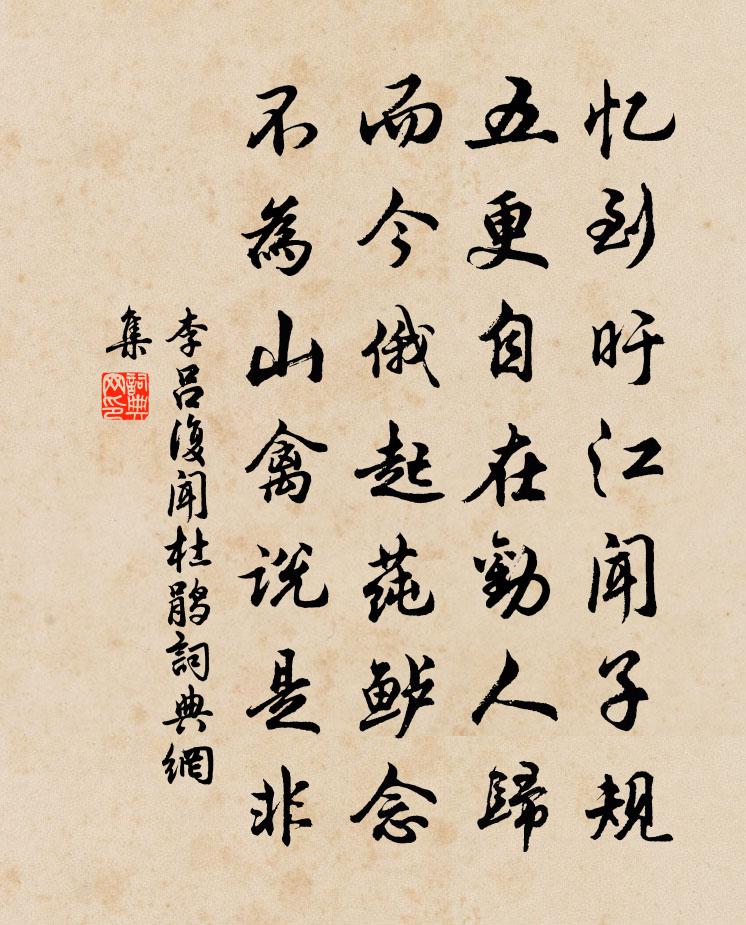 詩詞名句歷史字典書法欣賞書法字典國語詞典說文解字康熙字典古漢語字典標 題 作 者 詩 句 復聞杜鵑作者:李呂 朝代:宋代復聞杜鵑原文憶到旴江聞子規,五更自在勸人歸。而今俄起蓴鱸念,不為山禽說是非。詩詞問答問:復聞杜鵑的作者是誰?答:李呂問:復聞杜鵑寫於哪個朝代?答:宋代李呂復聞杜鵑書法欣賞復聞杜鵑書法作品詩詞推薦賓州仙影山陶弼〔宋代〕月氅星冠七丈夫,遠看雖有近還無。瑤池侍女雙成道,遺下群仙聚影圖。頌古八首釋元聰〔宋代〕倒腹傾腸說向伊,不知何故尚遲疑。只今便好猛提取,莫待天明失卻雞。歲日作劉長卿〔唐代〕建寅回北斗,看歷占春風。律變滄江外,年加白髮中。春衣試稚子,壽酒勸衰翁。今日陽和發,榮枯豈不同。十月七日夜夢中作兩長句覺而忘之別成長句視晁說之〔宋代〕冬來羇旅更迢迢,撫枕燈殘百感饒。飢鼠翻空疑有鬼,驚烏誤曉尚中宵。詩成與夢俱零落,劍出低眉亦寂寥。無分商山臨路有孤松往來斫以…編竹成楥遂其生植感而賦詩柳宗元〔唐代〕孤松停翠蓋,托根臨廣路。不以險自防,遂為明所誤。幸逢仁惠意,重此藩籬護。猶有半心存,時將承雨露。往敬亭路中謝朓〔南北朝〕山中芳杜綠。江南蓮葉紫。芳年不共游。淹留空若是。綠水豐漣漪。青山多繡綺。新條日向抽。落花紛已委。弱葼北院白居易〔唐代〕北院人稀到,東窗地最偏。竹煙行灶上,石壁臥房前。性拙身多暇,心慵事少緣。還如病居士,唯置一床眠。雜劇·錢大尹智寵謝天香關漢卿〔元代〕楔子(沖末扮柳耆卿,引正旦謝天香上)(柳詩云)本圖平步上青雲,直為紅顏滯此身。老天生我多才思,風月場交韻漢老弟假山虞儔〔宋代〕庭空吏散無公事,一枕清風供午睡。列仙之陬渺何許,化蝶翩翩可坐致。夢中意行不識路,神前那有車乘墜。立壁七言二首答黎教授歐陽修〔宋代〕撥瓮浮醅新釀熟,得霜寒菊始開齊。養丹道士顏如玉,愛酒山公醉似泥。不惜蕊從蜂採去,尚余香有蝶來棲。莫嫌逢林舜舉董嗣杲〔宋代〕命逢元造厄,時使壯心違。淮海三年客,山林一布衣。有家惟母在,無犬寄書歸。明日重陽醉,休辭上翠微。古寺偈陳堯佐〔宋代〕殿古寒爐空,流塵暗金碧。獨坐偶無人,又得真訊息。頌古二十首釋了一〔宋代〕甘贄設粥念摩訶,致見南泉打破鍋。萬事但將公道斷,任教四海動干戈。句丁謂〔宋代〕鷹鶻騰雙眼,龍蛇繞四肢。酹江月(壽太守母八十·正月初一)黃革〔宋代〕堂堂卿月,奉君恩來作,潛藩賢守。喜遇慈闈年八十,特向新正稱壽。千里春風,滿堂和氣,是處歌聲奏。荷衣紫贈仙居宰陳述古鄭穆〔宋代〕我愛仙居宰,渾渾政不拘。縱民如野鹿,任道若荒蕪。訪境土皆辟,訂風惡亦無。平生志嚴整,伺隙莫操弧。燈花石延年〔宋代〕回鱗抱雙蒂,倒鳳吐丹榮。冰宇寒生暈,風疏動有聲。燼垂金藕細,影透玉荷清。斗帳依東壁,誰人夢不成。離相院丘葵〔宋代〕一夕僧留宿,翛然萬慮空。草分仙掌綠,芬發御袍紅。白鳥松梢雪,玄談塵尾風。因悲人世上,終日業塵中。出郊趙汝鐩〔宋代〕二月垂楊岸,行春詩酒徒。蒼頭前引道,拄杖掛葫蘆。柳枝答李覯〔宋代〕春早寒餘豈足哀,平生多難愧非材。去年二月都城裡,曾共花房帶雪來。名句推薦宦情羈思共淒淒,春半如秋意轉迷柳宗元《柳州二月榕葉落盡偶題》 君子恥不修,不恥見污。荀子《荀子·非十二子》 氣之輕清上浮者為天,氣之重濁下凝者為地。程登吉《幼學瓊林·卷一·天文》 積學以儲寶,酌理以富才劉勰《文心雕龍·神思》 銜霜當路發,映雪擬寒開。何遜《詠早梅 / 揚州法曹梅花盛開》 泰山嵯峨夏雲在,疑是白波漲東海。李白《早秋單父南樓酬竇公衡》 佇倚危樓風細細。望極春愁,黯黯生天際。柳永《蝶戀花·佇倚危樓風細細》 何處寄想思,南風搖五兩。王維《送宇文太守赴宣城》 倚杖柴門外,臨風聽暮蟬。王維《輞川閒居贈裴秀才迪》 玉可碎而不可改其白,竹可焚而不可毀其節。羅貫中《三國演義·第七十六回》