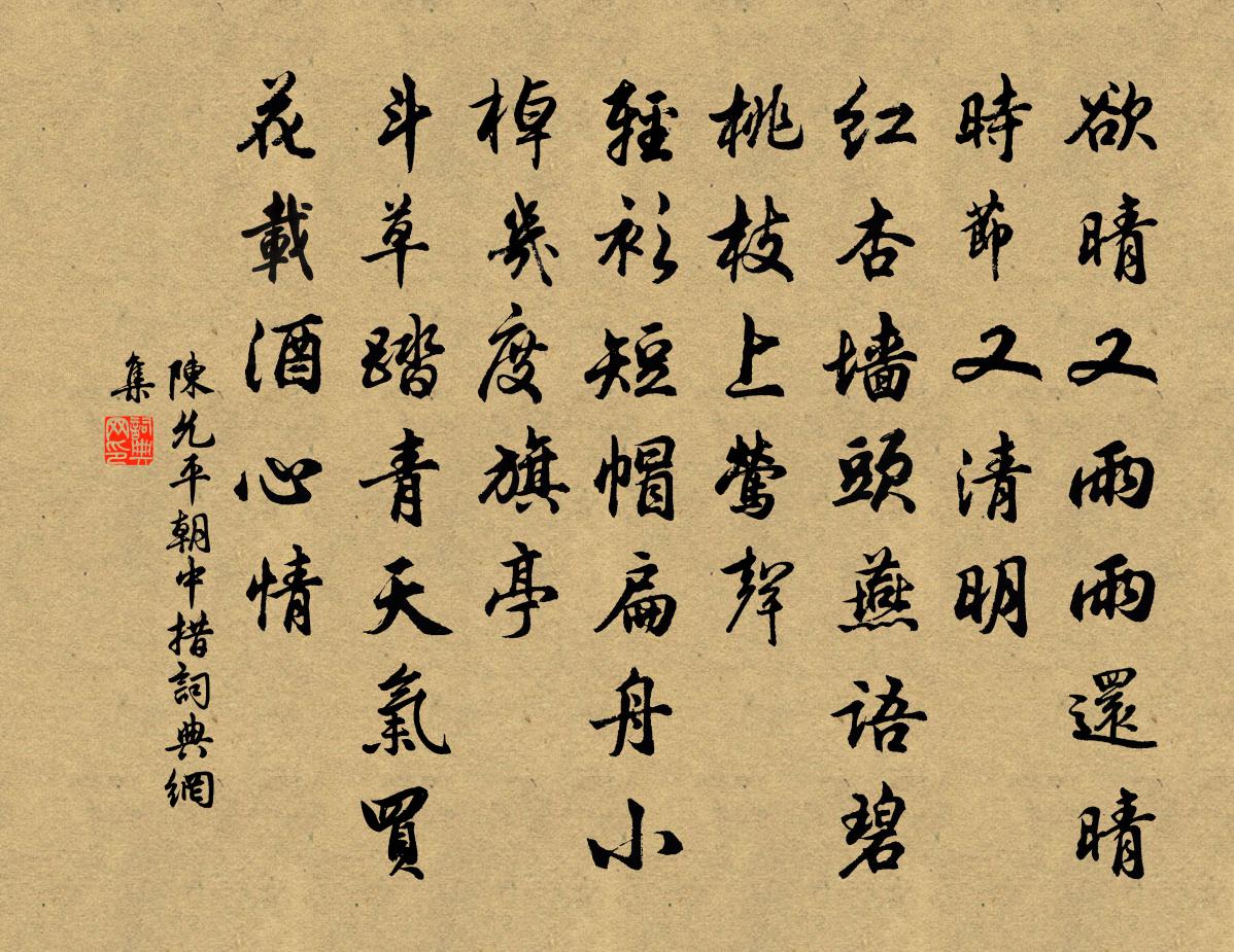詩詞名句歷史字典書法欣賞書法字典國語詞典說文解字康熙字典古漢語字典標 題 作 者 詩 句 朝中措作者:陳允平 朝代:宋代朝中措原文欲晴又雨雨還晴。時節又清明。紅杏牆頭燕語,碧桃枝上鶯聲。輕衫短帽,扁舟小棹,幾度旗亭。鬥草踏青天氣,買花載酒心情。詩詞問答問:朝中措的作者是誰?答:陳允平問:朝中措寫於哪個朝代?答:宋代問:朝中措是什麼體裁?答:詞陳允平朝中措書法欣賞朝中措書法作品詩詞推薦紹興以後祀感生帝十六首佚名〔宋代〕禮文既洽,熏燎聿升。嘉氣四塞,丹誠上勝。惟類之應,惟福之興。永熾天統,億載靈承。西蜀旅舍春嘆,寄朝中故人呈狄評事岑參〔唐代〕春與人相乖,柳青頭轉白。生平未得意,覽鏡私自惜。四海猶未安,一身無所適。自從兵戈動,遂覺天地窄。功業頌古一○一首釋子淳〔宋代〕寒月依依上遠峰,平湖萬頃練光封。漁歌驚起沙洲鷺,飛放蘆花不見蹤。安肅軍范成大〔宋代〕從古銅門控朔方,南城煙火北城荒。台家抵死爭溏濼,滿眼秋蕪襯夕陽。送強甫赴惠安六言十首劉克莊〔宋代〕古雲若保赤子,亦曰如烹小鮮。雉馴萬物遂性,犬吠一村廢眠。默記淮南王事宋庠〔宋代〕班葛才華盡冠時,如何褒貶兩參差。八公並號翀宵客,誰作當年詣吏辭。送韓宜州張栻〔宋代〕頃年未識宜州面,已信諸賢品藻公。幕下從容逢益友,胸中骯髒本家風。一麾且與寬凋察,華發應無慕勇功。從古水調歌頭(再賦)李曾伯〔宋代〕可愛十分月,都無一點雲。清光是處皆有,渾不許人分。獨是大江深處,一片水晶世界,仿佛有微痕。坐到夜深際漢陽郎官湖鄧牧〔宋代〕仙翁薄暮醉酒歸,杖藜迷卻高陽池。清風吹花綠陰倒。我笑謂是秋雲移。還乘貫月槎,夜過郎官湖。崢嶸星斗入江新荔枝四絕范成大〔宋代〕荔浦園林瘴霧中,戎州沽酒擘輕紅。五年食指無占處,何意相逢萬壑東。聞虜人敗於柘皋作口號十首龐謙孺〔宋代〕京口人來說禁江,似聞胡騎再跳梁。夜來急遞傳新報,見說官軍戰順昌。環溪夜坐吳璋〔宋代〕江天閒晚已斜陽,靜掩柴門對草堂。葉落轉枝翻鶻影,星飛橫水帶螢光。微風得雋驅殘暑,新月出音生嫩涼。坐覺夜宿沙渦趙蕃〔宋代〕櫓折幫難進,牽殊深足虞。百艱甘薄命,共濟賴同途。聚落強名地,併吞總是湖。遙遙聞吠犬,更問酒家酤。于氏琵琶行方回〔宋代〕君不見木蘭女郎代戍邊,鐵甲臥起二十年。不知誰作古樂府,至今流傳木蘭篇。又不見公孫大娘舞劍器,揮霍低昂送謝公定作竟陵主簿黃庭堅〔宋代〕謝公文章如虎豹,至今斑斑在兒孫。竟陵主簿極多聞,萬事不理專討論。澗松無心古須鬣,天球不瑑中粹溫。落筆病癒登疊嶂樓張耒〔宋代〕沉疴幸蕭散,登覽慰無聊。江南春尚早,余雪冒山椒。野梅臨風謝,溪澌映日消。晴林鳥聲樂,幽墅水文搖。新年偶書徐夤〔唐代〕巧者多為拙者資,良籌第一在乘時。市門逐利終身飽,谷口躬耕盡日飢。瓊玖鬻來燕石貴,蓬蒿芳處楚蘭衰。高皇廬山白蓮社釋懷悟〔宋代〕晉室陵遲帝紀侵,群英晦跡匡山陰。樓煩大士麾齋尾,十七高賢爭扣幾。佳人歌宋伯仁〔宋代〕淡傳粉,淺畫眉,鬢邊休插桃花枝。白面郎君馬如箭,回頭再盼情依依。文君未識相如面,朱弦聲裹猶相戀,風流深溪鋪中二絕,追路寄呈元將、仲顯二使君范成大〔宋代〕祗有南風卷路塵,斷無南客送車輪。故人合在瀟湘見,卻向瀟湘別故人。名句推薦差若毫釐,謬以千里。魏收《魏書·列傳·卷六十六》 今朝有酒今朝醉,明日愁來明日愁。羅隱《自遣》 低花樹映小妝樓,春入眉心兩點愁。白居易《春詞》 機關算盡太聰明,反算了卿卿性命。曹雪芹《紅樓夢·第五回》 年年雪裡。常插梅花醉。李清照《清平樂·年年雪裡》 桃李春風一杯酒,江湖夜雨十年燈。黃庭堅《寄黃幾復》 大家做事尋常,小家做事慌張。佚名《增廣賢文·上集》 花氣襲人知驟暖,鵲聲穿樹喜新晴。陸游《村居書喜》 參軍春思亂如雲,白髮題詩愁送春歐陽修《春日西湖寄謝法曹歌》 春思遠,誰嘆賞、國香風味。周密《繡鸞鳳花犯·賦水仙》