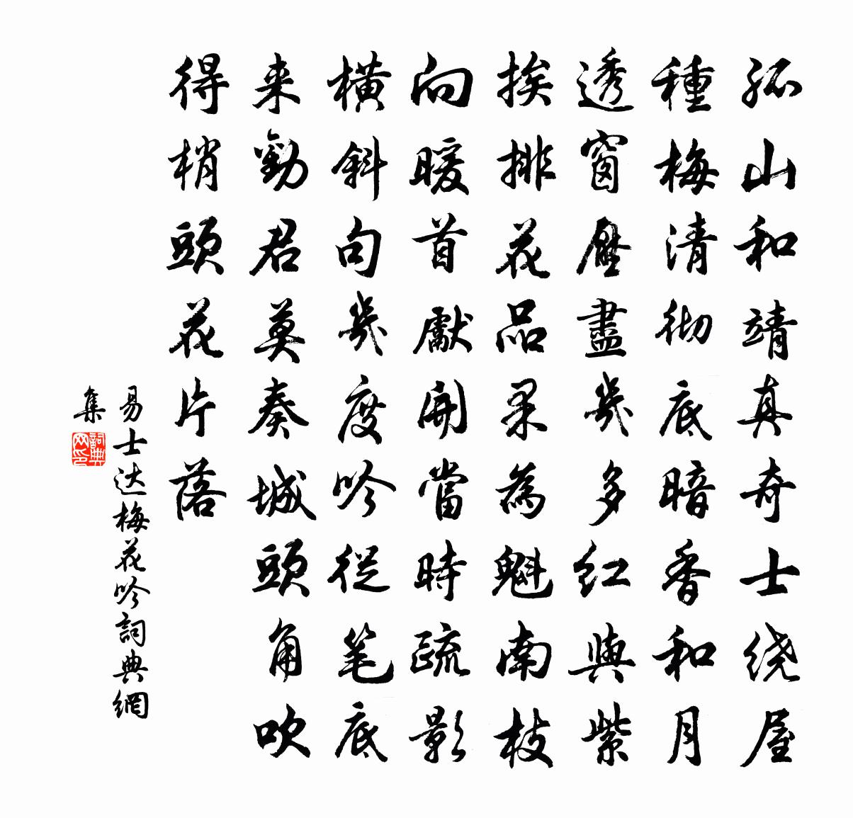 詩詞名句歷史字典書法欣賞書法字典國語詞典說文解字康熙字典古漢語字典標 題 作 者 詩 句 梅花吟作者:易士達 朝代:宋代梅花吟原文孤山和靖真奇士,繞屋種梅清徹底。暗香和月透窗,壓盡幾多紅與紫。挨排花品果為魁,南枝向暖首先開。當時疏影橫斜句,幾度吟從筆底來。勸君莫奏城頭角,吹得梢頭花片落。詩詞問答問:梅花吟的作者是誰?答:易士達問:梅花吟寫於哪個朝代?答:宋代易士達梅花吟書法欣賞梅花吟書法作品詩詞推薦九日趙蕃〔宋代〕今年重九日,舟楫次蘭谿。懷古心雖壯,登高思卻迷。山空分向背,木落盡高低。多少覉棲恨,寒猿斷續啼。已亥雜詩 223龔自珍〔清代〕似笑山人不到家,爭將晚節盡情夸。三秋不隕芙蓉 ,九月猶開窅窳花。和皮日休悼鶴魏朴〔唐代〕直欲裁詩問杳冥,豈教靈化亦浮生。風林月動疑留魄,沙島香愁似蘊情。雪骨夜封蒼蘚冷,練衣寒在碧塘輕。人間今夕行(自齊趙西歸至鹹陽作)杜甫〔唐代〕今夕何夕歲雲徂,更長燭明不可孤。鹹陽客舍一事無,相與博塞為歡娛。馮陵大叫呼五白,袒跣不肯成梟盧。英雄壽通守趙寺丞敖陶孫〔宋代〕忠簡公騎箕尾星,千古萬古明天庭。在天高廟足歡喜,敕使孫枝扶炳靈。輟身仙班寄閒逸,閶闔正繞煙花出。朝元頭陀嶺無相院陳岩〔宋代〕頭陀嶺下招提境,畫閣闌乾幾度憑。遊客驟來還倏去,看山輸與在家僧。次韻葉茵〔宋代〕枯坐如僧欠缽單,年來夢不赴槐安。稀行種竹容風入,大字鈔書就月看。為有故人同冷淡,非乾明主棄孤寒。因閒詩九首托南劍劉教尋亦周墓焚之趙文〔宋代〕平生二老最憐君,今日相隨在九京。汝得從親吾孑立,不知誰死復誰生。樟亭觀濤宋昱〔唐代〕濤來帶勢轉雄,帶獵獵駕長帶風。雷震帶雲霓里,山飛霜雪中。激流起平地,吹澇上侵空。翕闢乾坤異,盈虛日月驀山溪王哲〔元代〕一靈真性,二物包囊定。三寸主人翁,四方游、各來邀請。五情六*,七窮總相連,八山聳,九宮深,十地如何證句陳傅良〔宋代〕玉龍十二蓬山頂,寶髻三千漢殿中。懷李商叟趙蕃〔宋代〕好在半村宅,竹添桐長枝。空餘相憶夢,不見寄來詩。苦節君耆舊,卑官我判司。因來貴溪水,一為洗塵緇。眼兒媚 以上二首見中州樂府許古〔元代〕濁醪得玉為漿。風韻帶橙香。持杯笑道,鵝黃似酒,酒似鵝黃。世緣老矣不思量。沈醉又何妨。臨風對月,山歌謁金門黃機〔宋代〕風雨後。枝上綠肥紅瘦。樂事參差團不就。一春如病酒。樓外暖煙楊柳。憶得年時攜手。燕子雙雙來未久。頗知人題瑞昌良田寺覽秀軒一首王阮〔宋代〕無心軒冕難招我,到眼雲山輒起予。不必憑欄更清賞,此身元在此山居。婆羅門引 辛卯中秋望月張之翰〔元代〕宦遊南北,月明何處不相隨。十年九賦新詞。今夜清光如許。無以侑金*。想叨居此職,著甚推辭。臨風再思。是秋懷五首李謙〔宋代〕西風入商管,眾木夜有聲。候蟲竟何為,聒聒終夕鳴。彼亦有所思,感此歲月征。人生豈異適,長嘯一拊楹。有懷十首劉子翬〔宋代〕松底柴門盡日關,主人西去幾時還。長鑱委地黃精老,時有寒猿嘯硯山。好事近(嘉定二年正月二日大雪)汪莘〔宋代〕堂上拄黃山,輝映庭前春雪。記得山中雪境,恰一般清絕。須知天錫與方壺,比似鏡湖別。好得鏡湖狂客,伴方壺架蒲萄張耒〔宋代〕蒲萄盤屈如修蛇,春來螫起紓橫斜。延之升架鱗甲動,舊枾粲粲生光華。盤堆馬乳未敢望,殷勤灌溉意非他。要聽名句推薦應難奈,故人天際,望徹淮山,相思無雁足。史達祖《八歸·秋江帶雨》 大雪北風催,家家貧白屋。環山樵《薛寶釵·雪竹》 惠遠祠前晉溪水,翠葉銀花清見底。元好問《過晉陽故城書事》 放逐肯消亡國恨?歲時猶動楚人哀!查慎行《三閭祠》 長風萬里送秋雁,對此可以酣高樓。李白《宣州謝朓樓餞別校書叔雲 / 陪侍御叔華登樓歌》 巧笑倩兮,美目盼兮,素以為絢兮。孔子弟子《論語·八佾篇》 義膽包天,忠肝蓋地,四海無人識。施耐庵《念奴嬌·天南地北》 平岡細草鳴黃犢,斜日寒林點暮鴉。辛棄疾《鷓鴣天·陌上柔桑破嫩芽》 獨自淒涼還自遣,自製離愁。龔自珍《浪淘沙·寫夢》 君子之澤五世而斬孟子《孟子·離婁章句下·第二十二節》