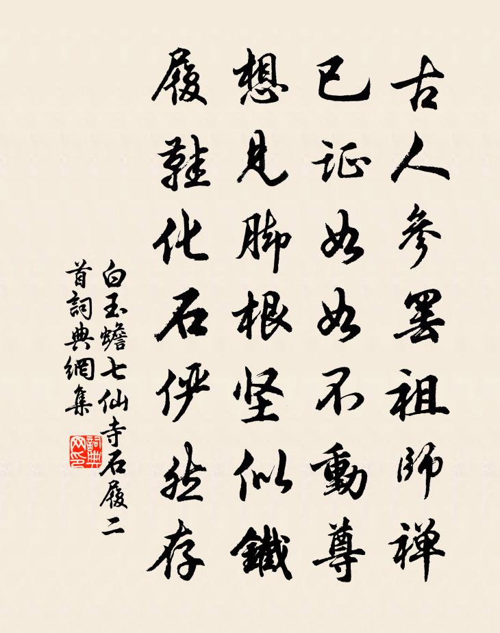 詩詞名句歷史字典書法欣賞書法字典國語詞典說文解字康熙字典古漢語字典標 題 作 者 詩 句 七仙寺石履二首作者:白玉蟾 朝代:宋代七仙寺石履二首原文古人參罷祖師禪,已證如如不動尊。想見腳根堅似鐵,履鞋化石儼然存。詩詞問答問:七仙寺石履二首的作者是誰?答:白玉蟾問:七仙寺石履二首寫於哪個朝代?答:宋代問:七仙寺石履二首是什麼體裁?答:七絕白玉蟾七仙寺石履二首書法欣賞七仙寺石履二首書法作品詩詞推薦擬古其十一李白〔唐代〕涉江弄秋水,愛此荷花鮮。攀荷弄其珠,蕩漾不成圓。佳人彩雲里,欲贈隔遠天。相思無由見,悵望涼風前。書室雜興陸游〔宋代〕秋水淺出灘,秋葉落成陣。方喜風露消,已嘆霜霰近。衰疾雖向平,死死亦堇堇。燈青地爐冷,吾學其少進?和溪翁二首胡仲弓〔宋代〕片帆湖海闊,移纜晉江濱。客思蛩邊老,秋蟬雁外新。同吟兒對榻,獨酌影隨身。暗卜歸時節,修書托便鱗。隨州錢相公輓歌三首梅堯臣〔宋代〕昔日傷歸國,今朝嘆舉輀。憂愁傳楚些,殄悴感周詩。文草明時訪,忠言故吏知。居常嗚咽涕,翻作眾人悲。車中許月卿六〔宋代〕路平正好坐車中,時有禽聲山翠濃。憑軾斜眸看法帖,開簾正面受春風。閒吟陸龜蒙〔唐代〕閒吟料得三更盡,始把孤燈背竹窗。一夜西風高浪起,不教歸夢過寒江。次韻君澤正月五日早見示方回〔宋代〕人人有此珠,萬古天地寶。法當潛厥光,蚌谷護其表。能使華岳移,可叱峽流倒。未若床缺足,梓匠不自造。脫華山中送從叔簡赴舉孟郊〔唐代〕石根百尺杉,山眼一片泉。倚之道氣高,飲之詩思鮮。於此逍遙場,忽奏別離弦。卻笑薜蘿子,不同鳴躍年。遁跡羅隱〔唐代〕遁跡知安住,沾襟欲奈何。朝廷猶禮樂,郡邑忍干戈。華馬憑誰問,胡塵自此多。因思漢明帝,中夜憶廉頗。茉莉鄭剛中〔宋代〕真香入玉初無信,香欲尋人玉始開。不是滿枝生綠葉,端須認作嶺頭梅。旅次湘沅有懷靈均孟郊〔唐代〕分拙多感激,久游遵長途。經過湘水源,懷古方踟躕。舊稱楚靈均,此處殞忠軀。側聆故老言,遂得旌賢愚。名參詠毀天樞李休烈〔唐代〕天門街上倒天樞,火急先須卸火珠。計合一條麻線挽,何勞兩縣索人夫。秦後作曹鄴〔唐代〕大道不居謙,八荒安苟得。木中不生火,高殿禍頃刻。誰將白帝子,踐我禮義域。空持拔山志,欲奪天地德。軹道茂陵封禪壇王奕〔宋代〕祥符天子舊明堂,二丈豐碑宿草荒。人世已非壇更是,摩挲老淚濕斜陽。大江曾極〔宋代〕烽煙歲歲滿江乾,將師誅求盍少寬。未得三軍如挾纊,憑誰數處護風寒。子虛賦司馬相如〔兩漢〕楚使子虛使於齊,王悉發車騎,與使者出田。田罷,子虛過奼烏有先生,亡是公在焉。坐定,烏有先生問曰:“今題蘇端明書乳泉賦後王學可〔宋代〕蘇公時聞道,文章乃其戲。乳泉出重海,作賦聊記異。玉池咽中夜,挈瓶非小智。氣者水之生,此語可深味。重賦三高周南〔宋代〕兒女呻吟歲又窮,也應無語對西風。向來一箸鱸魚意,贏得寒亭四壁空。木犀花羅與之〔宋代〕秋影連蜷隱士攀,渾無蜂蝶涴林間。何人說與陶元亮,未必東籬勝小山。送周洞之蜀趙湘〔唐代〕劍閣沖秋去,迢迢動鬱陶。千山非故國,九日莫登高。峽樹參天碧,巴猿向夕號。當壚人不在,何以慰離騷。名句推薦君子之德風,小人之德草,草上之風必偃。孔子弟子《論語·顏淵篇》 人以自是,反以相誹。呂不韋《呂氏春秋·覽·慎大覽》 靡靡秋已夕,淒淒風露交。陶淵明《己酉歲九月九日》 山中無甲子,寒盡不知年。吳承恩《西遊記·第一回》 空山不見人,但聞人語響。王維《鹿柴》 平林漠漠煙如織,寒山一帶傷心碧。李白《菩薩蠻·平林漠漠煙如織》 竹外一枝斜,想佳人,天寒日暮。曹組《驀山溪·梅》 荒村帶返照,落葉亂紛紛。劉長卿《碧澗別墅喜皇甫侍御相訪》 可憐赤壁爭雄渡,唯有蓑翁坐釣魚。杜牧《齊安郡晚秋》 搖鏡,則不得為明;搖衡,則不得為正韓非及後人《韓非子·飾邪》