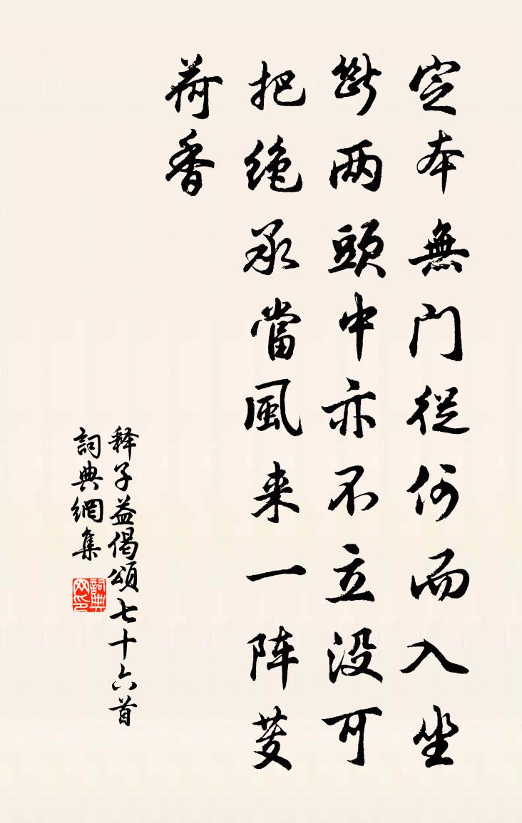 詩詞名句歷史字典書法欣賞書法字典國語詞典說文解字康熙字典古漢語字典標 題 作 者 詩 句 偈頌七十六首作者:釋子益 朝代:宋代偈頌七十六首原文定本無門,從何而入。坐斷兩頭。中亦不立。沒可把,絕承當,風來一陣芰荷香。詩詞問答問:偈頌七十六首的作者是誰?答:釋子益問:偈頌七十六首寫於哪個朝代?答:宋代釋子益偈頌七十六首書法欣賞偈頌七十六首書法作品詩詞推薦二王后-明祖宗之意也白居易〔唐代〕二王后,彼何人,介公酅公為國賓,周武隋文之子孫。古人有言天下者,非是一人之天下。周亡天下傳於隋,隋人又和寄提刑太保余靖〔宋代〕常記臨岐把酒杯,芳心應得見歸來。不從去日丁寧約,已向東風取次開。清燕固難停燭待,雕鞍須是著鞭催。欄邊湯泉道中賀鑄〔宋代〕青石岡西下,靈泉產藥苗。山英如有待,木客可相招。蟬帶風移樹,塵隨馬度橋。揚鞭吟舊句,歸路不知遙。寄朝宗二首吳芾〔宋代〕湖水春來拍岸平,山光幻出小蓬瀛。幽深未許凡人到,只待君來共落成。登鸛雀樓暢當〔唐代〕迥臨飛鳥上,高出世塵間。天勢圍平野,河流入斷山。烏賊魚梅堯臣〔宋代〕海若有醜魚,烏圖有烏賊。腹膏為飯囊,鬲冒貯飲墨。出沒上下波,厭飫吳越食。爛腸來雕蚶,隨貢入中國。中國白鶴峰新居欲成,夜過西鄰翟秀才,二首蘇軾〔宋代〕瓮間畢卓防偷酒,壁後匡衡不點燈。待鑿平江百尺井,要分清暑一壺冰。佐卿恐是歸來鶴,次律寧非過去僧。他日詩品二十四則。沖淡司空圖〔唐代〕素處以默,妙機其微。飲之太和,獨鶴與飛。猶之惠風,荏苒在衣,閱音修篁,美日載歸。遇之匪深,即之愈稀,喜遷鶯馮去非〔宋代〕涼生遙渚。正綠芰擎霜,黃花招雨。雁外漁村,蛩邊蟹舍,絳葉滿秋來路。世事不離雙鬢,遠夢偏欺孤旅。送望眼晨興寄贈竇使君(一作晨興贈友,寄呈竇使君)武元衡〔唐代〕江陵歲方晏,晨起眄庭柯。白露傷紅葉,清風斷綠蘿。徇時真氣索,念遠懷憂多。夙昔樂山意,縱橫南浦波。有美相次尋舉客寄住人(一作再經三叟居)周賀〔唐代〕停橈因舊識,白髮向波濤。以我往來倦,知君耕稼勞。渚田臨舍盡,坂路出檐高。游者還南去,終期伴爾曹。川上懷舊邵雍〔宋代〕地逈川原闊,村孤煙水閒。雷輕龍過浦,雲亂雨移山。田者荷鋤去,漁人背網還。伊予獨霑濕,猶在道途間。是夜聞十六兄雪中有作次韻杜范〔宋代〕晚山棲半白,晚岫勒斜紅。草草三杯里,悠悠一笑中。喜君才磊魄,雇我意蒙茸。伯仲壎篪處,空嗟不與同。霜天曉角(三衢道中)趙師俠〔宋代〕雨餘風勁。霧重千山暝。茅舍寒林相映。分明是、畫圖景。去程何日定。天遠長安近。喚起新愁無盡。全沒個、故寄嚴文炳陳造〔宋代〕善忘常憎醫,獨者自尊足。嚴子骯髒面,如我不諧俗。世情趣操間,憎愛岐珉玉。饒舌誇我賢,祗取白眼辱。恭和御製賜進士詩韻二首袁說友〔宋代〕堯言不數漢文章,漫說唐人萬丈光。百辟共知尊上指,群儒何止戴言揚。絲綸甫幸來中禁,琬琰俄欣奏上方。京邑風月陸游〔宋代〕鏡中日日鬢毛衰,八十還思七十時。風月不知人意緒,酒醒夢斷又催詩。姑熟雜詠。望夫山李赤〔唐代〕顒望臨碧空,怨情感離別。芳草不知愁,岩花但爭發。雲山萬重隔,音信千里絕。春去秋復來,相思幾時歇。一岩鄭清之〔宋代〕一岩洞空掛雲山,巧印穹蒼半璧環。只為廣寒宮殿遠,故留闕月在人間。豆葉坪陳大章〔〕朝望漢陽雲,暮植香山杖。長風如奔湍,千林共一響。前登見石坪,有庵大如掌。孤松翼嶺深,殘霞延月上。黃精名句推薦禮尚往來。往而不來,非禮也;來而不往,亦非禮也。戴聖《禮記·曲禮上》 綠陰不減來時路,添得黃鸝四五聲。曾幾《三衢道中》 禍在於好利;害在於親小人尉繚《尉繚子·十二陵》 雪洗虜塵靜,風約楚雲留張孝祥《水調歌頭·和龐佑父》 白兔搗藥秋復春,嫦娥孤棲與誰鄰?李白《把酒問月·故人賈淳令予問之》 山從人面起,雲傍馬頭生。李白《送友人入蜀》 為容不在貌,獨抱孤潔。張炎《疏影·梅影》 小池寒綠欲生漪,雨晴還日西。秦觀《阮郎歸·春風吹雨繞殘枝》 不知庭霰今朝落,疑是林花昨夜開。宋之問《苑中遇雪應制》 致君堯舜上,再使風俗淳。杜甫《奉贈韋左丞丈二十二韻》