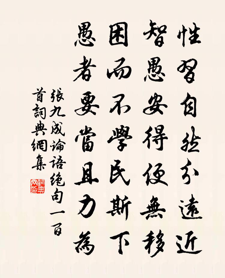 詩詞名句歷史字典書法欣賞書法字典國語詞典說文解字康熙字典古漢語字典標 題 作 者 詩 句 論語絕句一百首作者:張九成 朝代:宋代論語絕句一百首原文性習自然分遠近,智愚安得便無移。困而不學民斯下,愚者要當且力為。詩詞問答問:論語絕句一百首的作者是誰?答:張九成問:論語絕句一百首寫於哪個朝代?答:宋代張九成論語絕句一百首書法欣賞論語絕句一百首書法作品詩詞推薦承天潛師畫贊林之奇〔宋代〕金剛圈裹翻身過,栗棘蓬萊滿口吞。領得楊岐端的句,卻嫌蒸餅大餫飩。新豐折臂翁-戒邊功也白居易〔唐代〕新豐老翁八十八,頭鬢眉須皆似雪。玄孫扶向店前行,左臂憑肩右臂折。問翁臂折來幾年,兼問致折何因緣。翁雲吾身釋文珦〔宋代〕東西南北人,寂寞住岩澗。年衰鬢凝霜,客久衣絕襻。何須念粱肉,且復飲藜莧。猶患有吾身,身死即無患。酬馮十七舍人宿衛贈別五韻劉禹錫〔唐代〕少年為別日,隋宮楊柳陰。白首相逢處,巴江煙浪深。使星上三蜀,春雨沾衣襟。王程促速意,夜語殷勤心。卻歸縣齋張耒〔宋代〕只合門如野叟家,市朝聲利苦喧譁。但知得醉頻沽酒,何處逢春不見花。暗樹五更雞報曉,晚庭三疊鼓催衙。知君以青?飯分送襲美魯望因成一絕張賁〔唐代〕誰屑瓊瑤事青?,舊傳名品出華陽。應宜仙子胡麻拌,因送劉郎與阮郎。勝勝慢(冬至日,用劉春卿韻,送彥逢弟赴官西興)王之道〔宋代〕魯雲書瑞,周日迎長,曉占緹室飛灰。玉勒朝天,千門禁鑰齊開。簾卷扇分雉尾,香風遠、人到蓬萊。霞觴滿,□懷故友楊方叔姜特立〔宋代〕遊戲人間世,清虛物外緣。皇家雖結網,空谷竟遺賢。無恨堪懸劍,傷心有斷弦。今年湯餅約,為爾一悽然。出居十六詠歸來館方岳〔宋代〕歸來遽雲出,既出又歸來。自處苟如此,淵明安在哉。再題趙蕃〔宋代〕既悟當寒雨,乃知霧乃晴。病軀聊自適,閒望亦增明。絮落還將化,荷新且解擎。懷哉老將至,沒世曷為名。田舍文同〔宋代〕園林曉氣清,籬巷夕陽明。石竇聞寒碓,煙坡見晚耕。豚蹄供禱賽,龜殼問陰晴。欲識豐年樂,一村雞犬聲。汴州留別韓愈孟郊〔唐代〕不飲濁水瀾,空滯此汴河。坐見繞岸水,盡為還海波。四時不在家,弊服斷線多。遠客獨憔悴,春英落婆娑。汴水重午飲趙園再和項安世〔宋代〕香玉尊前剝嫩金,已逢佳節又逢霖。從教歲月催華發,誰識乾坤有賞心。家在山林仍近市,手栽花木漸成陰。更開和韻胡希聖湖上仇遠〔宋代〕連作湖山五日游,沙鷗慣識木蘭舟。清風寒日荒城晚,燕子梨花細雨愁。賜火恩榮皆舊夢,禁菸風景似初秋。風絲題紫霄觀胡則〔宋代〕綺霞重疊武陵溪,溪嶺相逢路不迷。白石洞天人不到,碧桃花下馬頻嘶。深傾玉液琴聲細,旋煮胡麻月色低。猶恨黃漿山黃鵬舉〔宋代〕清泉徹底瑩無泥,喚作黃漿恐未宜。若見洞仙還寄語,佳名當喚碧琉璃。次韻劉貢父從駕蘇轍〔宋代〕一經空記弟傳兄,舊德終慚比長卿。扈駕聯翩來接武,登科先後憶題名。竹林共集連諸子,棣萼相輝賴友生。它日挽郭處士劉克莊〔宋代〕昔聞東郭先生者,處士寧非是遠孫。空有新詩喧一邑,竟無明詔老孤村。雷琴酷愛應同殉,草字尤工惜不存。復說洞仙歌佚名〔宋代〕千崖滴翠。正秋高時候。橙黃橘綠又重九。有蓬壺仙子、赤鯉來游,風雲會,施展經綸妙手。去年稱壽處,北斗天錢寺丞知白州李覯〔宋代〕大邑歌謠日尚新,忽驚千騎擁行塵。宦遊莫嘆登長道,天意先教福遠人。城在海隅門少客,地鍾陽氣景常春。政成名句推薦陰晴圓缺都休說,且喜人間好時節。徐有貞《中秋月·中秋月》 隋堤上、曾見幾番,拂水飄綿送行色。周邦彥《蘭陵王·柳》 是是、非非謂之知,非是、是非謂之愚。荀子《荀子·修身》 枝枝相糾結,葉葉競飄揚。李白《古意》 飛雪過江來,船在赤欄橋側。呂渭老《好事近·飛雪過江來》 文章已滿行人耳,一度思卿一愴然。李忱《吊白居易》 興化致教,必由進善;康國寧人,莫大理惡。范曄《後漢書·列傳·伏侯宋蔡馮趙牟韋列傳》 不寶金玉,而忠信以為寶戴聖《禮記·儒行》 相知無遠近,萬里尚為鄰。張九齡《送韋城李少府》 午枕夢初殘,高樓上,獨憑闌乾。朱栴《青杏兒·秋》