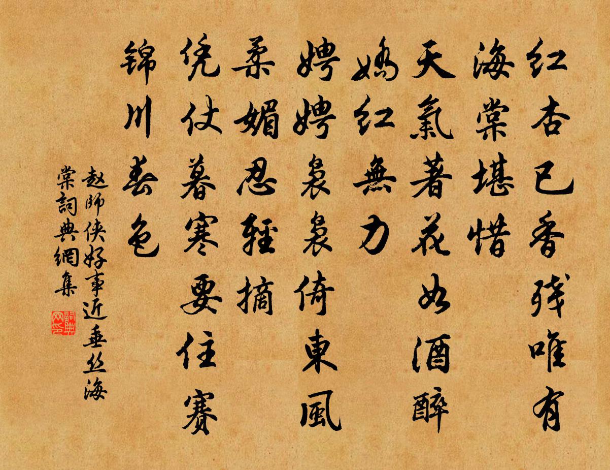 詩詞名句歷史字典書法欣賞書法字典國語詞典說文解字康熙字典古漢語字典標 題 作 者 詩 句 好事近(垂絲海棠)作者:趙師俠 朝代:宋代好事近(垂絲海棠)原文紅杏已香殘,唯有海棠堪惜。天氣著花如酒,醉嬌紅無力。娉娉裊裊倚東風,柔媚忍輕摘。憑仗暮寒要住,賽錦川春色。詩詞問答問:好事近(垂絲海棠)的作者是誰?答:趙師俠問:好事近(垂絲海棠)寫於哪個朝代?答:宋代問:好事近(垂絲海棠)是什麼體裁?答:詞趙師俠好事近(垂絲海棠)書法欣賞好事近(垂絲海棠)書法作品詩詞推薦賀仲雨斗門陳藻〔宋代〕濯錦江邊唱絕強,孤青和者亦夔襄。歷年雖久地相遠,在寢豈止升渠堂。縱能帖石防頹岸,隨寓幽居供賞玩。何發種柏寄蘇子美韓維〔宋代〕人皆種花我種柏,為此勁性寒不易。三春雖憐少姿媚,歲暮方看靄顏色。南堂之南可數到,列樹六本翠磔磔。安得鳳山即事釋紹嵩〔宋代〕久欠游山債,因尋溪上村。風沙輕漠漠,煙樹遠昏昏。土甑封茶葉,石泉通竹根。榰筇聊小立,老子笑無言。述懷馮觀國〔宋代〕落魄蘭寰觸處然,深藏妙用散神仙。筆端間作龍蛇走,壺裹常挑日月懸。漫假人倫來混世,只將酒盞度流年。潛修有所思白玉蟾〔宋代〕蒼官無祿花有封,花王開國胙春風。不念蒼官秦大夫,竹君亦嗤梅兄聾。夜寒愁吟正無思,青燈喚人補殘睡。夢為小兒不畏虎蘇軾〔宋代〕有婦人晝日置小兒沙上而浣衣於水者。虎自山上馳來,婦人倉皇沉水避之。二小兒戲沙上自若。虎熟視久之,至以南陽澗陳岩〔宋代〕人家四散占荒丘,曉夜悲鳴澗水流。點點寒鴉來不盡,昏雲頹日古猷州。送木宗院徐照〔宋代〕此職司天派,員分南與西。事稀從吏懶,詩好笑人低。丹荔開屏畫,青榕蓋鶴棲。必思隨侍日,曾有舊留題。別達觀文鑒二大士梅堯臣〔宋代〕雲衲山中來,畫橈江上發。何日到山中,山花應未歇。題王岩起樂齋張元乾〔宋代〕宦遊酒適樂土,酒宴坐名樂酒齋。問君酒何獨樂,胸中高崔嵬。軒裳儻來物,世途吁可哀。紛然雞鶩爭,陷阱成禍次朱少章韻晁說之〔宋代〕喜就三冬學,仍開橘秫齏。星霜吳地客,風雨鄭人雞。兔興逢蓬溜,高懷絕石梯。五言何富麗,種玉不論畦。題德章山郭養源墨竹王之道〔宋代〕胸次富盤錯,筆端妙蒼翠。霜枝豈人為。菸葉有生意。與可骨已朽,此法誰復嗣。偉哉尋丈姿,綽有萬心勢。和子由除夜元日省宿致齋三首蘇軾〔宋代〕江淮流落豈關天,禁省相望亦偶然。等是新年未相見,此身應坐不歸田。白髮蒼顏五十三,家人強遣試春衫。朝回明遠閣陳起〔宋代〕風卷疏煙遠岫分,天開一鏡皎無雲。衰荷搖落汀洲晚,猶舞餘香墜茜裙。酬通事舍人寓直見示篇中兼起居陸舍人景獻張九齡〔唐代〕軒掖殊清秘,才華固在斯。興因膏澤灑,情與惠風吹。所美應人譽,何私亦我儀。同聲感喬木,比翼謝長離。價以對酒陸游〔宋代〕醫從和扁來,未著卻老方。吾晚乃得之,莫如麴櫱良。一杯臉生春,況復累十觴。坐令桃花紅,換盡霜葉黃。看鏡江闊陳允平〔宋代〕江闊雁聲遙,何人共寂寥。青天不可問,明月若為邀。俠士夸騎鶴,蠻奴學射鵰。平生堂下柳,聊復伴秋宵。至日戲題天福寺黃公度〔宋代〕去年至日老夫家,呼兒具酒對梅花。今年至日空奔走,豈止無花亦無酒。薄宦驅人無已時,客懷牢落強裁詩。君不暮春汪應辰〔宋代〕閉門聽風雨,不知門外春。茲辰聊散步,霽色如相親。日月不吾與,花柳隨時新。悠悠竟何事,悚然懷故人。聲聲慢史可堂〔宋代〕羞朱妒粉,染霧裁雲,淡然蒼佩仙裳。半額蜂妝,莫道梳洗家常。碧羅亂縈小帶,翠虬寒、一架清香。春思苦,倚名句推薦水滿有時觀下鷺,草深無處不鳴蛙。陸游《幽居初夏》 無情明月,有情歸夢,同到幽閨。劉基《眼兒媚·秋思》 舉大事必有所資李大師、李延壽《南史·列傳·卷五十三》 墜粉飄香,日日喚愁生。盧祖皋《江城子·畫樓簾暮卷新晴》 仁者見之謂之仁,知者見之謂之知佚名《易傳·繫辭傳上·第五章》 日射紗窗風撼扉,香羅拭手春事違。李商隱《日射》 三軍可奪帥也,匹夫不可奪志也。佚名《論語十二章》 我來圯橋上,懷古欽英風。李白《經下邳圯橋懷張子房》 必得之事,不足賴也;必諾之言,不足信也。管仲《管子·形勢》 河水縈帶,群山糾紛。李華《弔古戰場文》