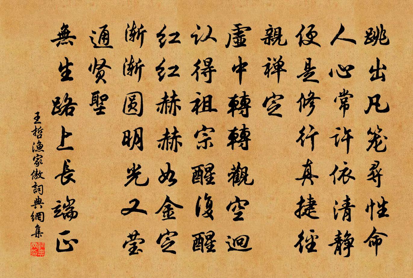 詩詞名句歷史字典書法欣賞書法字典國語詞典說文解字康熙字典古漢語字典標 題 作 者 詩 句 漁家傲作者:王哲 朝代:元代漁家傲原文跳出凡籠尋性命。人心常許依清靜。便是修行真捷徑。親禪定。虛中轉轉觀空迥。認得祖宗醒復醒。紅紅赫赫如金定。漸漸圓明光又瑩。通賢聖。無生路上長端正。詩詞問答問:漁家傲的作者是誰?答:王哲問:漁家傲寫於哪個朝代?答:元代問:漁家傲是什麼體裁?答:詞王哲漁家傲書法欣賞漁家傲書法作品詩詞推薦水調歌頭劉之翰〔宋代〕涼露洗金井,一葉下梧桐。謫仙浪遊,何事華發作詩翁。烏帽蕭蕭一幅,坐對清泉白石,矯首撫長松。獨鶴歸來晚林卿見訪食檳榔而醉明日示詩次韻一首劉克莊〔宋代〕壯於蒳子大於榛,咀嚼全勝麴櫱春。俚俗相傳祛瘴厲,方書或謂健脾神。素知鯨量安能醉,但取雞心未必真。一笑和劉春卿秋夜對月王之道〔宋代〕天宇澄清桂影秋,騷人乘興欲登樓。樓前白水三千頃,滉滉鎔銀爛不收。語松竹韋莊〔唐代〕庭前芳草綠於袍,堂上詩人慾二毛。多病不禁秋寂寞,雨松風竹莫騷騷。歸夢陳杰〔宋代〕人事擾多智,天機行不言。庭榴華就實,梁燕子生孫。西嶺千家月,南湖百丈潭。晚風吹{禾罷}稏,歸夢繞江村坐客宋周士忽垂光和復用元韻答之三首強至〔宋代〕風流雙腕轉凝酥,舞徹伊州汗有珠。探手始知簾外冷,照堂獸炭焰圍爐。張德夫園亭八詠山椒王炎〔宋代〕百尺雲根老,斑斑長綠苔。幽尋穿窈眺步崔嵬。地脈元無此,人心亦巧哉。千年湖底石,幻作小飛來。次韻王鞏同飲王廷老度支家戲詠蘇轍〔宋代〕白魚紫蟹早霜前,有酒何須問聖賢。上客遠來工緩頰,雙鬟為出小垂肩。新傳大曲皆精絕,忽發狂言亦可憐。莫怪楊本勝說於長安見小男阿袞李商隱〔唐代〕聞君來日下,見我最嬌兒。漸大啼應數,長貧學恐遲。寄人龍種瘦,失母鳳雛痴。語罷休邊角,青燈兩鬢絲。好女兒晏幾道〔宋代〕酌酒殷勤,盡更留春。忍無情、便賦餘花落。待花前細把、—春心事,問個人人。莫似花開還謝,願芳意、且長新登西山望硤石湖白居易〔唐代〕菱歌清唱棹舟回,樹里南湖似鑒開。平障煙浮低落日,出溪路細長新苔。居民地僻常無事,太守官閒好獨來。猶憶酬微之夸鏡湖白居易〔唐代〕我嗟身老歲方徂,君更官高興轉孤。軍門郡閣曾閒否,禹穴耶溪得到無。酒盞省陪波卷白,骰盆思共彩呼盧。一泓觀我四首 病張問陶〔清代〕毒草靈苗大小符,門庭風景半醫巫。形神久隔生原幸,人鬼交爭勢轉孤。枕上心魂疑岸獄,眼中眠食羨妻孥。瓣香丙子秋作陳藻〔宋代〕今年時雨即時晹,用向田園每恰當。刈者不愁耕者喜,似曾真宰與商量。過郭代公故宅杜甫〔唐代〕豪俊初未遇,其跡或脫略。代公尉通泉,放意何自若。及夫登袞冕,直氣森噴薄。磊落見異人,豈伊常情度。定策守歲五首薛嵎〔宋代〕新歲才餘七日糧,燈前猶自笑人忙。茅檐霜下寒衣薄,爇盡蒹葭夜更長。張惕山人即昔所謂惠思師也余舊識之於京師忽蘇轍〔宋代〕昔日高僧今白衣,人生變化定難知。故人相見不相識,空怪解吟無本詩。聽誦長江近章句,喜逢澄觀已冠巾。醉吟郡齋與龔濟叔劉薰卿談詩曾豐〔宋代〕其奈魚蟲草木何,詩之機械也無多。氣猶動志平心養,聲可成文泛口喔。玄酒太羹君子淡,蕢桴土鼓聖人和。鬼神故運使直閣少聊劉公輓詞韓元吉〔宋代〕清時得路每投閒,垂上甘泉玉筍班。借箸幾看趨魏闕,請纓常欲度天山。放懷俠氣千夫上,抵掌高談一夢間。使節風雨不出仇遠〔宋代〕儒宮少公事,閒坐如家居。閉戶聽風雨,重讀架上書。豈無借書瓻,小酌勿用沽。豈無苜蓿盤,園丁送喜蔬。溪童名句推薦脅肩諂笑,病於夏畦。孟子《孟子·滕文公章句下·第七節》 余凡事喜獨出己見,不屑隨人是非。沈復《浮生六記·浪遊記快》 汗血每隨邊地苦,蹄傷不憚隴陰寒。萬楚《驄馬》 不畏浮雲遮望眼,只緣身在最高層王安石《登飛來峰》 田家幾日閒,耕種從此起。韋應物《觀田家》 玉輪碾平芳草,半面惱紅妝。陳子龍《訴衷情·春遊》 鳳凰台上鳳凰游,鳳去台空江自流。李白《登金陵鳳凰台》 長相思,長相思。晏幾道《長相思·長相思》 強欲登高去,無人送酒來。岑參《行軍九日思長安故園》 聞說東風亦多情,被竹外、香留住。史達祖《留春令·詠梅花》