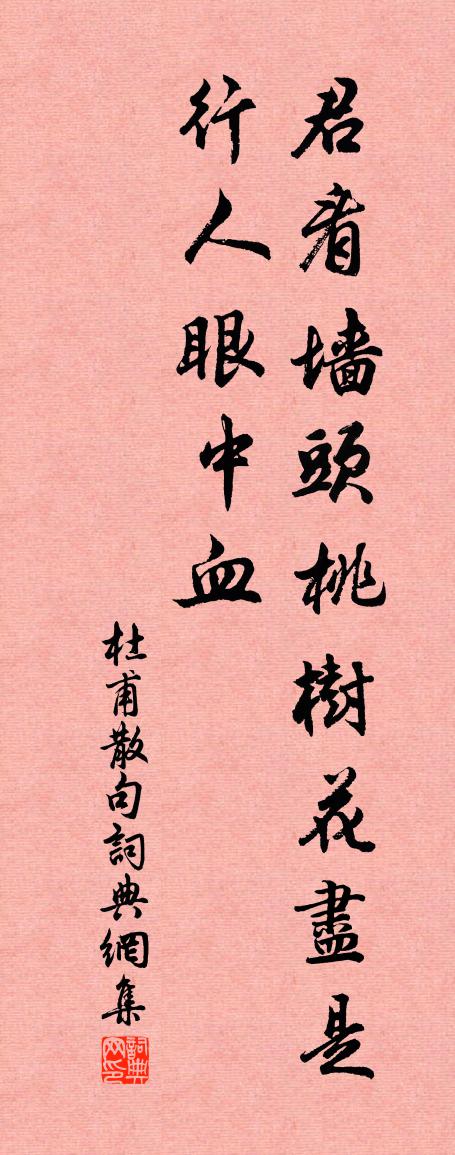詩詞名句歷史字典書法欣賞書法字典國語詞典說文解字康熙字典古漢語字典標 題 作 者 詩 句 句作者:杜甫 朝代:唐代句原文君看牆頭桃樹花,儘是行人眼中血。 詩詞問答問:句的作者是誰?答:杜甫問:句寫於哪個朝代?答:唐代問:句是什麼體裁?答:七絕問:杜甫的名句有哪些?答:杜甫名句大全杜甫句書法欣賞句書法作品詩詞推薦次韻楊明叔四首黃庭堅〔宋代〕匹士能光國,三孱不滿隅。竊觀今日事,君與古人俱。氣類鶯求友,精誠石望夫。雷門震驚手,待汝一援桴。憶窊石章氏女子仇遠〔宋代〕湖樹江雲隔杳冥,千峰萬壑夢中青。懸知茅屋孤燈下,逐字教兒讀孝經。落花高蟾〔唐代〕一葉落時空下淚,三春歸盡復何情。無人共得東風語,半日尊前計不成。和人次韻魚玄機〔唐代〕喧喧朱紫雜人寰,獨自清吟日色間。何事玉郎搜藻思,忽將瓊韻扣柴關。白花發詠慚稱謝,僻巷深居謬學顏。不用過峽州宿青草灘項安世〔宋代〕煙里鳴橈去夕陽,不堪風急滯歸航。無端更著三更月,一夜孤篷一寸霜。韓廷玉築亭於官舍之旁園中故多梅會有飛雪予張栻〔宋代〕南州要是梅開早,北客巡檐偏眼明。一夜飛花來點綴,新亭而復得佳名。玉泉看金魚徐集孫〔宋代〕石沼鑿瓊瑤,金鱗數百條。年深須變化,泉潔自逍遙。網罟難垂手,公卿擬上腰。龍宮衣梵法,翻水雨青霄。契友夜酌聯句趙汝域〔宋代〕銀燈清談久,鄉情異路真。醉能忘世故,狂欲靜風塵。細踏梅花月,長謳栗里春。病少愈偶作陸游〔宋代〕病入秋來不可當,便從此逝亦何傷!百錢布被斂首足,三寸桐棺埋澗崗。但恨著書終草草,不嫌徂歲去堂堂。今朝郊廟歌辭。德明興聖廟樂章。登歌奠幣李紓〔唐代〕四時有典,百事來祭。尊祖奉宗,嚴禋大帝。禮先蒼璧,奠備黝制。於萬期年,熙成帝系。命鹿張鎡〔宋代〕雙鹿林泉友,新居後我成。角低方長旺,斑嫩未分明。濯濯菰塘晚,呦呦草逕晴。仙疇吾種玉,汝輩耦而耕。宋頌九首莫醜石介〔宋代〕莫魂匪虺,莫悍匪兕。有鋹在南,毒赨不已。送熊掌熊白葉寘〔宋代〕熊掌舍魚吾有取,自幼嘗聞子車語。飯香獵戶分熊白,妙語涪翁乃能吐。世間兩味果稱珍,故人念我肯珍分。數千長沙歷冬無雪正月十日與客登捲雲亭望西山始張栻〔宋代〕冬溫氣苦盭,玄冥未書勛。薄雪殿余臘,一夜收楚氛。歡欣想農圃,潤澤到蒿芹。我亦破曉出,喚客來捲雲。蒼蒼沁園春侯善淵〔元代〕大道玄微,亘古常存,依舊儼然。自心迷不悟,沉淪生死,回頭改面,販骨如山。今日方知,本來模樣,棄假還真重陽日寄上饒李明府劉商〔唐代〕重陽秋雁未銜蘆,始覺他鄉節候殊。旅館但知聞蟋蟀,郵童不解獻茱萸。陶潛何處登高醉,倦客停橈一事無。來歲題開元寺門閣杜荀鶴〔唐代〕一登高閣眺清秋,滿目風光盡勝游。何處畫橈尋綠水,幾家鳴笛咽紅樓。雲山已老應長在,歲月如波只暗流。唯有沁園春(孟守美在)王邁〔宋代〕臞老今朝,載酒渡紅,關孟吉州。遇舟之人士,來前問政,此公官去,莫也宜留。老子日嘻,我遊宦海,幾度遭他踏莎行(與莫兩山譚邗城舊事)周密〔宋代〕遠草情鍾,孤花韻勝。一樓聳翠生秋暝。十年二十四橋春,轉頭明月簫聲冷。賦藥才高,題瓊語俊。蒸香壓酒芙蓉雨霽宿薦福寺遣問寺僧曾豐〔宋代〕松筠邀我梵王宮,耳目俱醒骨肉融。風雨收聲禪入寂,煙雲斂色法歸空。出浮漚外不生滅,從浩劫來無異同。問數名句推薦青山綠水,白草紅葉黃花。白樸《天淨沙·秋》 寺憶曾游處,橋憐再渡時。杜甫《後游》 龍蛇四海歸無所,寒食年年愴客心。屈大均《壬戌清明作》 不剪春衫愁意態。過收燈、有些寒在。史達祖《夜行船·正月十八日聞賣杏花有感》 深山畢竟藏猛虎,大海終須納細流。佚名《增廣賢文·上集》 曉寒料峭尚欺人,春態苗條先到柳。毛滂《玉樓春·己卯歲元日》 本是同根生,相煎何太急?曹植《七步詩》 邊月隨弓影,胡霜拂劍花。李白《塞下曲六首》 海記憶體知己,天涯若比鄰。王勃《送杜少府之任蜀州 / 送杜少府之任蜀川》 三歲為婦,靡室勞矣。夙興夜寐,靡有朝矣。佚名《氓》