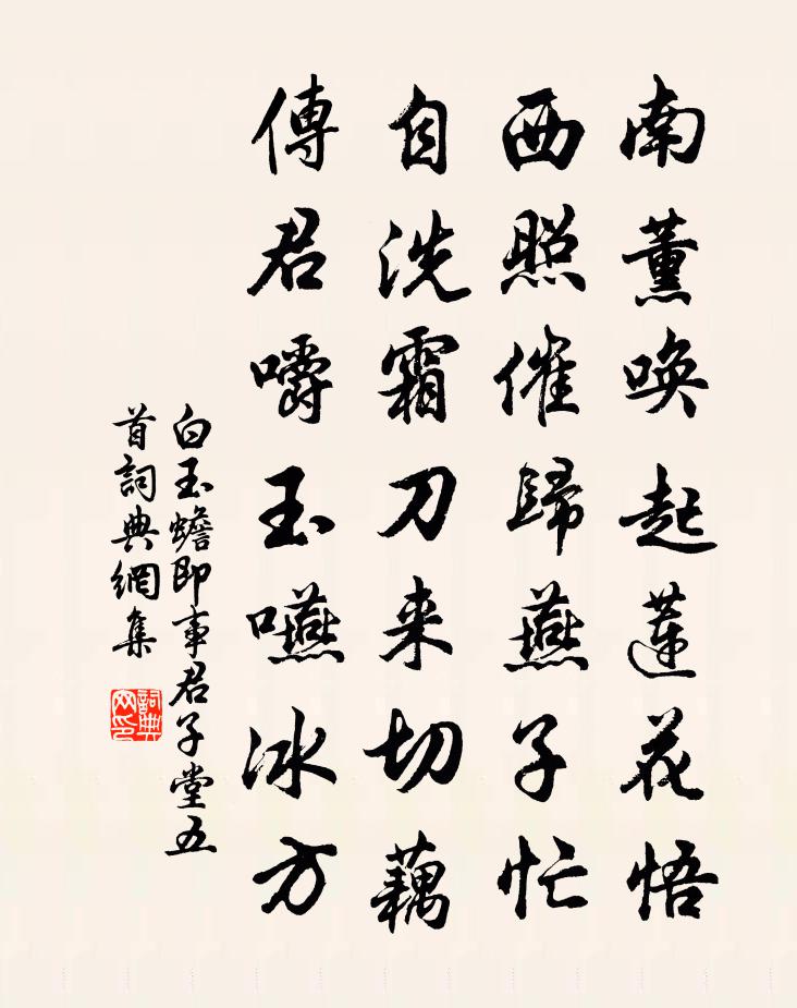 詩詞名句歷史字典書法欣賞書法字典國語詞典說文解字康熙字典古漢語字典標 題 作 者 詩 句 即事君子堂五首作者:白玉蟾 朝代:宋代即事君子堂五首原文南薰喚起蓮花悟,西照催歸燕子忙。自洗霜刀來切藕,傳君嚼玉嚥冰方。詩詞問答問:即事君子堂五首的作者是誰?答:白玉蟾問:即事君子堂五首寫於哪個朝代?答:宋代問:即事君子堂五首是什麼體裁?答:七絕白玉蟾即事君子堂五首書法欣賞即事君子堂五首書法作品詩詞推薦宿鎮江丹陽館傅夢得〔宋代〕暫泊喜天晴,丹陽住晚程。半窗留月色,隔岸送鐘聲。江繞金山寺,雲生鐵瓮城。片帆催早發,莫待暗潮平。即事鄭剛中〔宋代〕小徑客來穿竹入,草亭涼到枕書眠。鳥呼人笑荔枝熟,如此對州已二年。蘧庵先生五日有魚酒之餉醉後填詞陳維崧〔清代〕蒲酒濃如乳。更為我、東溟斫鱠,大魚就脯。攜酒石榴花下醉,還選腹腴親煮。耳熱也、休提今古。只有寒潮圍故題扇二十四首曹勛〔宋代〕老境惟期得醉歌,何能浩蕩涉風波。關山月白聞歸雁,風雨秋深想釣蓑。題魏鵬臥屏賈雲華〔宋代〕柳芳菲二月時後,名園剩有牡丹枝。風流杜牧還知否,莫恨尋春去較遲。出居十六詠歸來館方岳〔宋代〕歸來遽雲出,既出又歸來。自處苟如此,淵明安在哉。採藥徑釋文珦〔宋代〕采芭歸來跡已陳,真風千古蛻凡塵。細看舊徑青青草,猶是仙人醉里春。和人魚玄機〔唐代〕茫茫九陌無知己,暮去朝來典繡衣。寶匣鏡昏蟬鬢亂,博山爐暖麝煙微。多情公子春留句,少思文君晝掩扉。莫惜雹鄧肅〔宋代〕黑雲壓山山欲頹,阿香推車震不開。廣寒宮中珠徑雨,狂風傾下九天來。高堂砰轟倒四壁,萬瓦飛空如轉石。燈火題禪院喻鳧〔唐代〕無花地亦香,有鶴松多直。向此奚必孤,山僧盡相識。游武夷楊時〔宋代〕函關崎嶔走秦鹿,天下並逐爭群雄。抉雲翻空鰲足折,黔黎竄伏如寒蛩。武夷山深水清泚,避世猶有高人蹤。龍泓溝泥二首張耒〔宋代〕溝泥不可步,況復雨清晨。下直休半日,閉門閒晚春。著書聊爾耳,隱市笑徒雲。買酒待新月,奈茲千里雲。宮詞宋白〔宋代〕春宵宮女著春綃,鈴索無風自動搖。晝下珠口簾猧子睡,紅蕉窠下對芭蕉。花想容(武陵春)賀鑄〔宋代〕南國佳人推阿秀,歌醉幾相逢。雲想衣裳花想容。春未抵情濃。津亭回首青樓遠,簾箔更重重。今夜扁舟淚不供。送晏桂山赴高沙郡張蘊〔宋代〕青衫赴闕已三遷,紅旆臨州不五年。舊吏侉榮從事府,新民迎擁使君韉。牡丹池館春融日,蓴葉汀洲水漲天。自是荊門暮冬與節公話別齊己〔唐代〕漳河湘岸柳關頭,離別相逢四十秋。我憶黃梅夢南國,君懷明主去東周。幾程霜雪經殘臘,何處封疆過舊遊。好及次韻王定國會飲清虛堂蘇軾〔宋代〕何遜揚州又幾年,官梅詩興故依然。何人可復間季孟,與子不妨中聖賢。卜築君方淮上郡,歸心我已劍南川。此身寄林編修林景熙〔宋代〕大雅凋零尚此翁,醉鄉一笑寄無功。衣冠洛社浮雲散,弓劍橋山落照空。東魯有書藏古壁,西湖無樹挽春風。巾車江南五首劉克莊〔宋代〕具艦逃安往,焚巢潰不支。區區一州力,不足辱王師。感遇二十五首張耒〔宋代〕釁隙不在大,巫臣圖夏姬。百端終困楚,吳子會黃池。怨有大於此,居高易逢危。何言戒困獸,無易簀中屍。名句推薦問別來、解相思否。吳文英《惜秋華·七夕前一日送人歸鹽官》 知人既以為難,自知誠亦不易。吳兢《貞觀政要·卷三·論擇官》 北極朝廷終不改,西山寇盜莫相侵。杜甫《登樓》 胡馬嘶風,漢旗翻雪,彤雲又吐,一竿殘照。時彥《青門飲·寄寵人》 下貧則上貧,下富則上富。荀子《荀子·富國》 窮則變,變則通,通則久。佚名《易傳·繫辭傳下·第二章》 多言數窮,不如守中。老子《老子·道經·第五章》 雪霏霏,風凜凜,玉郎何處狂飲?魏承班《滿宮花·雪霏霏》 塘上有塔院,中秋夜曾隨吾父觀潮於此。沈復《浮生六記·浪遊記快》 從別後,憶相逢,幾回魂夢與君同。晏幾道《鷓鴣天·彩袖殷勤捧玉鍾》