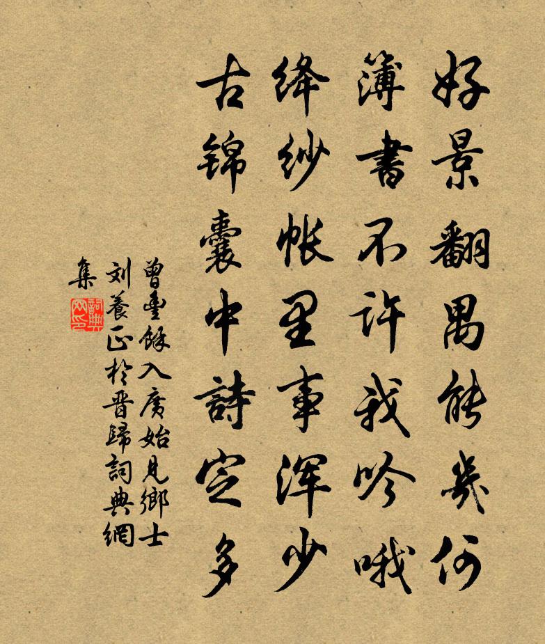 詩詞名句歷史字典書法欣賞書法字典國語詞典說文解字康熙字典古漢語字典標 題 作 者 詩 句 余入廣始見鄉士劉養正於晉歸作者:曾豐 朝代:宋代原文好景翻禺能幾何,簿書不許我吟喔。絳紗帳里事渾少,古錦囊中詩定多。詩詞問答問:《余入廣始見鄉士劉養正於晉歸》的作者是誰?答:曾豐問:該詩寫於哪個朝代?答:宋代書法欣賞余入廣始見鄉士劉養正於晉歸書法作品詩詞推薦施經偈馮楫〔宋代〕我賦躭痂癖,有財貯空虛。不作子孫計,不為車馬速。不充玩好用,不買聲色娛。置錐無南畝,片瓦無屋廬。所得仲鹹就加郡印因以四韻賀而勉之王禹偁〔宋代〕如何小郡滯清賢,未得徵歸振鷺班。莫怕三年持漢詔,猶勝遷客臥商山。俱諳宦路須推命,同有詩情合好閒。唯是寄謝觀劉得仁〔唐代〕十五年餘苦,今朝始遇君。無慚於白日,不枉別孤雲。得失天難問,稱揚鬼亦聞。此恩銷鏤骨,吟坐葉紛紛。俠客行(一作齊梁體)溫庭筠〔唐代〕欲出鴻都門,陰雲蔽城闕。寶劍黯如水,微紅濕餘血。白馬夜頻嘶,三更霸陵雪。次韻文少激祈雨有感黃庭堅〔宋代〕窮儒憂樂與民同,何況朱輪職勸農。終日虀鹽供一飯,幾時膚寸冒千峰。未須丘垤占鳴鸛,只要朝廷起臥龍。從此道場山張蘊〔宋代〕訪碑無古蹟,丹碧覆嵯峨。塔向城中共,山從寺右多。疏鬆涉溪路,遠漊太湖波。何鍇書堂在,猶嫌隔翠蘿。雜詠一百首房老劉克莊〔宋代〕殘香猶在笥,舊曲尚書裙。不及新歌舞,樽前奉主君。皇雅十首《天監》四章尹洙〔宋代〕淮潞弗虔,卒汙叛跡。戎輅戒嚴,皇威有赫。彼寇詿民,吾勇其百。殄厥渠魁,貸其反側。句薛據〔唐代〕省署開文苑,滄浪學釣翁。打冰詞吳偉業〔清代〕北河風高水生骨,玉壘銀橋堆幾尺。新戍雲中千騎馬,橫津直渡無行跡。下流湍悍川途開,吹笳官舫從南來。帆檣和劉對與顧龍山探梅四首劉宰〔宋代〕玉骨冰肌淑且真,只應姑射可為鄰。東風次第吹桃李,輸與儂愛第一春。虞察院生日姜特立〔宋代〕天詔飛傳速置郵,雙溪門外足行舟。橙黃橘綠風光好,並看西湖十里秋。臨江仙(次韻尚書兄送別)李彌遜〔宋代〕枝上子規催去旆,柳條偏系離情。片雲留雨鎖愁城。不堪明月夜,寂寞照南榮。莫作東山今日計,風雷已促鵬程。浪淘沙佚名〔宋代〕我有一張琴。隨坐隨行。無弦勝似有弦聲。欲對人前彈一曲,不遇知音。夜靜響琤轟。神鬼俱驚。驚天動地若雷鳴發金陵吳則禮〔宋代〕湖海歸來近釣筒,此身南北一飄篷。船頭已壓三山浪,檣尾初回五兩風。天淡鼓聲催落日,雲高帆影趁飛鴻。道林新月趙嘏〔唐代〕玉鉤斜傍畫檐生,雲匣初開一寸明。何事最能悲少婦,夜來依約落邊城。浪淘沙(和上元王仇香猷、含山邵梅仙有煥敘別)張榘〔宋代〕風色轉東南。翠擁層巒。杏花疏雨逗清寒。鍾阜石城何處是,煙靄漫漫。行旆已西關。一霎時間。芳樽聊復挽餘歡錦亭晚矚宋祁〔宋代〕長夏宜高明,緩帶散煩窘。憑軒一超然,目與天共盡。山從雲端現,日就林外隱。風來草樹披,煙生共閭近。自公九日從宋公戲馬台集送孔令詩謝靈運〔南北朝〕季秋邊朔苦。旅鴈違霜雪。淒淒陽卉腓。皎皎寒潭絜。良辰感聖心。雲旗興暮節。鳴葭戾朱宮。蘭巵獻時哲。餞宴句鄭冠卿〔唐代〕不緣過去行方便,安得今朝會碧虛。(棲霞洞遇日華月華君)名句推薦寵辱不驚,肝木自寧陳繼儒《小窗幽記·集靈篇》 落日照大旗,馬鳴風蕭蕭。杜甫《後出塞五首》 桐花半畝,靜鎖一庭愁雨。周邦彥《瑣窗寒·寒食》 無人調護,自去經心。沈復《浮生六記·閨房記樂》 白下有山皆繞郭,清明無客不思家。高啟《清明呈館中諸公》 山僧過嶺看茶老,村女當壚煮酒香。祝允明《首夏山中行吟》 常山臨代郡,亭障繞黃河。王褒《渡河北》 獨睡起來情悄悄,寄愁何處好。納蘭性德《謁金門·風絲裊》 弓背霞明劍照霜,秋風走馬出鹹陽。令狐楚《少年行四首·其三》 日暮長江里,相邀歸渡頭。儲光羲《江南曲四首》