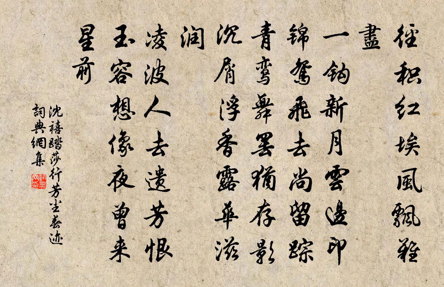 詩詞名句歷史字典書法欣賞書法字典國語詞典說文解字康熙字典古漢語字典標 題 作 者 詩 句 踏莎行 芳塵春跡作者:沈禧 朝代:元代踏莎行 芳塵春跡原文徑積紅埃,風飄難盡。一鉤新月雲邊印。錦鴛飛去尚留蹤,青鸞舞罷猶存影。沉屑浮香,露華滋潤。凌波人去遺芳恨。玉容想像夜曾來,星前詩詞問答問:踏莎行 芳塵春跡的作者是誰?答:沈禧問:踏莎行 芳塵春跡寫於哪個朝代?答:元代問:踏莎行 芳塵春跡是什麼體裁?答:詞沈禧踏莎行 芳塵春跡書法欣賞踏莎行 芳塵春跡書法作品詩詞推薦厭雨趙處澹〔宋代〕擬欲占晴待暮鴉,不禁愁思滿蒹葭。片雲飛渡風和雨,斜日低穿水浸沙。薏苡石邊收釣笠,芙蓉籬外響蘆笳。最憐玉照堂觀梅二十首張鎡〔宋代〕山際樓台水際村,見梅常是動吟魂。全身此日清芬里,籬落疎斜水喜論。瓊花劉學箕〔宋代〕團簇毓英玉碎圓,露稀日暖欲生煙。親從后土分奇種,不是人間聚八仙。先公三池祠室學官相傳占為公署同年李南才毅李流謙〔宋代〕一椽不得留遺愛,百世寧能保奉嘗。豚犢無稱益先美,碎碑伐樹亦尋常。寄送梁子輔赴召李流謙〔宋代〕山嶽自高百穀下,向來無物使之者。驊騮合奉鸞和車,豈與黔蹄同一駕。英奇絕代難小了,泥滓投之輒悲咤。一朝晚秋遊興釋文珦〔宋代〕余英山中楓葉赤,龜溪溪上蘋花白。野翁杖屨往來頻,為愛溪山好色。白叟虬髯眼深碧,邂逅相歡坐苔石。語終長巫山一段雲 北山煙雨李齊賢〔元代〕萬壑煙光動,千林雨氣通。五冠西畔九龍東。水墨古屏風。岩樹濃凝翠,溪花亂泛紅。斷虹殘照有無中。一鳥沒長江城梅花引(登高)劉將孫〔宋代〕明霞回雨霽秋空。笑難逢。步城東。直上翠微,客有可人同。回首向來輕節序,筋力異,心猶在,愧鬢蓬。悲年冉春日起晚蘇泂〔宋代〕春風散百物,和暖氣難清。晨衾四肢倦,欲起還不能。展轉臥成晏,起聽百鳥鳴。幸然無公事,且復寡經營。妻兒唐律十首方岳〔宋代〕經月魃為妖,連宵雨似潮。山田禾側耳,野漲樹平腰。古語天難做,民生日不聊。忍飢吾亦慣,古色一簞瓢。題張十八所居韓愈〔唐代〕君居泥溝上,溝濁萍青青。蛙歡橋未掃,蟬嘒門長扃。名秩後千品,詩文齊六經。端來問奇字,為我講聲形。感事吟邵雍〔宋代〕理順面前皆道路,義乖門外是榛荊。何人肯認皆言語,此語分明人不聽。水調歌頭(登衢州雙石堂呈孫八太守公素)毛滂〔宋代〕謝安涵雅量,叔夜賦剛腸。清宵假寐,應笑長孺臥淮陽。盡徹東平屏障,不廢南樓談詠,宴寢自凝香。庭下一杯土和程泰之閣學泛舟南溪遇雪韻三首袁說友〔宋代〕目斷山前浮玉,春回雪裡宜城。得意扁舟乘興,歸來好語增明。晚立西湖惠照寺石橋上楊萬里〔宋代〕船於鏡面入煙叢,寺在湖心更柳中。暮 * 來吾欲去,其如南北兩高峰。聞南陽呂諫議長逝鄭獬〔宋代〕子文三仕去何頻,一臥南陽竟沒身。明主自應容直道,皇天何事殺忠臣。拄天力屈空留草,貫日心存不化塵。黃壤無寐方岳〔宋代〕雨寒不寒苔蘚紫,霜落未落楊柳黃。野鷹飢嘯獸擇肉,邊馬戰摧烏啄瘡。兵氛甚惡寸心折,劍無恙,雙毛蒼。極知秋日家居梅堯臣〔宋代〕移榻愛晴暉,翛然世慮微。懸蟲低復上,斗雀墮還飛。相趁入寒竹,自收當晚闈。無人知靜景,苔色照人衣。述懷商山客死〔唐代〕家住驛北路,百里無四鄰。往來不相問,寂寂山家春。南岡夜蕭蕭,青松與白楊。家人應有夢,遠客已無腸。白草夜中得循州趙司馬侍郎書因寄回使盧綸〔唐代〕瘴海寄雙魚,中宵達我居。兩行燈下淚,一紙嶺南書。地說炎蒸極,人稱老病餘。殷勤報賈傅,莫共酒杯疏。名句推薦重岩疊嶂,隱天蔽日。酈道元《三峽》 蜂兒不解知人苦,燕兒不解說人愁。程垓《最高樓·舊時心事》 九衢雪小,千門月淡,元宵燈近。晁端禮《水龍吟·詠月》 戲馬台南山簇簇,山邊飲酒歌別曲。張籍《送遠曲》 春風十里揚州路,卷上珠簾總不如。杜牧《贈別》 雨里雞鳴一兩家,竹溪村路板橋斜。王建《雨過山村》 三更月。中庭恰照梨花雪。賀鑄《子夜歌·三更月》 蟬噪林逾靜,鳥鳴山更幽。王籍《入若耶溪》 利人乎即為,不利人乎即止。墨子《墨子·32章 非樂(上)》 更深月色半人家,北斗闌乾南斗斜。劉方平《月夜》
