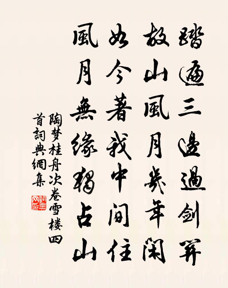 詩詞名句歷史字典書法欣賞書法字典國語詞典說文解字康熙字典古漢語字典標 題 作 者 詩 句 舟次卷雪樓四首作者:陶夢桂 朝代:宋代舟次卷雪樓四首原文踏遍三邊過劍關,故山風月幾年閒。如今著我中間住,風月無緣獨占山。詩詞問答問:舟次卷雪樓四首的作者是誰?答:陶夢桂問:舟次卷雪樓四首寫於哪個朝代?答:宋代陶夢桂舟次卷雪樓四首書法欣賞舟次卷雪樓四首書法作品詩詞推薦滿庭芳(萍)劉貴翁〔宋代〕宮鳥西飛,楊花北去,春風飄向伊誰。盈盈小小,輕薄不堪肥。天付風流到骨,消不盡、流落青池。誰知道,踏歌同年常簿吳次翁子萬之萬子子直卿將為分水學方回〔宋代〕一點書燈傳不絕,王侯卿相復何加。追惟大父同科第,喜見聞孫紹世家。奧頤蚤能探理窟,芳妍孰敢競詞華。勿方題東林寺夏竦〔宋代〕昔帝先賢跡未消,森沉台殿鎖礁嶢。新蓮照水香空在,舊輦生塵翠已凋。夾道古藤看翳日,過谿蒼蘚半侵橋。遠公即事陸游〔宋代〕紙潔晴窗暖,粳新午飯香。嗜眠為至樂,省事是奇方。孤蝶弄秋色,亂鴉啼夕陽。詩情隨處有,信筆自成章。中伏日省中當直楊億〔宋代〕火雲烘赫臨中伏,青鎖深嚴直右曹。吏散階庭時縱步,詩成几案獨揮毫。相烏影轉風微起,仙掌陰斜日漸高。何處和顏長官百詠負薪朱繼芳〔宋代〕破帽籠頭髮半華,樵歌一曲勝長嗟。雞鳴裹飯豈高去,日暮天寒未到家。送吳伯華李覯〔宋代〕典學淡無味,畏塗來幾程。舉家應好事,努力為求名。聲膳南陔遠,連環昨夢驚。壽觴何以薦,經術抵金籯。村晚張耒〔宋代〕深塢繁花麗,晴田細徑分。孤舟春水路,芳草夕陽村。暗雀投檐靜,昏鴉集樹喧。牛羊自歸晚,燈火掩衡門。精列曹操〔魏晉〕厥初生,造劃之陶物,莫不有終期。莫不有終期。聖賢不能免,何為懷此憂?願螭龍之駕,思想崑崙居。思想崑崙均州南川春日三首張舜民〔宋代〕水墨屏風遠近開,人煙隱映水環回。何人學得愚公術,故意移將灞滻來。龐居士大家團樂共說無生自豪感圖贊釋智愚〔宋代〕窮斯煎,餓廝吵。父子不同途,大家相脫卯。萬頃湘江洗不清,無生曲調何時了。和曹憲金華山韻上李雁湖吳泳〔宋代〕百卉冬具腓,喬松立霜雪。老枝自擎重,既晚逾秀髮。勁挺真在臣,回邪走妖月。金非百鍊剛,那不因翠屑。辭夏口崔尚書李頻〔唐代〕一飯仍難受,依仁況一年。終期身可報,不擬骨空鐫。城晚風高角,江春浪起船。同來棲止地,獨去塞鴻前。清夜怨李商隱〔唐代〕含淚坐春宵,聞君欲度遼。綠池荷葉嫩,紅砌杏花嬌。曙月當窗滿,征雲出塞遙。畫樓終日閉,清管為誰調。夏日七首張耒〔宋代〕兩架酴醾側覆檐,夏條交映漸多添。春歸花落君無恨,一架清陰恰滿簾。清心鏡 贈靈一子馬鈺〔元代〕何先生,聽仔細。未到蓬頭,且梳丫髻。亦未至、求乞殘餘,待悟來許你。得定慧,入初地。憑仗無染無著,無為思鄭州陳知默因感其化去不得一識面邵雍〔宋代〕美物須絕代,異人須不世。造化生得成,諒亦非容易。曠世耳可聞,同時目能視。陳子同時人,奈何聞諸耳。頌古十首釋普岩〔宋代〕等閒提起七斤衫,多少禪和著意參。盡向青州作窠窟,不知春色在江南。和金功叟二首吳芾〔宋代〕兩家誕日俱延客,長恨無緣笑語同。輒奉明尊聊介壽,願言百歲亦如翁。和周記室從駕曉發合璧宮李嶠〔唐代〕濯龍春苑曙,翠鳳曉旗舒。野色開煙後,山光澹月餘。風長笳煙咽,川迥騎行疏。珠履陪仙駕,金聲振屬車。名句推薦閉門覓句陳無己,對客揮毫秦少游。黃庭堅《病起荊江亭即事》 西園何限相思樹,辛苦梅花候海棠。元好問《鷓鴣天·候館燈昏雨送涼》 龍吟虎嘯一時發,萬籟百泉相與秋李頎《聽安萬善吹觱篥歌》 飢則附人, 飽便高颺房玄齡《晉書·載記·第二十三章》 天地生君子,君子理天地。荀子《荀子·王制》 楓樹夜猿愁自斷,女蘿山鬼語相邀李商隱《楚宮》 一朵江梅春帶雪。玉軟雲嬌,姑射肌膚潔。趙鼎《蝶戀花·一朵江梅春帶雪》 本富為上,末富次之,奸富最下。司馬遷《史記·七十列傳·貨殖列傳》 一春不識西湖面。翠羞紅倦。許棐《後庭花·一春不識西湖面》 我閉南樓看道書,幽簾清寂在仙居。李白《早秋單父南樓酬竇公衡》