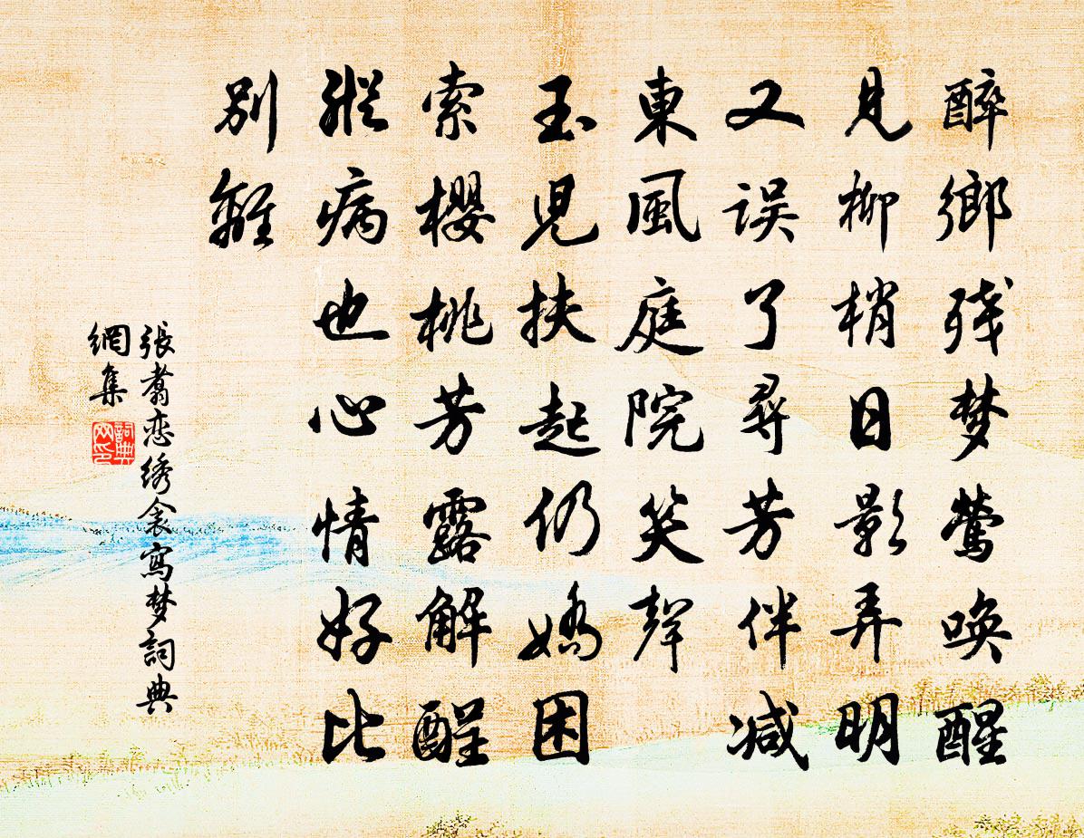 詩詞名句歷史字典書法欣賞書法字典國語詞典說文解字康熙字典古漢語字典標 題 作 者 詩 句 戀繡衾 寫夢作者:張翥 朝代:元代戀繡衾 寫夢原文醉鄉殘夢鶯喚醒。見柳梢、日影弄明。又誤了、尋芳伴,減東風、庭院笑聲。玉兒扶起仍嬌困,索櫻桃、芳露解酲。縱病也、心情好,比別離詩詞問答問:戀繡衾 寫夢的作者是誰?答:張翥問:戀繡衾 寫夢寫於哪個朝代?答:元代問:戀繡衾 寫夢是什麼體裁?答:詞張翥戀繡衾 寫夢書法欣賞戀繡衾 寫夢書法作品詩詞推薦禁菸節同子玉徐先生野步強至〔宋代〕系馬道邊樹,杖藜坡外岡。風來花自笑,露過草猶香。樂事論三月,吟懷騖八荒。時平那有感,雙淚肯浪浪。過八尺遇雨三首楊萬里〔宋代〕細雨無聲忽有聲,亂珠跳作萬銀釘。呼僮速買庉村酒,更煮鱸魚蒪菜羹。依韻和仲源獨夜吟梅堯臣〔宋代〕秋鴻聲澀秋弦苦,塗金博山煙夜吐。寂歷虛堂燈暈生,誰人共聽西窗雨。又畫嘗醋翁吳則禮〔宋代〕石先戲作忍酸相,未信從來嘗醋難。頭毛鬅鬙面白皺,老夫笑作嬰兒看。鄰峰艮上人1釋紹曇〔宋代〕四十餘年別故鄉,夢魂時復到藏王。春風九曲溪頭寺,桃花翻霞柳弄枘。一翦梅(菊酒)黎廷瑞〔宋代〕小小黃花爾許愁。楚事悠悠。晉事悠悠。荒蕪三徑渺中洲。開幾番秋。落幾番秋。不是孤芳萬古留。餐亦堪羞。采建炎丞相成國呂忠穆公退老堂莊綽〔宋代〕力辭富貴回天上,不事樓台起宅中。問道但懷重舍蓋,對優甯興獨延崇。精神宛似初平蔡,信突那應久在東。帝念題慧老芋岩陸游〔宋代〕煨芋當時話已新,如今拈出更精神。十年相國非吾願,半顆君當別付人。一笑陸游〔宋代〕半醉微吟不怕寒,江邊一笑覺天寬。莫愁艇子急沖雨,何遜梅花頻倚闌。萬事任從皮外去,百年聊作夢中觀。放翁浴罷李流謙〔宋代〕性懶如岙康,不沐已三歲。蟣虱擅封域,污垢為之地。譬之大諸侯,父死輒子繼。納污固雲久,用鉞豈得已。朝來紫溪莊舍讀癸丑壁間舊題轉眼忽十八年同游十劉學箕〔宋代〕屈指友於,祗今存幾。自仲之去,失此奇偉。言不騰情,心旌憤悱。哀哉蒼天,雨淚如洗。謝路憲送蟹曾幾〔宋代〕從來嘆賞內黃侯,風味尊前第一流。只合蹣跚赴湯鼎,不須辛苦上糟丘。夢中作得六句覺後足成張嵲〔宋代〕山中茅屋好,況復竹籬新。一逕往來客,萬山迎送人。葉殷渾欲染,冬暖卻疑春。近得幽棲地,時來岸角巾。洗兒蘇軾〔宋代〕人皆養子望聰明,我被聰明誤一生。惟願孩兒愚且魯,無災無難到公卿。寄莫萬安升之二首趙蕃〔宋代〕身在江西盡處山,江東家住幾時還。苦吟更與風光別,一夜並成雙鬢斑。首尾吟邵雍〔宋代〕堯夫非是愛吟詩,詩是堯夫默坐時。天意教閒須有謂,人心剛動似無知。煙輕柳葉眉閒皺,露重花枝淚靜垂。應恨太常樂章三十首其四迎俎奏豐安之曲楊億〔宋代〕麗碑割牲,以炰以烹。博碩肥腯,薦羞神明。祖考來格,享於克識。如聞謦欬,武燕以寧。臨江仙 送錢穆父蘇軾〔宋代〕一別都門三改火,天涯踏盡紅塵。依然一笑作春溫。無波真古井,有節是秋筠。惆悵孤帆連夜發,送行淡月微雲。慈恩寺東樓曹松〔唐代〕寺樓涼出竹,非與曲江賒。野火流穿苑,秦山疊入巴。風梢離眾葉,岸角積虛沙。此地鐘聲近,令人思未涯。八聲甘州(胡存齊除泉府大卿)趙文〔宋代〕記年時、快馬上青雲,而今袞衣還。問公歸何有,春風萬斛,散滿人間。聞道金鑾召對,風采動朝班。宰相從來有名句推薦新葉初冉冉,初蕊新霏霏。謝朓《詠落梅》 馬驕泥軟錦連乾,香袖半籠鞭。薛昭蘊《喜遷鶯·清明節》 宴爾新婚,以我御窮。佚名《谷風》 黃塵清水三山下,更變千年如走馬。李賀《夢天》 壽酒還嘗藥,晨餐不薦魚。錢起《送外甥懷素上人歸鄉侍奉》 繁霜儘是心頭血,灑向千峰秋葉丹。戚繼光《望闕台》 觀天下書未遍,不得妄下雌黃。顏之推《顏氏家訓·勉學篇》 一叢萱草,幾竿修竹,數葉芭蕉。石孝友《眼兒媚·愁雲淡淡雨瀟瀟》 若待上林花似錦,出門俱是看花人。楊巨源《城東早春》 桐葉晨飄蛩夜語。旅思秋光,黯黯長安路。陸游《蝶戀花·桐葉晨飄蛩夜語》