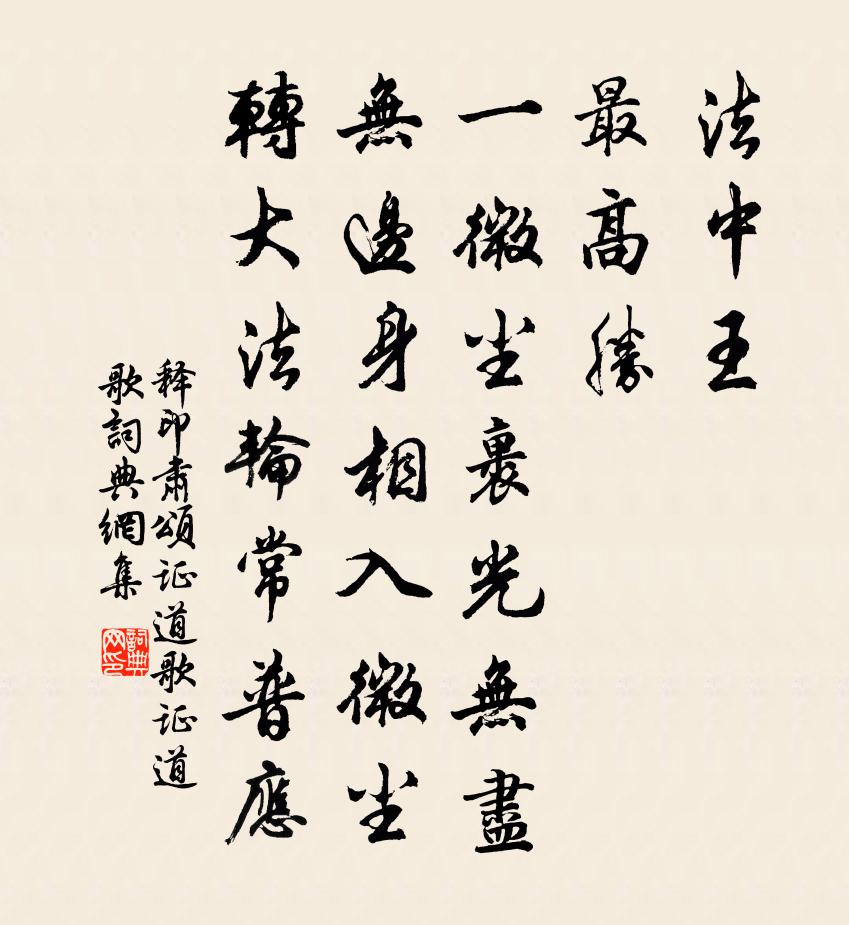 詩詞名句歷史字典書法欣賞書法字典國語詞典說文解字康熙字典古漢語字典標 題 作 者 詩 句 頌證道歌證道歌作者:釋印肅 朝代:宋代頌證道歌證道歌原文法中王,最高勝,一微塵裹光無盡。無邊身相入微塵,轉大1*1法1|1輪常普應。詩詞問答問:頌證道歌證道歌的作者是誰?答:釋印肅問:頌證道歌證道歌寫於哪個朝代?答:宋代釋印肅頌證道歌證道歌書法欣賞頌證道歌證道歌書法作品詩詞推薦昌年宮之作豆盧復〔唐代〕但有離宮處,君王每不居。旗門芳草合,輦路小槐疏。殿閉山煙滿,窗凝野靄虛。豐年多望幸,春色待鑾輿。囚中記貧華岳〔宋代〕英雄不遇不憂貧,獄吏從教喚不應。煮飯只燒沽酒鑵,讀書權借守囚燈。堪嗟世事危如卵,無怪人情冷似冰。勿謂春詠雍陶〔唐代〕風惱花枝不耐頻,等閒飛落易愁人。殷勤最是章台柳,一樹千條管帶春。憶楊梅蘇泂〔宋代〕夏祭先供項里祠,鮮香未晏已聞思。昨宵夢裡依稀見,滿樹薰風重壓枝。偈頌一百二十三首釋祖欽〔宋代〕栽田且博飯,隨分煮藜莧。一任少叢林,佛法不怕爛。中秋和姜主簿韻程公許〔宋代〕三更露氣滿秋堂,秘訣新傳食月芒。安得南樓三百尺,暫容老子據胡床。自邊江赴守鄱陽黃原道中作李彌遜〔宋代〕海南三年一夢成,北來重聽偃溪聲。凝雲帶雨留愁住,茂樹隨山送客行。秔稻沿崖畦上下,茅茨枕谷路縱橫。莫從登樓文天祥〔宋代〕茫茫地老與天荒,如此男兒鐵石腸。七十日來浮海道,三千里外望江鄉。高鴻尚覺心期闊,蹇馬何堪腳跡長。獨自渾淪庵慶成張繼先〔宋代〕高齋忽已慶成功,赤石蒼崖入眼中。貞節由來拘世業,稚川隨處是家風。紅金櫃隱書尤秘,碧玉壺清酒不空。昆閬送陝西運使陸郎中晁說之〔宋代〕二十年來關內客,眼明太華高太白。今日前驅使者旌,雞舌香余新日月。春初胡騎逼王城,公在城頭佐天策。將茲五郊樂章。舒和魏徵〔唐代〕璿儀氣爽驚緹籥,玉呂灰飛含素商。鳴鞞奏管芳羞薦,會舞安歌葆眊揚。淮上鄭獬〔宋代〕桐柏山中草木靈,淮源潏潏繞山鳴。誰人鑿出渾河水,污卻長波萬丈清。偈頌二百零五首釋正覺〔宋代〕春雨洗園林,春風動簾箔。百城人已歸,彈指開樓閣。入門俱是佛家風,帝網光明相映奪。寧宗朝享三十五首真宗〔宋代〕聖有謨訓,詒謀燕翼。奉天酌祖,萬世維則。維皇孝熙,乾乾夕陽。禮既式旋,惟福之錫。哀傳馬韓維〔宋代〕喧呼國西門,驛使通萬里。十亭傳一馬,日夜不得止。枯腸嗛芻豆,瘦骨擊轡箠。力盡求未息,忽已仆泥滓。死者次韻季承聞田歌趙蕃〔宋代〕布穀收聲老盡秧,直緣避潦有今忙。歌呼嘹亮相讙雜,肯愧悠悠道中商。答唐州鄭郎韓維〔宋代〕先帝宮藩昔曳裾,便將狂直許傾舒。制分內外常更掌,省列東西亦預除。敢以功名為已任,自知謀議與時疏。歸來驀山溪(游鑑湖)曹冠〔宋代〕鑑湖千頃,四序風光好。撥棹皺漣漪,極目處、青山繚繞。微茫煙靄,鷗鷺點菰蒲,雲帆過,釣舟橫,俱被勞生擾風起葛立方〔宋代〕炎蒸困鉗釱,虎嘯漏天機。樹杪忽垂髻,榴邊今污衣。草鳴溪水立,帆飽客船飛。更設琉璃簟,瓜茶遲落暉。送程給事知越州黃默〔宋代〕會稽山水古來雄,內史新除捧招東。何藉扁舟追范蠡,更將一釣問任公。久諳偃自藩垣樂,未試調和鼎鼐功。日食名句推薦不務天時,則財不生;不務地利,則倉廩不盈管仲《管子·牧民》 千里搭長棚,沒有個不散的筵席曹雪芹《紅樓夢·第二十六回》 榆柳蕭疏樓閣閒,月明直見嵩山雪。孟郊《洛橋晚望》 催促年光,舊來流水知何處。廖世美《燭影搖紅·題安陸浮雲樓》 共說春來春去事,多時。一點愁心入翠眉。晏幾道《南鄉子·花落未須悲》 養不教,父之過。教不嚴,師之惰。王應麟《三字經·全文》 清明又近也,卻天涯為客。曹組《憶少年·年時酒伴》 是節東籬菊,紛披為誰秀。杜甫《九日寄岑參》 親朋無一字,老病有孤舟。杜甫《登岳陽樓》 衣祿原有定數,必節儉簡省,乃可久延。王永彬《圍爐夜話·第六三則》
