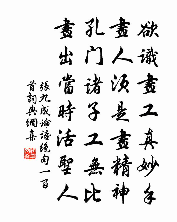 詩詞名句歷史字典書法欣賞書法字典國語詞典說文解字康熙字典古漢語字典標 題 作 者 詩 句 論語絕句一百首作者:張九成 朝代:宋代論語絕句一百首原文欲識畫工真妙手,畫人須是畫精神。孔門諸子工無比,畫出當時活聖人。詩詞問答問:論語絕句一百首的作者是誰?答:張九成問:論語絕句一百首寫於哪個朝代?答:宋代張九成論語絕句一百首書法欣賞論語絕句一百首書法作品詩詞推薦【仙呂】賞花時_臥枕著床染佚名〔元代〕臥枕著床染病疾,夢斷魂勞怕飲食。不索請名醫,沉吟了半日,這證候兒敢蹺蹊。 【麼】參的寒來恰禁起,忽說虎軒夜坐范成大〔宋代〕白雲深處臥痴頑,掛起東窗水月寬。但得好詩生眼底,何須寶剎現毫端。一身莫作官身想,萬境都如夢境看。蟹舍寄別秦觀少游賀鑄〔宋代〕沔陽湖上小留連,疑是前時李謫仙。流向夜郎才半道,徑還江夏樂當年。個儂生以才為累,阿堵官於老有緣。待得挽趙卿無垢二首劉克莊〔宋代〕血衣尚在久乘邊,入手功名費十年。圯上一編非鬼授,晉陽三版以人全。共祠石室思方切,不畫雲台命使然。玉樹和鄭少師相公題慈恩寺禪院楊巨源〔唐代〕舊寺長桐孫,朝天是聖恩。謝公詩更老,蕭傅道方尊。白法知深得,蒼生要重論。若為將此望,心地向空門。挽范安仲死寇陳杰〔宋代〕十載紛紛死亂離,如君清苦獨堪悲。醫余書眼猶評史,瘦盡吟肩正琢詩。李涉空喔綠林夜,阿先竟厄白波時。還勝賜知貢舉錢惟演宋真宗〔宋代〕寅奉昌圖紹慶基,選掄多士葉前規。鄉閭薦拔期無濫,草澤搜羅詎有遺。德舉況逢全盛日,計偕鹹造廣場時。春官九日食糕宋祁〔宋代〕飈館輕霜拂曙袍,糗餈花飲斗分曹。劉郎不敢題糕字,虛負詩家一代豪。禪人畫師像請贊釋如珙〔宋代〕尺璧千丈石,寸金萬里沙。揀辯俱不得,達磨返流沙。相和歌辭苦寒行僧齊己〔唐代〕冰峰撐空寒矗矗,雲凝水凍埋海陸。殺物之性,傷人之欲,既不能斷絕蒺藜荊棘之根株,又不能展鳳凰麒麟之拳跔無相寺道中葉適〔宋代〕傍水人家柳十餘,靠山亭子菊千株。竹雞露啄堪幽伴,蘆菔風乾待歲除。與仆抱樵趨絕澗,隨僧尋磬禮精廬。不知寄友人王晉老滕岑〔宋代〕送君行日雪揚飛,曾幾何時畫箑揮。自別空驚鬚髮變,得書聊證夢魂非。紫樞白簡家聲在,黃卷青燈生事微。悟得中元夜百花洲作范仲淹〔宋代〕南陽太守清狂發,未到中秋先賞月。百花洲里夜忘歸,綠梧無聲露光滑。天學碧海吐明珠,寒輝射空星斗疏。西樓項羽廟李山甫〔唐代〕為虜為王盡偶然,有何羞見漢江船。停分天下猶嫌少,可要行人贈紙錢。朝飢食齏面甚美戲作陸游〔宋代〕一杯齏餺飥,手自芼油蔥。天上蘇陀供,懸知未易同。余邦英惠小山新芽作小詩三首以謝陸游〔宋代〕平時共語不成些,痴坐空雕藜莧腸。誰遣春風入牙頰,詩成忽帶小山香。寄永新元老元書元已辭廣孝復歸禾山白雲矣王洋〔宋代〕已尚清高久,須教去住艱。強分雲出岫,終放鶴歸山。煙帶重風潤,衣侵霧雨斑。輕身如有藥,猶恐費躋攀。病起二首高斯得〔宋代〕老去增書癖,還遭病兒磨。杜詩能止虐,周易解祛魔。不得青編伴,惟應白日過。坐多膚欲痹,時起眺清波。送區弘南歸韓愈〔唐代〕穆昔南征軍不歸,蟲沙猿鶴伏以飛。洶洶洞庭莽翠微,九疑鑱天荒是非。野有象犀水貝璣,分散百寶人士稀。我遷花光十梅正偏自在釋師範〔宋代〕花合花開有正偏,不完全處卻完全。要知根蔕從何得,多見生理洞水邊。名句推薦秋草六朝寒,花雨空壇。更無人處一憑闌。朱彝尊《賣花聲·雨花台》 悲懷感物來,泣涕應情隕。潘安《悼亡詩三首》 忽憶故人今總老。貪夢好。茫然忘了邯鄲道。王安石《漁家傲·平岸小橋千嶂抱》 川澤納污,所以成其深;山嶽藏疾,所以就其大。魏徵《隋書·列傳·卷十一》 群山萬壑赴荊門,生長明妃尚有村。杜甫《詠懷古蹟五首·其三》 梳洗罷,獨倚望江樓。溫庭筠《望江南·梳洗罷》 無田似我猶欣舞,何況田間望歲心。曾幾《蘇秀道中》 海記憶體知己,天涯若比鄰。王勃《送杜少府之任蜀州 / 送杜少府之任蜀川》 行人莫便消魂去,漢渚星橋尚有期。晏幾道《鷓鴣天·梅蕊新妝桂葉眉》 柔情似水,佳期如夢,忍顧鵲橋歸路。秦觀《鵲橋仙·纖雲弄巧》