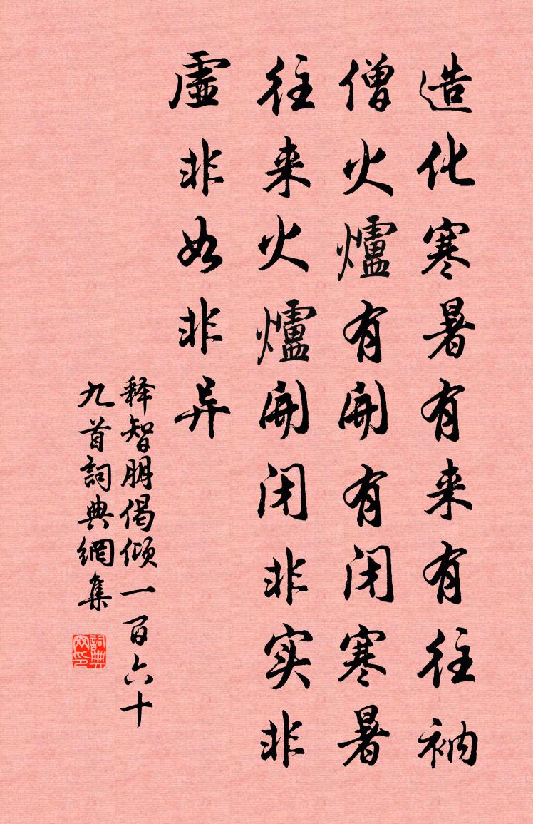 詩詞名句歷史字典書法欣賞書法字典國語詞典說文解字康熙字典古漢語字典標 題 作 者 詩 句 偈傾一百六十九首作者:釋智朋 朝代:宋代偈傾一百六十九首原文造化寒暑,有來有往,衲僧火爐,有開有閉。寒暑往來,火爐開閉。非實非虛,非如非異。詩詞問答問:偈傾一百六十九首的作者是誰?答:釋智朋問:偈傾一百六十九首寫於哪個朝代?答:宋代釋智朋偈傾一百六十九首書法欣賞偈傾一百六十九首書法作品詩詞推薦渾淪庵成悠然子親慶因以何字為韻共酌聯句石元規〔宋代〕作室鬼觀靈境,功成事若何。琴鬼消日月,耕釣老煙蘿。為羨雲蹤遠,時將鬼共過。東岩開玉洞,西澗瀉銀河。整挽羅慶元劉克莊〔宋代〕昔與先君子,同時宰建溪。晚看康樂鳳,亦割武城雞。幼嗣萊妻立,新阡樂令遺。傷心埋玉早,□□遠難攜。讀唐中興頌易祓〔宋代〕唐家基業重於山,甯許胡雛據九關。當日人心旋□堵,異時世變卻循環。壤分旄鉞誰能制,政出貂璫不復還。千古青山懷古胡楚材〔宋代〕樵獵識冠裳,何言志四方。離秦風日冷,過楚薜蘿長。夢野違徵詔,時衰枉薦章。故山隈且僻,應種秫為糧。憶舊遊(新朋故侶,詩酒遲留,吳山蒼蒼,渺渺兮余懷也。寄沈堯道諸公)張炎〔宋代〕記開簾過酒,隔水懸燈,款語梅邊。未了清遊興,又飄然獨去,何處山川。淡風暗收榆莢,吹下沈郎錢。嘆客里光晴歸陳著〔宋代〕兒造弄晴曦,安排老我歸。江收閒水退,山戴斷雲飛。晚色明官路,清寒攪客衣。行行到嵩曲,猶可及斜暉。山行即事二首黃公度〔宋代〕落石奔沙岸,頹雲擁樹根。牛羊千古道,雞犬數家村。風遞鄰舂急,春歸農事繁。生涯隨處樂,翁嫗話柴門。挽林新恩君用劉克莊〔宋代〕汗血早曾空北野,蒼顏晚始對南廊。風雲志懶功名左,月旦評佳意味長。玉鏡相從歸吉兆,錦衣不待拜高堂。吾銘雁和彥山韻趙時韶〔宋代〕叫月聲聲到枕兒,稻粱雖飽豈能肥。夜深且傍瀟湘宿,明日晴空萬里飛。柳李靜獨〔宋代〕顏色鮮明能幾時,未辭黃葉已辭枝。都緣愛管閒離別,多恨多愁故早衰。出遊陸游〔宋代〕漁村酒市本無期,小蹇扁舟信所之。丹葉滿林霜落後,紫萍黏塊水枯時。山林閒寂歸雖早,齒髮衰殘病已遲,努力詠梅周南〔宋代〕此花高是少人知,步到喬林始見之。老我怕風並怕雨,一年過了又無詩。鹽城阻冰雪贈陳德美三首陳造〔宋代〕身口真相累,風霜得備嘗。即今歌匪兕,未憗反屠羊。辟謗規閒口,因衰再覆觴。不知詩酒外,何計逭悲涼。荼蘼方岳〔宋代〕山徑陰陰雨未乾,春風已暖卻成寒。不緣天氣渾無準,要護荼蘼繼牡丹。臨江仙(送袁黎州楠)魏了翁〔宋代〕曉色曨昒雲日澹,綽開坦坦長途。西寧太守問程初。梅梢迎候騎,柳樹困平蕪。九折邛峽渾可事,不妨叱馭先驅。春日雜興十首秦觀〔宋代〕桃李用事辰,鮮明奪雲綺。繁華一朝去,默默慚杞梓。時徂鷹化鳩,地遷橘為枳。獨有羨門生,後天猶不死。象弈各有等級四絕品四人高下文天祥〔宋代〕坐踞河南百戰雄,少年飛槊健如龍。世間只畏兩人在,上有高公下慕容。聲聲慢(宏庵宴席,客有持桐子侑俎者,自雲其姬親剝之)吳文英〔宋代〕寒筲驚墜,香豆初收,銀床一夜霜深。亂瀉明珠,金盤來薦清斟。綠窗細剝檀皺,料水晶、微損春簪。風韻處,惹鐵如意吟邵雍〔宋代〕此物鐵為之,何嘗肯妄持。長隨大{上敝下瓦}子,永伴小車兒。擊碎珊瑚處,敲殘牙齒時。誰能學此輩,才始人石門洞樓鑰〔宋代〕扁舟百里蓮城回,青山中斷立兩崖。清都虎豹隱不見,但見閶闔排雲開。峰迴失喜大飛瀑,聲震萬壑驚春雷。掀髯名句推薦今夜鄜州月,閨中只獨看。杜甫《月夜》 河西幕中多故人,故人別來三五春。岑參《涼州館中與諸判官夜集》 讀書法,有三到。心眼口,信皆要。李毓秀《弟子規·餘力學文》 魚澤灘頭嘶獵馬,省嵬城畔看黃河。石茂華《九月九日登長城關》 雪消門外千山綠,花發江邊二月晴。歐陽修《春日西湖寄謝法曹歌》 搖盪春風媚春日,念爾零落逐風飈,徒有霜華無霜質。鮑照《梅花落·中庭多雜樹》 我醉君復樂,陶然共忘機。李白《下終南山過斛斯山人宿置酒》 蕭蕭落木不勝秋,莫回首、斜陽下。納蘭性德《一絡索·過盡遙山如畫》 莫愁前路無知己,天下誰人不識君。高適《別董大二首》 豪傑向簡淡中求,神仙從忠孝上起。陳繼儒《小窗幽記·集醒篇》
