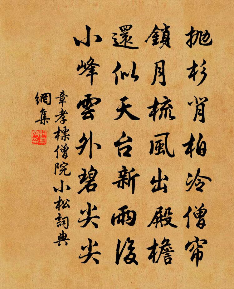 詩詞名句歷史字典書法欣賞書法字典國語詞典說文解字康熙字典古漢語字典標 題 作 者 詩 句 僧院小松作者:章孝標 朝代:唐代僧院小松原文拋杉背柏冷僧簾,鎖月梳風出殿檐。還似天台新雨後,小峰雲外碧尖尖。詩詞問答問:僧院小松的作者是誰?答:章孝標問:僧院小松寫於哪個朝代?答:唐代問:僧院小松是什麼體裁?答:七絕章孝標僧院小松書法欣賞僧院小松書法作品注釋全唐詩:卷506-62詩詞推薦次韻和王鞏六首蘇軾〔宋代〕鄰里有異趣,何妨傾蓋新。殊方君莫厭,數面自成親。默坐無餘事,回光照此身。他年赤墀下,玉立看垂紳。春秋戰國門田子奇周曇〔唐代〕少年為吏慮非循,一騎奔追委使臣。使者不追何所對,車中緣見白頭人。何元立示九日詩臥病累日乃能次韻陸游〔宋代〕何郎戲寫菊花秋,落筆縱橫豈易酬。豪士乃能為老伴,寓公那得稱遨頭。早衰不耐危亭冷,獨臥空驚畫角愁。病起立春內中帖子詞溫成皇后閣王珪〔唐代〕遙聞碧海有三山,雲鎖瓊樓日月間。花下玉顏常不老,也應春色勝人間。生意堂三首董嗣杲〔宋代〕絮花挼雪小橋寒,渾是蘇堤柳下看。愁去不知春袖濕,晚風吹雨入闌乾。初春書懷陸游〔宋代〕六十餘年慕古人,即今方近葛天民。見人各是元非恕,遇事皆安豈怨貧。小圃鉏耰聊過日,扁舟煙雨尚關身。出門次張漢公言懷鄭俠〔宋代〕人間滾滾竟何營,只為蠅頭利與名。千里癉鄉吾逐客,一簞窮巷子書生。文章相誤終須別,寵辱無關自不驚。贏得偈頌一百四十一首釋師範〔宋代〕少林訊息絕,大地一團鐵。愁殺寒山子,無言倚寥泬,悲風流水聲嗚咽。簡琴窗雲屋竹軒諸友文天祥〔宋代〕世情千萬變,險甚劍頭炊。嗜傳姑成癖,登山且作痴。煙霞非疾痼,泉石自心馳。獨喜精神健,山中剩有詩。對廳樂語姚勉〔宋代〕洞房華褥繡芙蓉,惹得天香馥正濃。鳳觜續弦新跨鳳,龍頭有婿又乘龍。人間二月春光好,魁下三台瑞彩重。酬勸臥病感春寄魯望皮日休〔唐代〕烏皮几上困騰騰,玉柄清羸愧不能。昨夜眠時稀似鶴,今朝餐數減於僧。藥銷美祿應夭折,醫過芳辰定鬼憎。任是董行成佚名〔宋代〕唐懷州河內縣董行成能策賊。有一人從河陽長店,盜行人驢一頭並皮袋。天欲曉,至懷州。行成至街中,見之,叱廣陵古冢石刻佚名〔唐代〕日為箭兮月為弓,四時躬人兮無窮。但得天將明月死,不覺人隨流水空。山川秀兮碧穹窿,崇夫人墓兮直其中。猿書王十月述懷詩後劉鎮〔宋代〕山北山南春雨足,漠漠柔桑秀如沃。儂家荊婦幾時歸,西疇獨自驅黃犢。幸武功慶善宮李世民〔唐代〕壽丘惟舊跡,酆邑乃前基。粵予承累聖,懸弧亦在茲。弱齡逢運改,提劍郁匡時。指麾八荒定,懷柔萬國夷。梯山夜讀邵堯夫詩戲效其體再賦蠟梅虞儔〔宋代〕紛紛蜂子競生涯,每到花時輒放衙。懸室盡將花作蠟,何人翻以蠟為花。姑從凡卉論先後,若比江海有等差。弄假哭陳丞相鄭鉞〔宋代〕大廈將傾一木支,登陴慟哭志難移。螳螂怒臂當車日,精衛銜沙塞海時。夢裡忽驚元主朔,軍中猶卓宋家旗。孤臣題忠州龍興寺所居院壁杜甫〔唐代〕忠州三峽內,井邑聚雲根。小市常爭米,孤城早閉門。空看過客淚,莫覓主人恩。淹泊仍愁虎,深居賴獨園。夜酌陸游〔宋代〕遙夜澆愁賴麴生,燈前忽見臥長瓶。比紅有句狂猶在,染白無方老已成。園徑露螢黏濕草,塔檐風鐸亂疏更。悲秋次張丞送菊韻二首陳造〔宋代〕寒花彭澤門闌舊,好句柯山伯仲間。貧負清樽只三益,詩人錯笑庾郎慳。名句推薦空勞縴手,解佩贈情人。牛希濟《臨江仙·柳帶搖風漢水濱》 眾芳搖落獨暄妍,占盡風情向小園。林逋《山園小梅二首》 此已被私慾隔斷,不是知行的本體了。王陽明《傳習錄·卷上·徐愛錄》 四月南風大麥黃,棗花未落桐葉長。李頎《送陳章甫》 箭徑酸風射眼,膩水染花腥。吳文英《八聲甘州·靈岩陪庾幕諸公游》 躬自厚而薄責於人,則遠怨矣。孔子弟子《論語·衛靈公篇》 且就洞庭賒月色,將船買酒白雲邊。李白《游洞庭湖五首·其二》 此時卻羨閒人醉,五馬無由入酒家。白居易《早冬》 半畝方塘一鑒開,天光雲影共徘徊。朱熹《活水亭觀書有感二首·其一》 牝雞無晨;牝雞之晨,惟家之索。佚名《尚書·周書·牧誓》