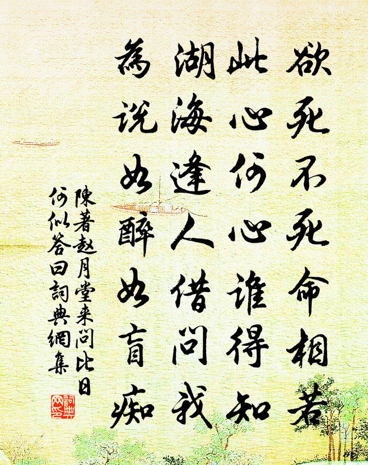 詩詞名句歷史字典書法欣賞書法字典國語詞典說文解字康熙字典古漢語字典標 題 作 者 詩 句 趙月堂來問比日何似答曰作者:陳著 朝代:宋代趙月堂來問比日何似答曰原文欲死不死命相若,此心何心誰得知。湖海逢人借問我,為說如醉如盲痴。詩詞問答問:趙月堂來問比日何似答曰的作者是誰?答:陳著問:趙月堂來問比日何似答曰寫於哪個朝代?答:宋代陳著趙月堂來問比日何似答曰書法欣賞趙月堂來問比日何似答曰書法作品詩詞推薦題荊浩畫青山白雲卷薛琦〔宋代〕渺渺山上山,隱隱樹邊樹。雞犬不聞聲,居人在何處。扁舟載酒來相尋,古木蒼苔一徑深。白雲不飛青山舞,誰悟酬劉員外見寄嚴維〔唐代〕蘇耽佐郡時,近出白雲司。藥補清羸疾,窗吟絕妙詞。柳塘春水慢,花塢夕陽遲。欲識懷君意,明朝訪楫師。與社友定花朝之約胡仲弓〔宋代〕花朝曾有約,來此定詩盟。隱几江湖夢,閉門風雨情。身名千載共,心事一般清。且盡吟樽樂,徂徠不用賡。冬末郡學感懷和韻強至〔宋代〕我向榮塗倒足行,折腰尚可代深耕。嗟君二紀差高第,猶爾三冬伴後生。壯志幾多成墜鵠,明年四十趁啼鶯。金章失調名王詵〔宋代〕 * 絲、對纏玉腕。無夢令 贈京兆權先生馬鈺〔元代〕妻妾兒孫一假。金玉珍珠二假。三假是榮華,幻化色身四假。知假。知假。說破浮名五假。峨眉楊徽之〔唐代〕嘉州山水地,二蜀最為美。翠嶺疊峨眉,長嶺疊峨眉,長瀾涌錦水。寄五峰諫長老唐詢〔宋代〕禪客居山患不深,五峰幽絕杳難尋。門前流水朝還暮,堂下閒雲古復今。月色有時依宴坐,秋聲隨處伴謳吟。期師春寒陳與義〔宋代〕二月巴陵日日風,春寒未了怯園公。海棠不惜胭脂色,獨立濛濛細雨中。古離別僧貫休〔唐代〕離恨如旨酒,古今飲皆醉。只恐長江水,儘是兒女淚。伊余非此輩,送人空把臂。他日再相逢,清風動天地。已亥雜詩 118龔自珍〔清代〕麟趾褭蹄式可尋,何須番舶獻其琛。漢家平淮書難續,且仿齊梁鑄餅金。青玉案(和賀方回韻)蔡伸〔宋代〕參差弱柳長堤路。柳外征帆去。皓齒明眸嬌態度。回頭一夢,斷腸千里,不到相逢地。來時約略春將暮。幽恨空餘送賀蘭廣赴選崔峒〔唐代〕而今用武爾攻文,流輩乾時獨臥雲。白髮青袍趨會府,定應衡鏡卻慚君。紹興以後蜡祭四十二首佚名〔宋代〕維後之功,配天其大。祀而稷之,萬世如在。黃冠野服,駿奔皇皇。自古有年,神其降康。七言滑語聯句李益〔唐代〕雨里下山蹋榆皮,[顏真卿]莓苔石橋步難移,[皎然]蕪荑醬醋吃煮葵,[劉全白]縫靴蠟線油塗錐,[李崿]寄題王國華環秀樓二首楊萬里〔宋代〕近山遠岫不知重,暖翠晴嵐只滿空。珍重主人將好手,盡驅秀色入樓中。偈公六十五首釋鹹傑〔宋代〕生鐵鑄牛頭,牽犁還拽杷。智者笑忻忻,愚人驚怪差。古往今來幾百年,更向鬼門重貼卦。喜譚德稱歸陸游〔宋代〕少鄙章句學,所慕在經世,諸公薦文章,頗恨非素志。一朝落江湖,爛熳得自恣,討論極王霸,事業窺莘渭,孔明生日劉應時〔宋代〕屏跡衡門下,衰遲愧始生。兒曹於此夕,杯酒致難情。來日苦無幾,餘生累慚輕。樂親惟養志,外物本非榮。學進士作大方無隅二首劉克莊〔宋代〕舉世遊方內,規規臆見拘。惟其全體大,所以四隅無。矩絜豈能盡,軌同安有殊。其崖誰見者,何岸可登乎。固異名句推薦憑空怒浪兼天涌,不盡六朝聲。歸莊《錦堂春·半壁橫江矗起》 傷心枕上三更雨,點滴霖霪。李清照《添字醜奴兒·窗前誰種芭蕉樹》 晴風初破凍,柳眼梅腮,已覺春心動。李清照《蝶戀花·暖雨晴風初破凍》 郵亭無人處,聽檐聲不斷,困眠初熟。周邦彥《大酺·越調春雨》 濛柳添絲密,含吹織空羅。李世民《詠雨》 諂諛在側,善議障塞,則國危矣。墨子《墨子·01章 親士》 人不通今古,馬牛如襟裾。佚名《增廣賢文·上集》 曉月暫飛高樹里,秋河隔在數峰西韓翃《宿石邑山中》 去年人在鳳凰池,銀燭夜彈絲薩都剌《小闌乾·去年人在鳳凰池》 記年時、舊宿淒涼,暮煙秋雨野橋寒。吳文英《霜花腴·重陽前一日泛石湖》