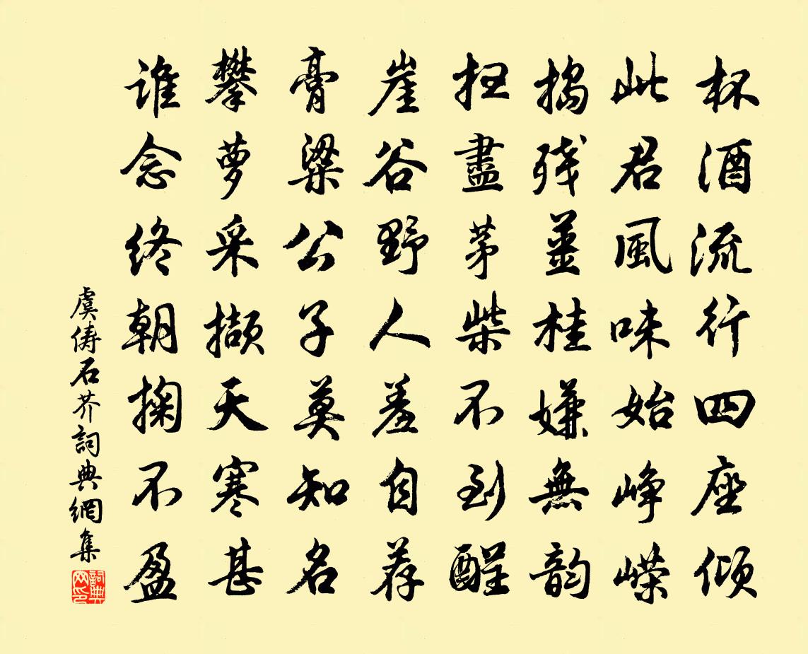詩詞名句歷史字典書法欣賞書法字典國語詞典說文解字康熙字典古漢語字典標 題 作 者 詩 句 石芥作者:虞儔 朝代:宋代石芥原文杯酒流行四座傾,此君風味始崢嶸。搗殘薑桂嫌無韻,掃盡茅柴不到酲。崖谷野人羞自薦,膏粱公子莫知名。攀蘿採擷天寒甚,誰念終朝掬不盈。詩詞問答問:石芥的作者是誰?答:虞儔問:石芥寫於哪個朝代?答:宋代虞儔石芥書法欣賞石芥書法作品詩詞推薦勸農六首張嵲〔宋代〕春泥滑滑不須愁,勉事深耕定有秋。沓障東南知更好,歸來頻上郡城樓。臨江仙葛勝仲〔宋代〕千古烏程新釀美,玉觴風過粼粼。歌聲未辦起梁塵。九天持斧客,來作繡衣人。夙有辭華驚乙覽,傳聞獻頌東巡。春日喜逢鄉人劉松李鹹用〔唐代〕故人不見五春風,異地相逢岳影中。舊業久拋耕釣侶,新聞多說戰爭功。生民有恨將誰訴,花木無情只自紅。莫把夢遊故山高登〔宋代〕風際氅披鶴,雲根杖策鳩。幽棲知好在,歸夢故難留。山放數峰出,泉分一派流。把茅何日辦,縛屋護松楸。俞舜俞作墨梅八軸皆取古人詩句請余賦之沈繼祖〔宋代〕天生萬物俱森羅,詩人於梅詩獨多。不言成蹊桃與李,何敢當此不類歌。由來畫中有新詩,俞君造次以筆追。渾然晚飲馮秀才宅李新〔宋代〕遙天孤雁泣離群,疊疊秋山更莫雲。孤雁足添遷客恨,相逢賴有小馮君。西齋秋感二十首方回〔宋代〕靈運永嘉日,玄暉宣城時。池草既清唱,窗岫亦妍辭。郡勝山水媚,心賞良足怡。廟廊有顏沈,味合深己知。桐瀨水龍吟蘇軾〔宋代〕小溝東接長江,柳堤葦岸連雲際。煙村瀟灑,人閒一哄,漁樵早市。永晝端居,寸陰虛度,了成何事。但絲蓴玉藕道中逢故人唐彥謙〔唐代〕蘭陵市上忽相逢,敘別殷勤興倍濃。良會若同雞黍約,暫時不放酒杯空。愁牽白髮三千丈,路入青山幾萬重。行色憶越州晏殊〔宋代〕湖山杳渺不可狀,登覽幽求無所遺。高僧伴吟足清覽,見盡白蓮開落時。送蔡挺代父之蜀范仲淹〔宋代〕朔風豈不寒,蜀道豈不難。之子代親行,萬里心自安。劍閣雪猶明,錦江春未闌。到日必詩戰,重登李杜壇。贈別成明府赴劍南韓翃〔唐代〕朝為三室印,晚為三蜀人。遙知下車日,正及巴山春。縣道橘花里,驛流江水濱。公門輒無事,賞地能相親。解衣訴衷情趙長卿〔宋代〕花前月下曾鴛鴦。分散兩情傷。臨行祝付真意,臂間皓齒留香。還更毒,又何妨。盡成瘡。瘡兒見在,痕兒見在,陳夫人輓詞樓鑰〔宋代〕作配知名士,周旋內則篇。宜家兼四德,訓子見三遷。就養榮方逮,歸寧病忽纏。慶源流未已,佳兆得牛眠。步步高佚名〔宋代〕四更里,玄圃清風細。來往無凝滯。解垢衣。心月高懸照雲溪。上天梯。獨折蟾宮桂。三界十方惟獨步。認得曹溪摸魚兒 樓桑呼漢昭烈廟元好問〔金代〕問樓桑、故居無處。青林留在祠宇。荒壇社散鳥聲□,寂寞漢家簫鼓。春已暮。君不見、錦城花重驚風雨。劉郎良詠柳王十朋〔宋代〕東君於此最鍾情,妝點村村入畫屏。向我無言眉自展,與人非故眼猶青。縈縈別恨絲千尺,斷送春光絮一亭。葉底禽言十詠不如歸去姚勉〔宋代〕翠煙深樾江村雨,蜀魄催春動歸去。勸春春去勸未休,客子傷春慘心緒。只今蜀土錦城荒,蜀客望西悲故鄉。故鄉菩薩蠻·芭蕉張鎡〔宋代〕風流不把花為主。多情管定煙和雨。瀟灑綠衣長。滿身無限涼。文箋舒捲處。似索題詩句。莫憑小闌乾。月明生夜秋夜宴集陳翃郎中圃亭美校書郎張正元歸鄉盧綸〔唐代〕泉清蘭菊稠,紅果落城溝。保慶台榭古,感時琴瑟秋。碩儒歡頗至,名士禮能周。為謝邑中少,無驚池上鷗。名句推薦大仇必去,小人勿輕,禍不可伏。來俊臣《羅織經·固榮卷第六》 相思不管年華,喚酒吳娃市。吳文英《荔枝香近·送人游南徐》 君子以鐘鼓道志,以琴瑟樂心。荀子《荀子·樂論》 無由持一碗,寄與愛茶人。白居易《山泉煎茶有懷》 明朝且做莫思量,如何過得今宵去。周紫芝《踏莎行·情似遊絲》 山頭堆白雪,風裡卷黃沙。楊守禮《三月巡邊曉發夏城》 多情卻被無情惱。蘇軾《蝶戀花·春景》 一種相思,兩處閒愁。李清照《一剪梅·紅藕香殘玉簟秋》 花落花開自有時,總賴東君主。嚴蕊《卜運算元·不是愛風塵》 夜寒茅店不成眠,殘月照吟鞭。吳激《訴衷情·夜寒茅店不成眠》