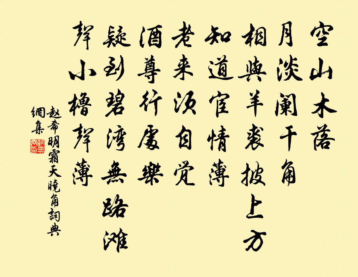 詩詞名句歷史字典書法欣賞書法字典國語詞典說文解字康熙字典古漢語字典標 題 作 者 詩 句 霜天曉角作者:趙希明 朝代:宋代霜天曉角原文空山木落。月淡闌乾角。相與羊裘披上,方知道、宦情薄。老來須自覺。酒尊行處樂。疑到碧灣無路,灘聲小、櫓聲薄。詩詞問答問:霜天曉角的作者是誰?答:趙希明問:霜天曉角寫於哪個朝代?答:宋代問:霜天曉角是什麼體裁?答:詞趙希明霜天曉角書法欣賞霜天曉角書法作品詩詞推薦效演雅方岳〔宋代〕山溪斗折更蛇行,逗密穿幽見物情。蜜為地花糧道絕,蚊知有雨陣圖成。飲風吸露蟬屍解,聳壑凌霄鶴骨輕。鸜鵒頌證道歌證道歌釋印肅〔宋代〕幾回生,幾回死,汩沒海中如泡子。猛風擊浪了無休,風靜源平非我所。登挾溪亭王銍〔宋代〕剡中何許隔林坰,無復明巒到眼明。賴有西南天一角,亂雲深處疊秋屏。金剛隨機無盡頌善現起請分第二釋印肅〔宋代〕諦聽須諦聽,要□靈山令。迦葉以心聞,達士宗禪定。怨歌行曹植〔魏晉〕為君既不易。為臣良獨難。忠信事不顯。乃有見疑患。周公佐成王。金縢功不刊。推心輔王室。二叔反流言。待罪題顏景彝八窗玲瓏文天祥〔宋代〕吾聞開十牖,不及一戶明。泰宇有天光,八荒盡夷庚。牧兒吳伯凱〔宋代〕磊塊胸懷漫不平,牧兒橫草耤功名。韓彭不載貂蟬死,牛背斜陽且意行。訴衷情(牡丹)張孝祥〔宋代〕亂紅深紫過群芳。初欲減春光。花王自有標格,塵外鎖韶陽。留國艷,問仙鄉。自天香。翠帷遮日,紅燭通宵,與雙溪寺用張令韻趙肅遠〔宋代〕重來尋野興,淡月半松林。一寺儼如昨,雙溪清到今。亂餘僧改貌,秋老客驚心。自覺身如寄,山林滋味深。呈時宰二首曹勛〔宋代〕黔黎誰識迓衡功,赤白囊閒寢燧烽。史不絕書稱上瑞,地無遺利足三農。已聞奠玉祠真室,未見泥金款岱宗。七十見石火省徹頌釋自回〔宋代〕用盡工夫,渾無巴鼻。火光迸散,元在這裡。同友人泛舟至仁王劉燾〔宋代〕青身出水細於鍼,嫩葉安裝齊綠未深。又是一年春欲盡,杖藜乘興足幽尋。臥病戴叔倫〔唐代〕門掩青山臥,莓苔積雨深。病多知藥性,客久見人心。眾鳥趨林健,孤蟬抱葉吟。滄洲詩社散,無夢盍朋簪。送醇父歸蔡黃庭堅〔宋代〕北風飄飄天作惡,枯木已無葉可落。寒溪濺濺聲迫人,歲聿雲莫慘不樂。此時陳子乃棄我,歸將索綯亟乘屋。吾室緣識宋太宗〔宋代〕隨機發問絕親疏,法界明文本不殊。厭苦群生含萬像,歸依大覺達三無。蓮開湛寂真如境,屋裡空勞總是虛。緣起偶成小酌招魯望不至,以詩為解,因次韻酬之皮日休〔唐代〕醉侶相邀愛早陽,小筵催辦不勝忙。沖深柳駐吳娃幰,倚短花排羯鼓床。金鳳欲為鶯引去,鈿蟬疑被蝶勾將。如何余壬戌春校試進士同事者五十五人至戊子歲因吳芾〔宋代〕只存我與二三公,可嘆人生瞬息中。給使老來身未死,知能幾度見春風。題壁釋道濟〔宋代〕你家醬一缸,內有毒蛇藏。若無老僧說,人口俱被傷。冬暖戴復古〔宋代〕天不雨霜雪,朝曦與暮霞。江梅遲臘蕊,岩桂更冬花。地暖宜為客,時難重憶家。楚山當晚眺,歸興逐棲鴉。和唐伯憲二首姜特立〔宋代〕卜鄰初識面,把臂便論詩。摸索曹劉耦,憑陵漢魏時。新章專雅潔,古隸更清奇。若比江西派,無人說具茨。名句推薦盡做舊愁都忘卻,新愁何處著王庭筠《謁金門·雙喜鵲》 人有逆天之時,天無絕人之路。馮夢龍《醒世恆言·卷三十二》 方以類聚,物以群分佚名《易傳·繫辭傳上·第一章》 清江一曲柳千條,二十年前舊板橋。劉禹錫《楊柳枝 / 柳枝詞》 僵臥孤村不自哀,尚思為國戍輪台。陸游《十一月四日風雨大作》 悔既往之失,亦要防將來之非。洪應明《菜根譚·概論》 燕支長寒雪作花,蛾眉憔悴沒胡沙。李白《王昭君二首》 昔在零陵厭,神器若無依。何遜《行經孫氏陵》 經目之事,猶恐未真;背後之言,豈能全信?施耐庵《水滸傳·第二十六回》 日暮詩成天又雪,與梅並作十分春。盧梅坡《雪梅·其二》